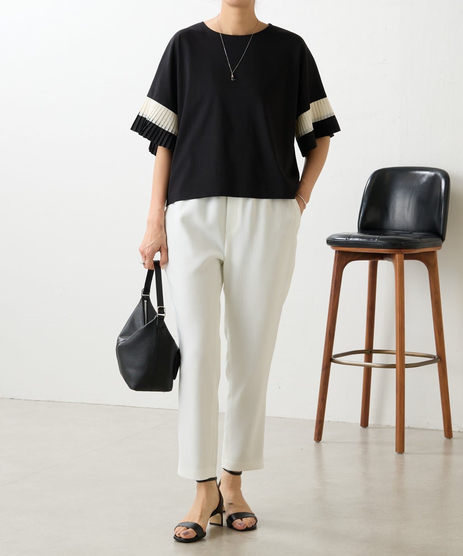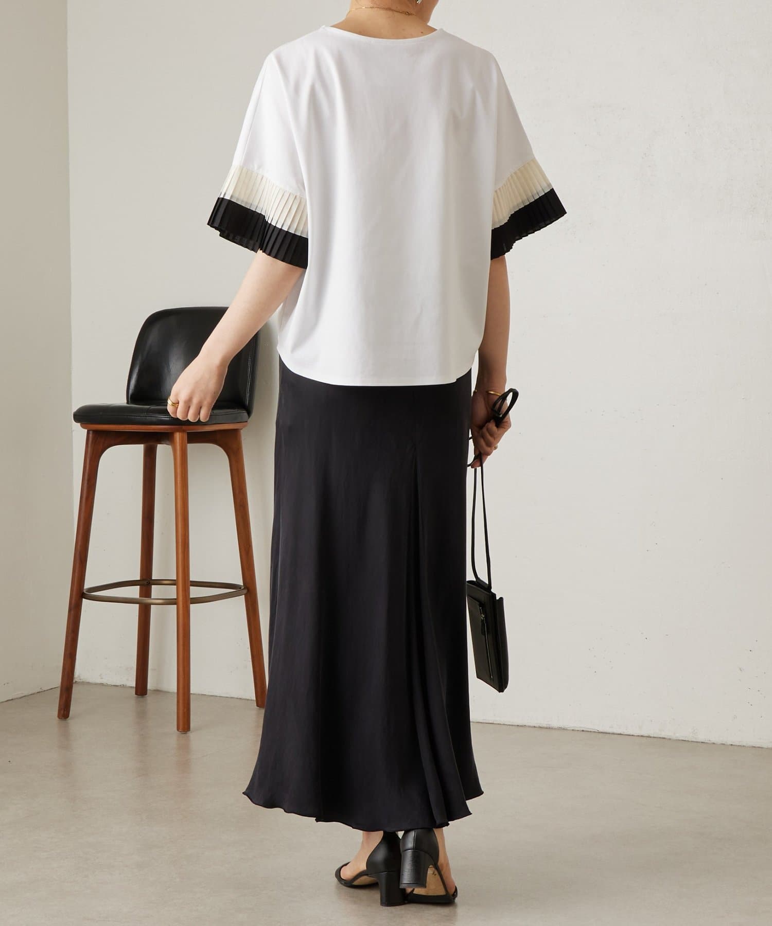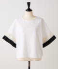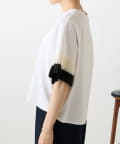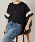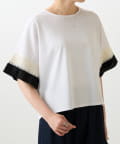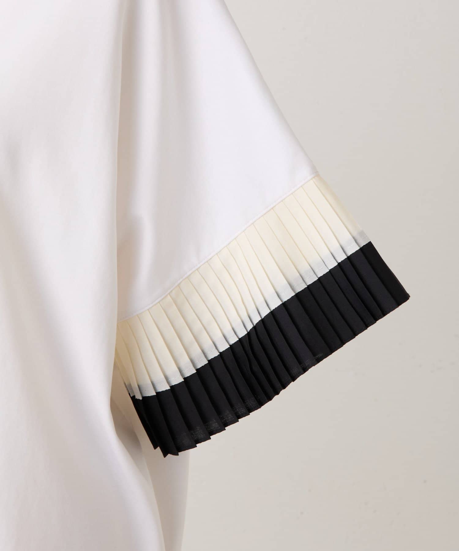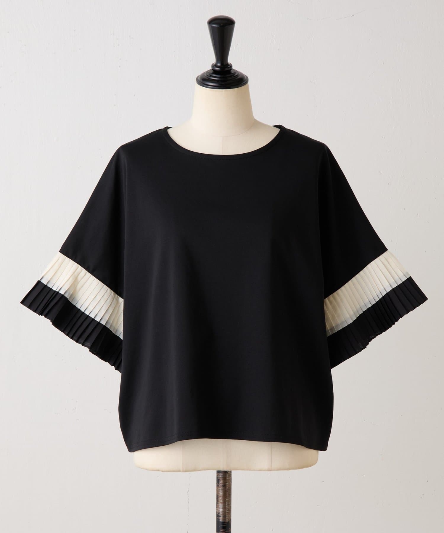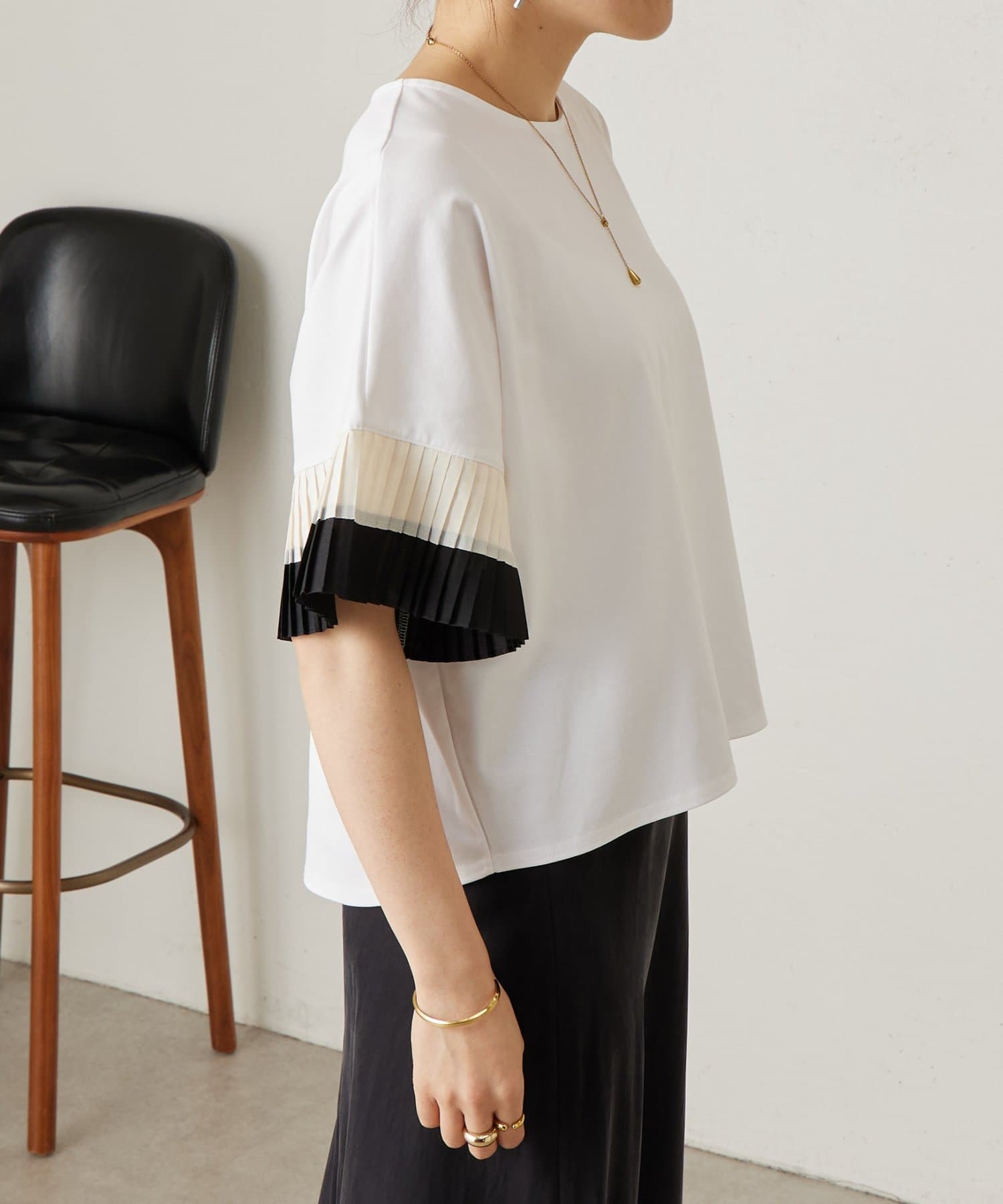 バイカラーのプリーツ生地を袖にあしらった、デザイン性のあるカットソー。