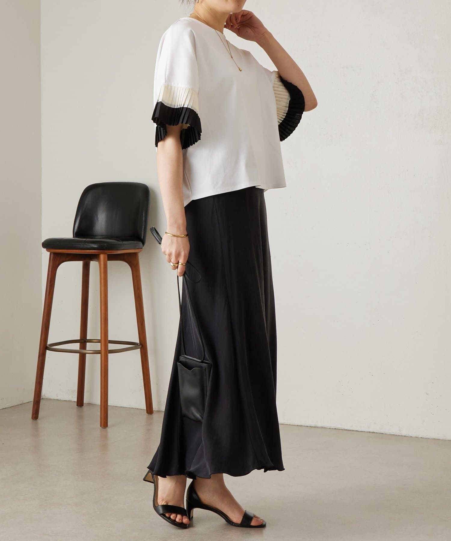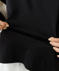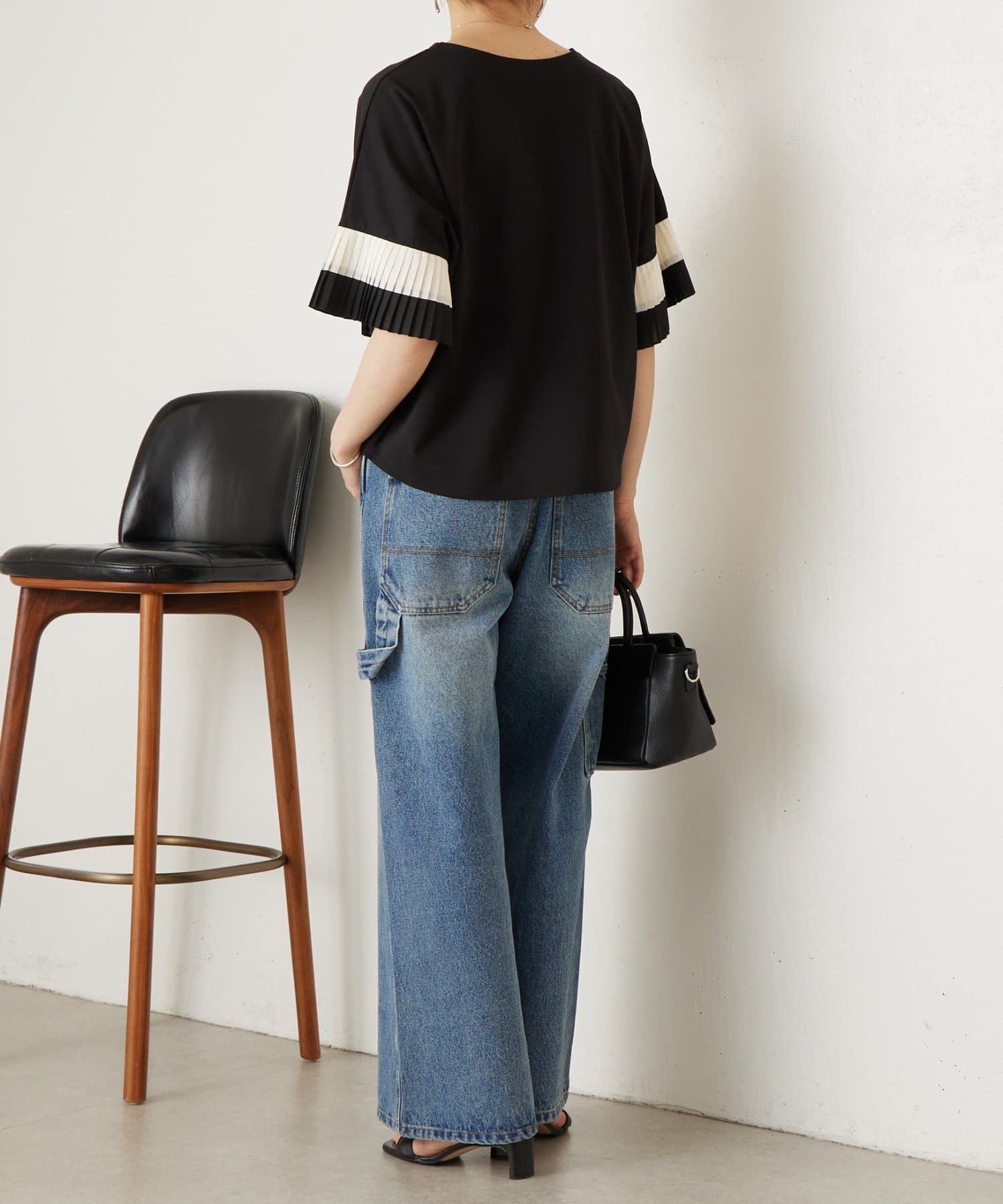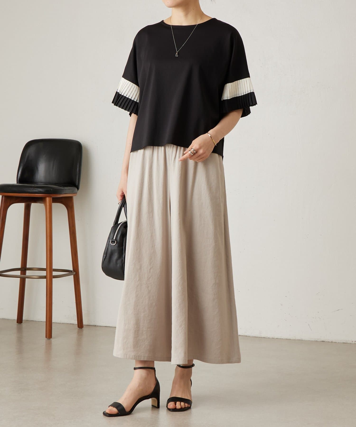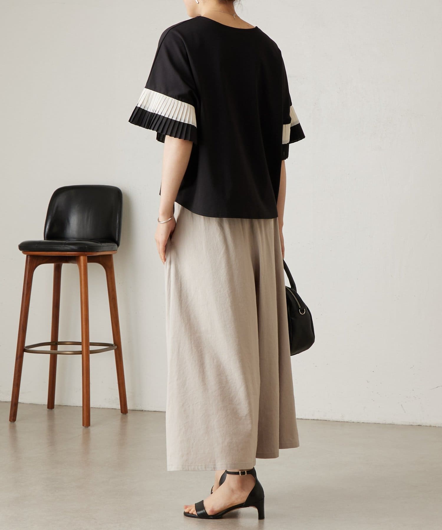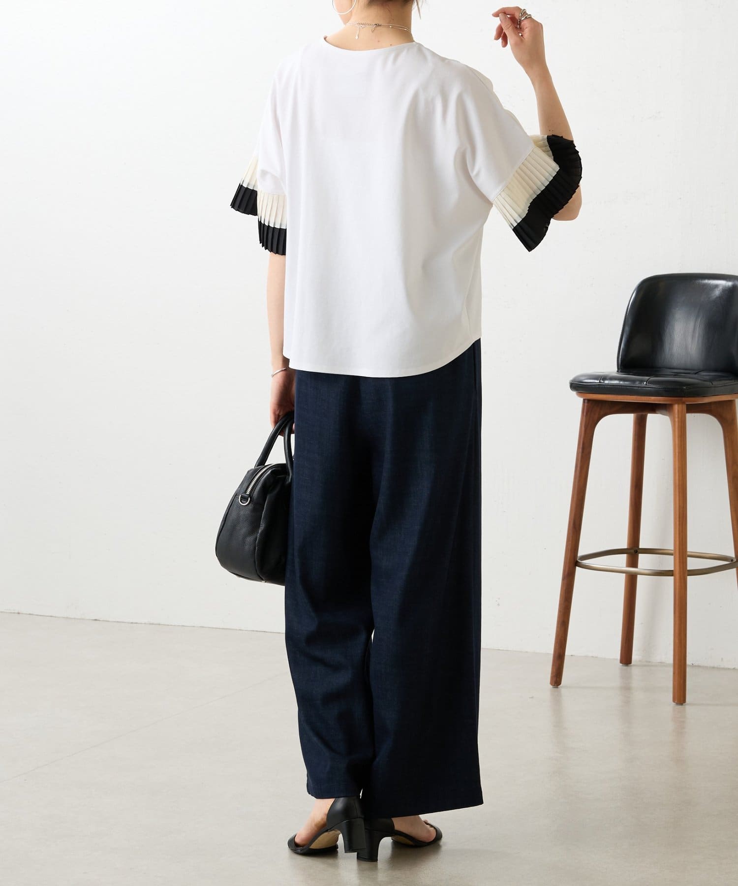 バイカラーのプリーツ生地を袖にあしらった、デザイン性のあるカットソー。