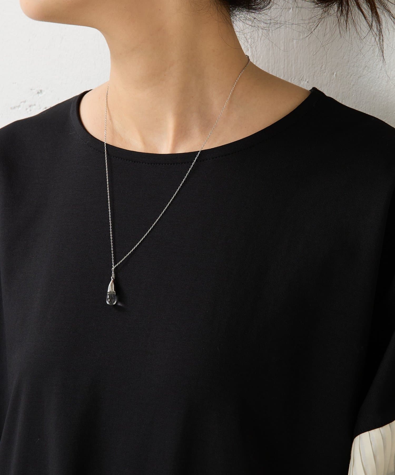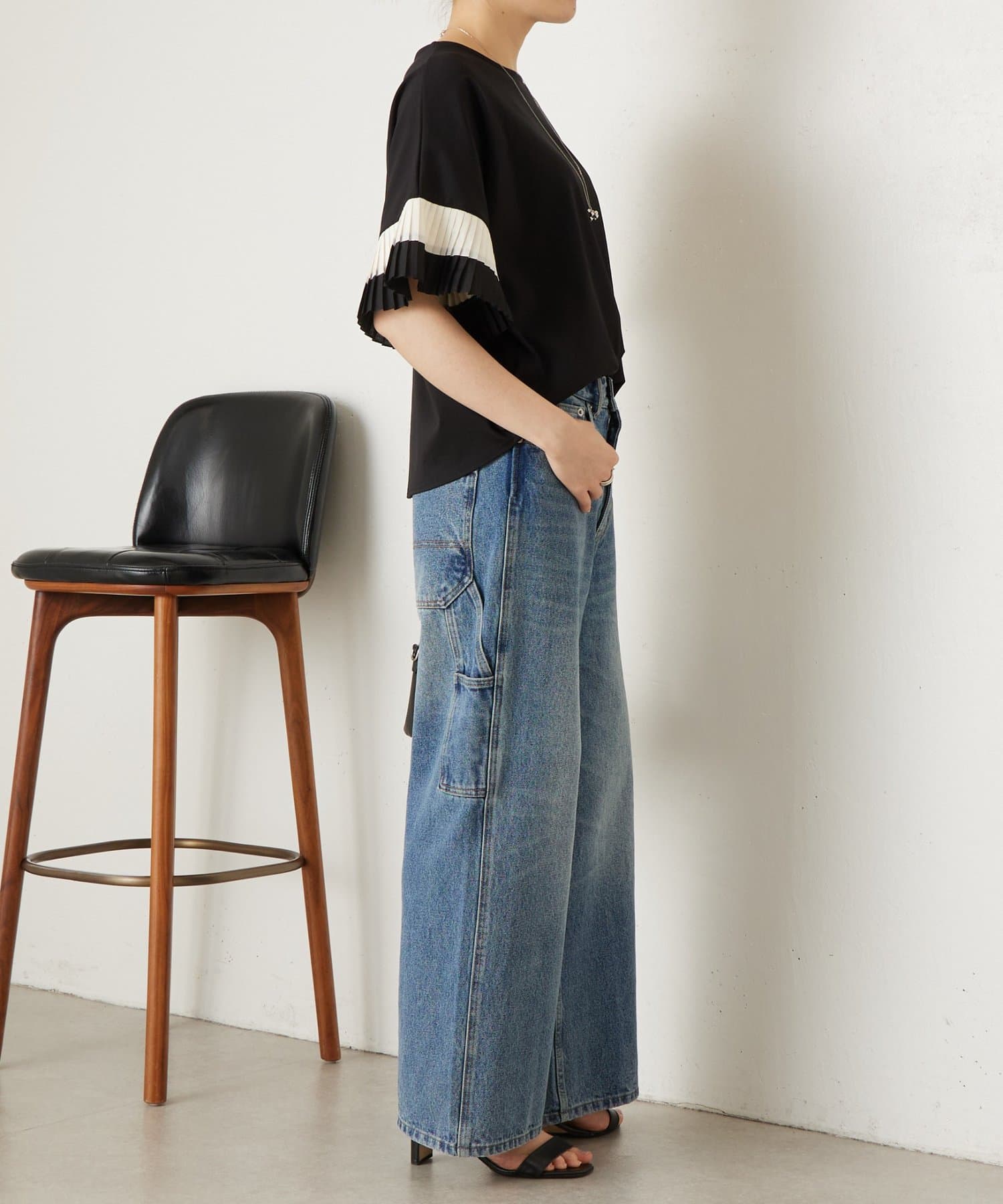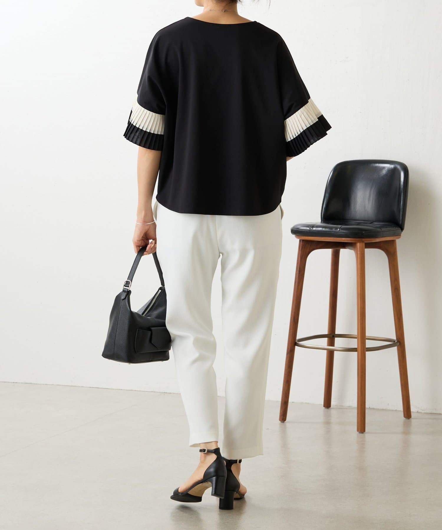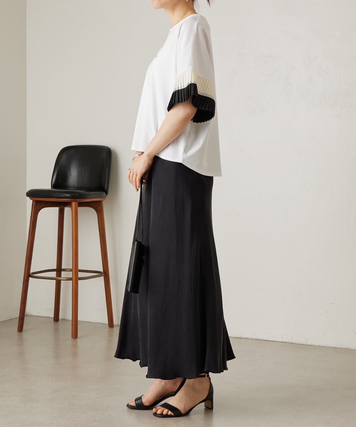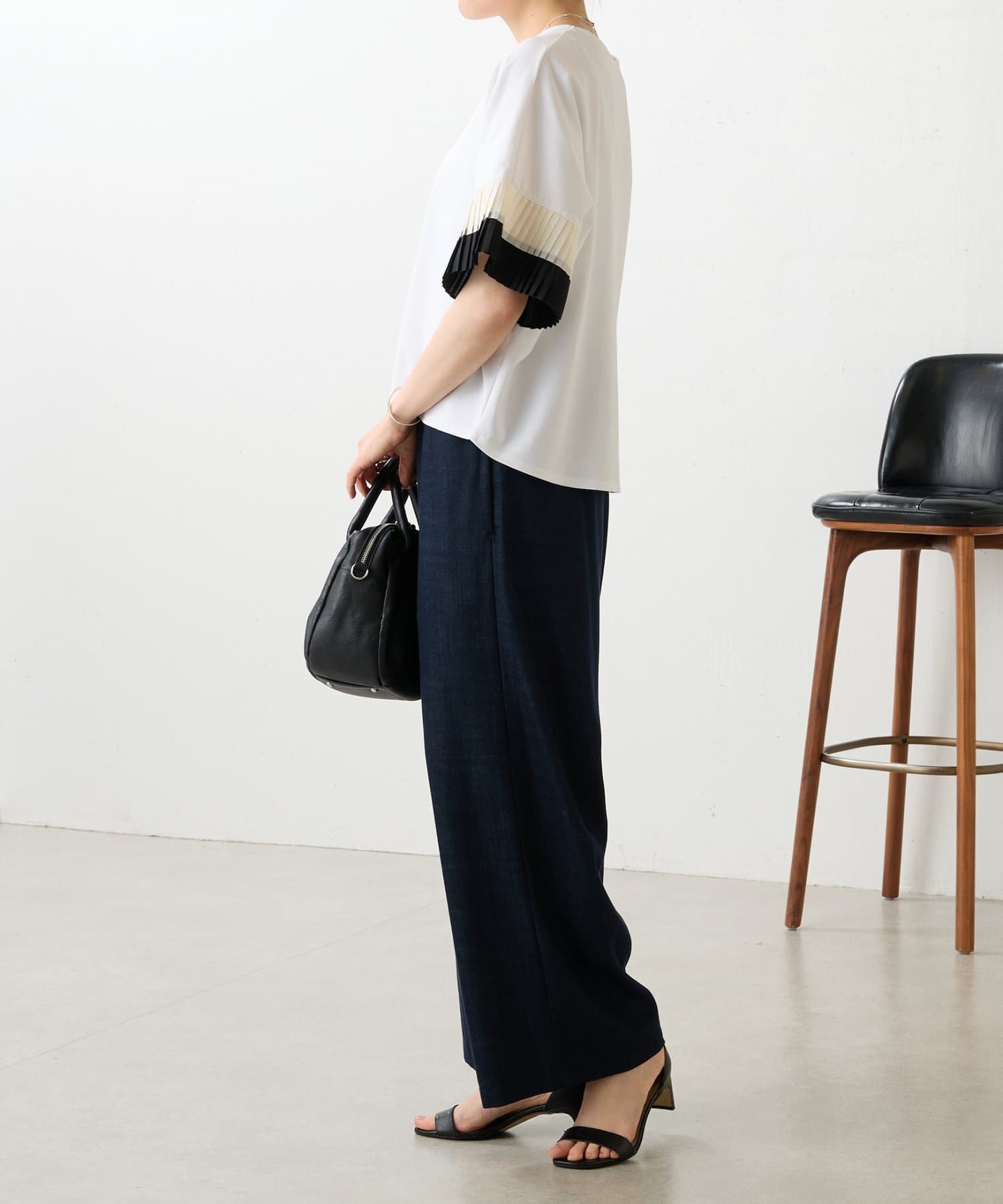 バイカラーのプリーツ生地を袖にあしらった、デザイン性のあるカットソー。