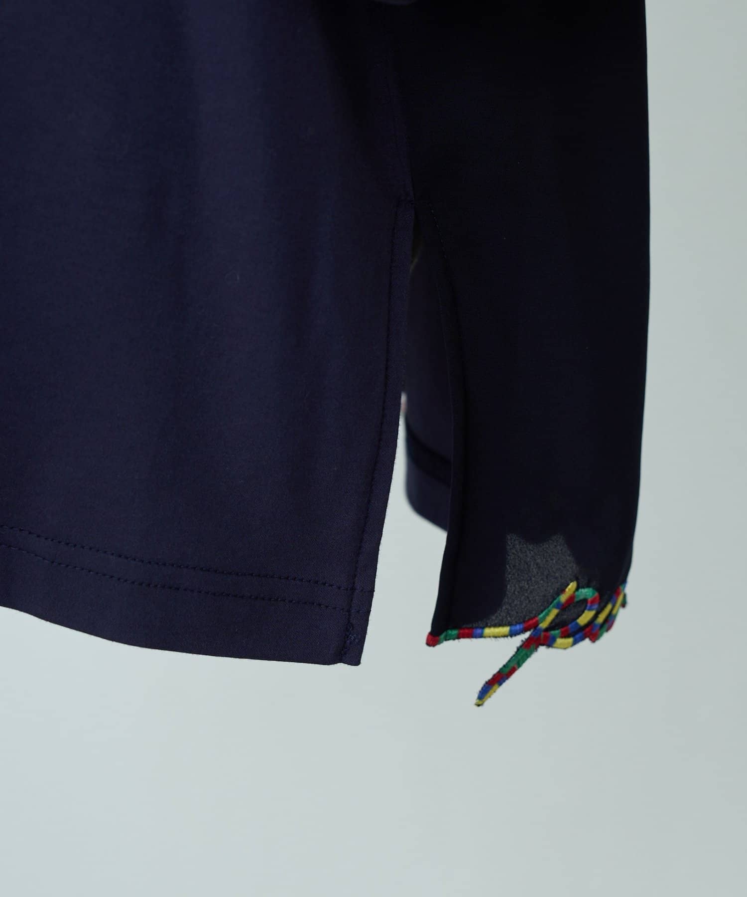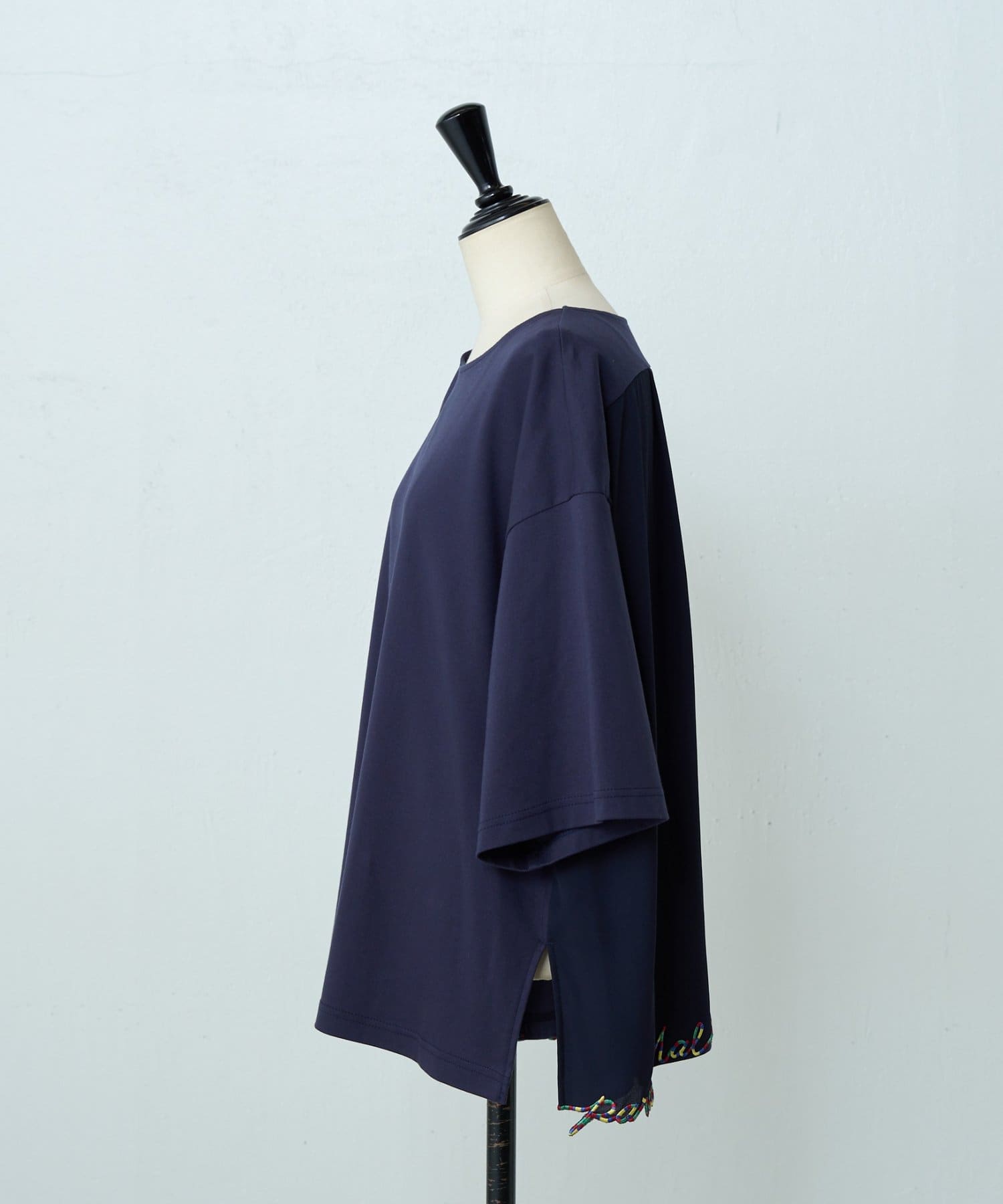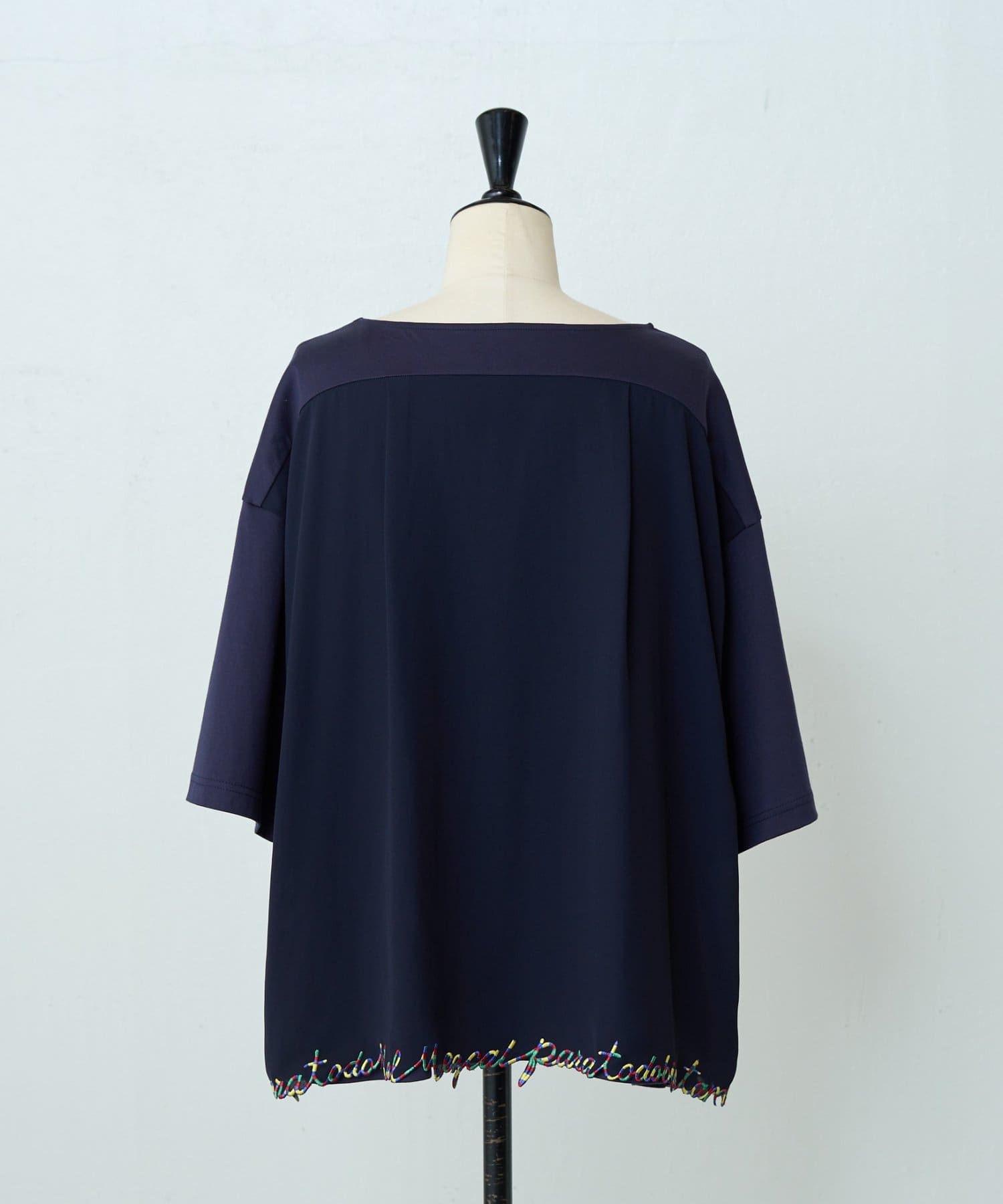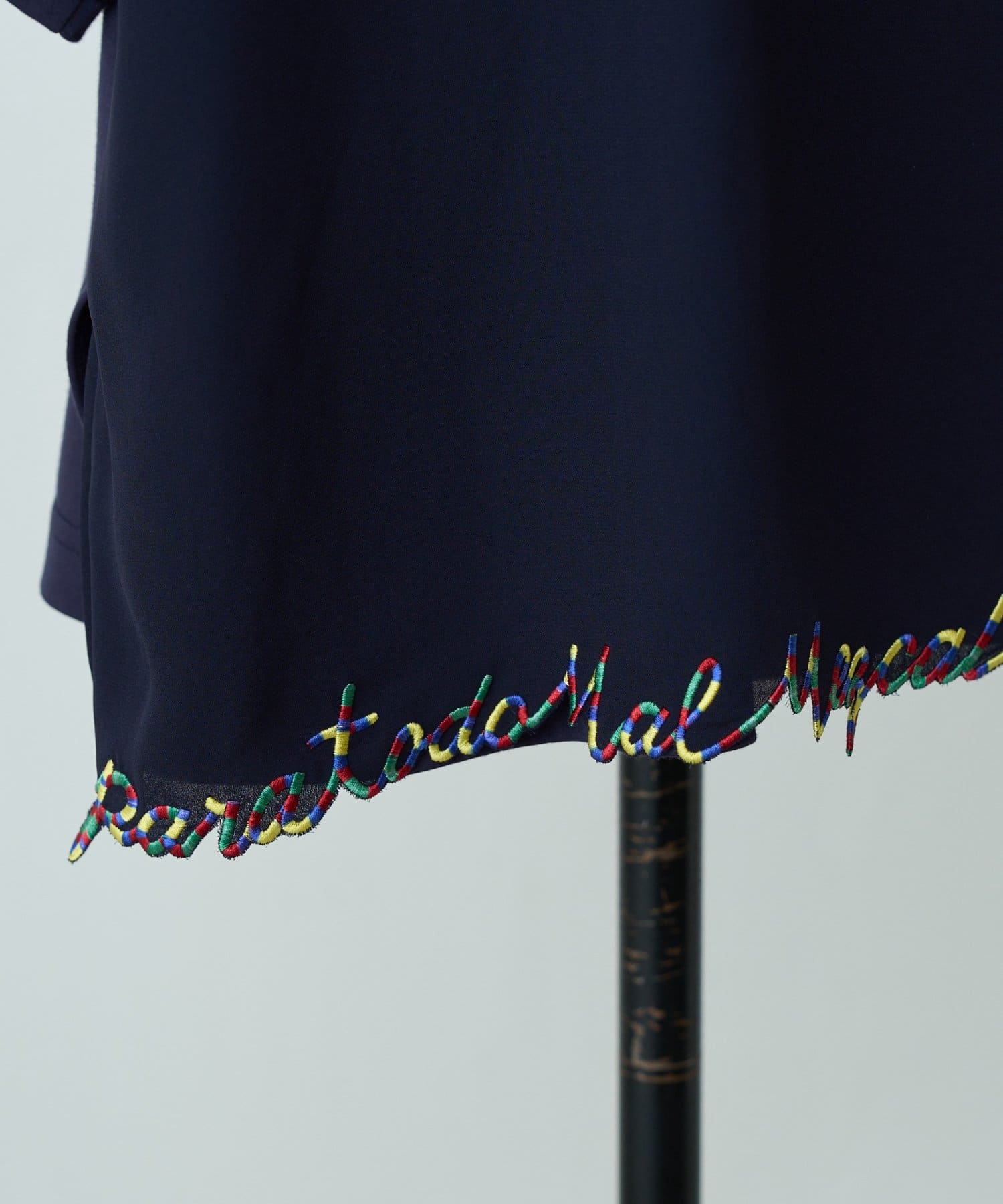 ポジティブなメッセージを、裾にカラフルな刺繍で施した一着。