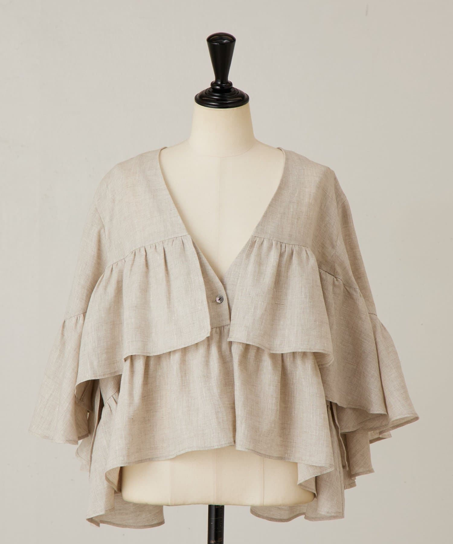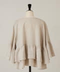 フロントからバックスタイル、袖へと続くひらりと揺れるフリルデザインがフェミニンな雰囲気に。