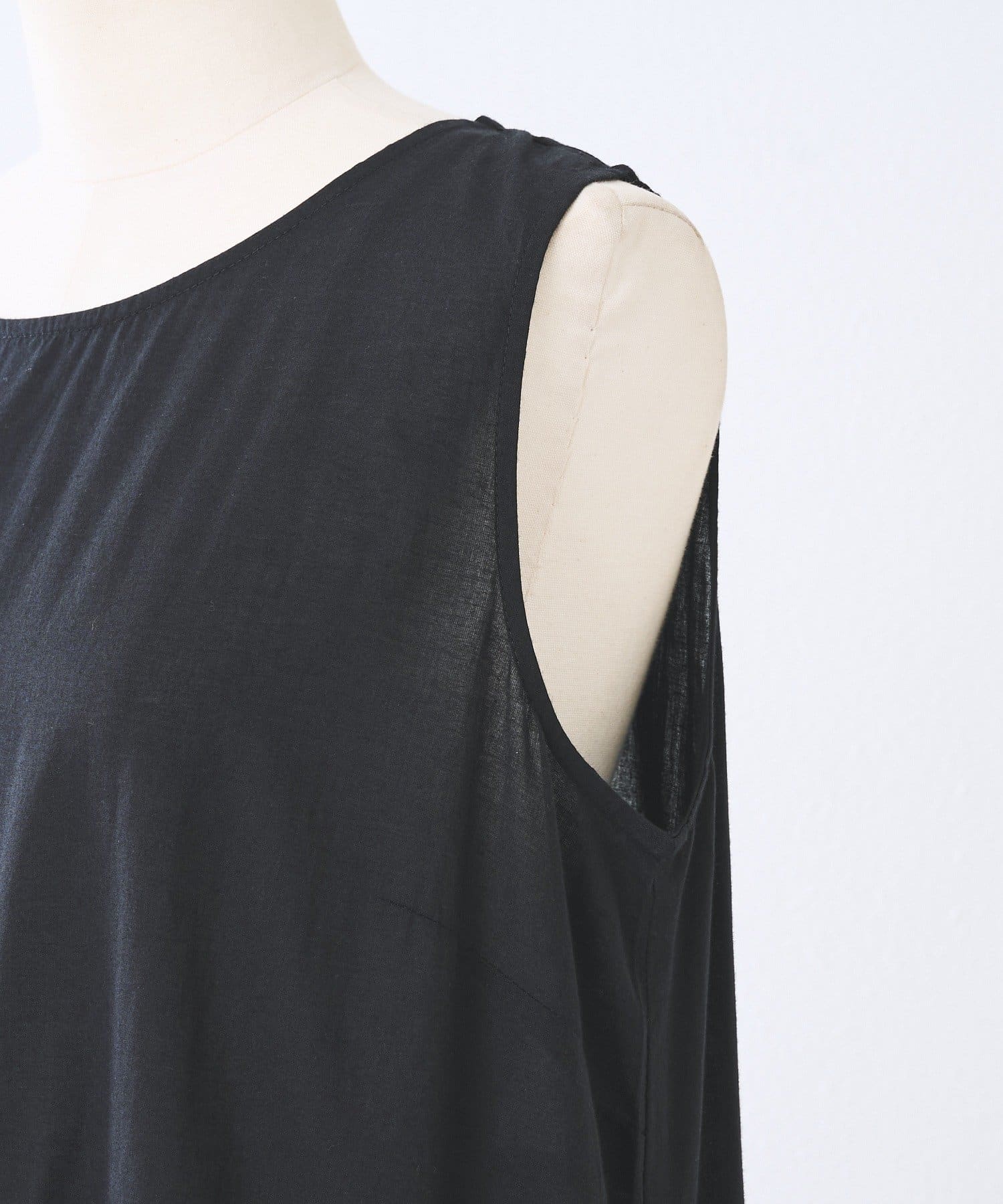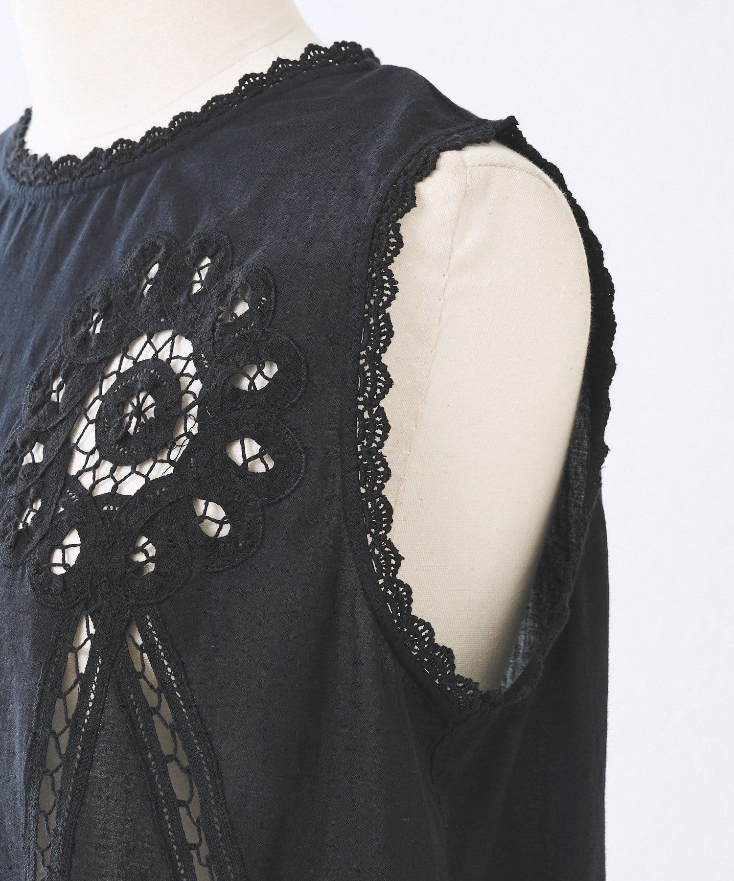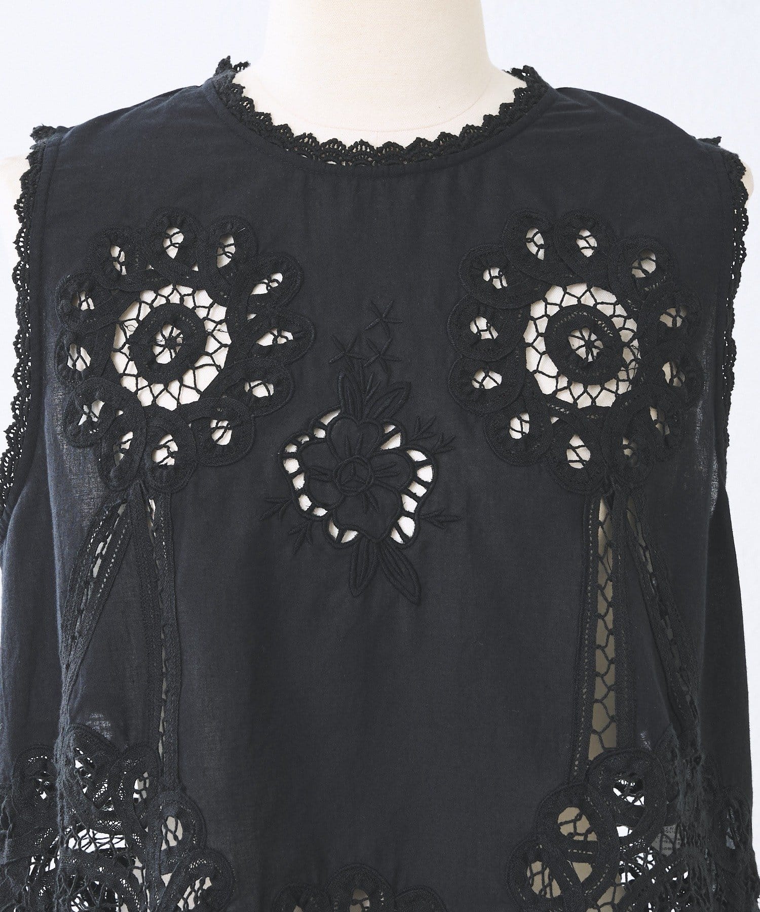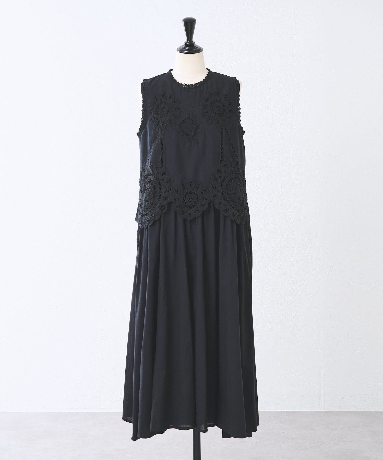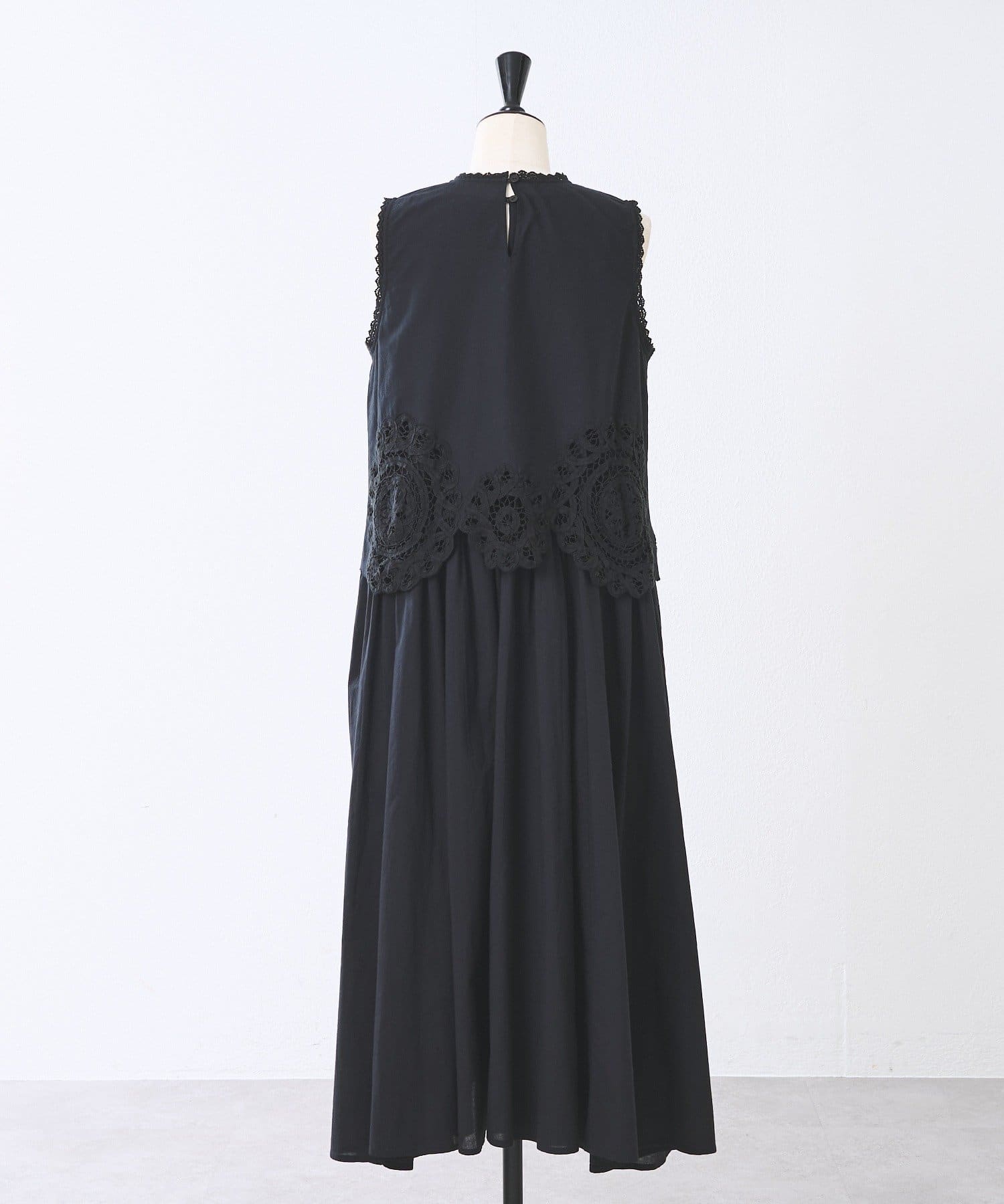 ノースリーブワンピースに、バテンレースブラウスをレイヤードしたアンサンブルアイテム。