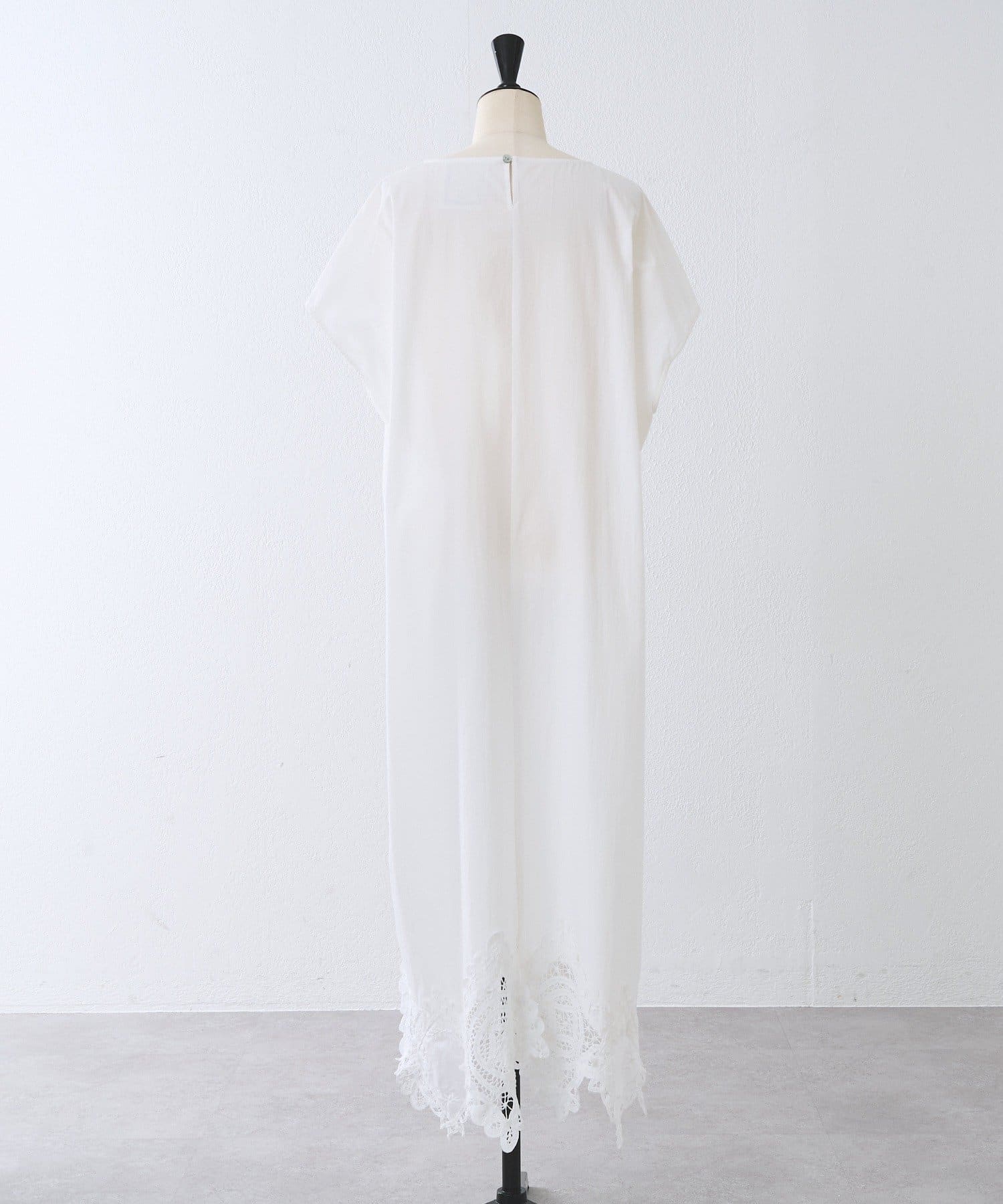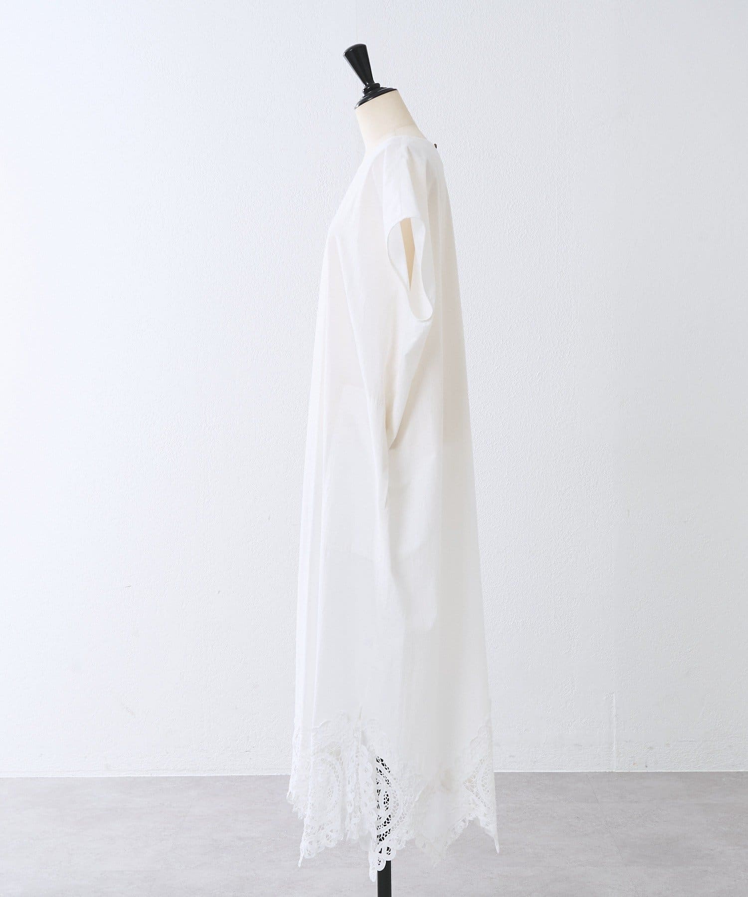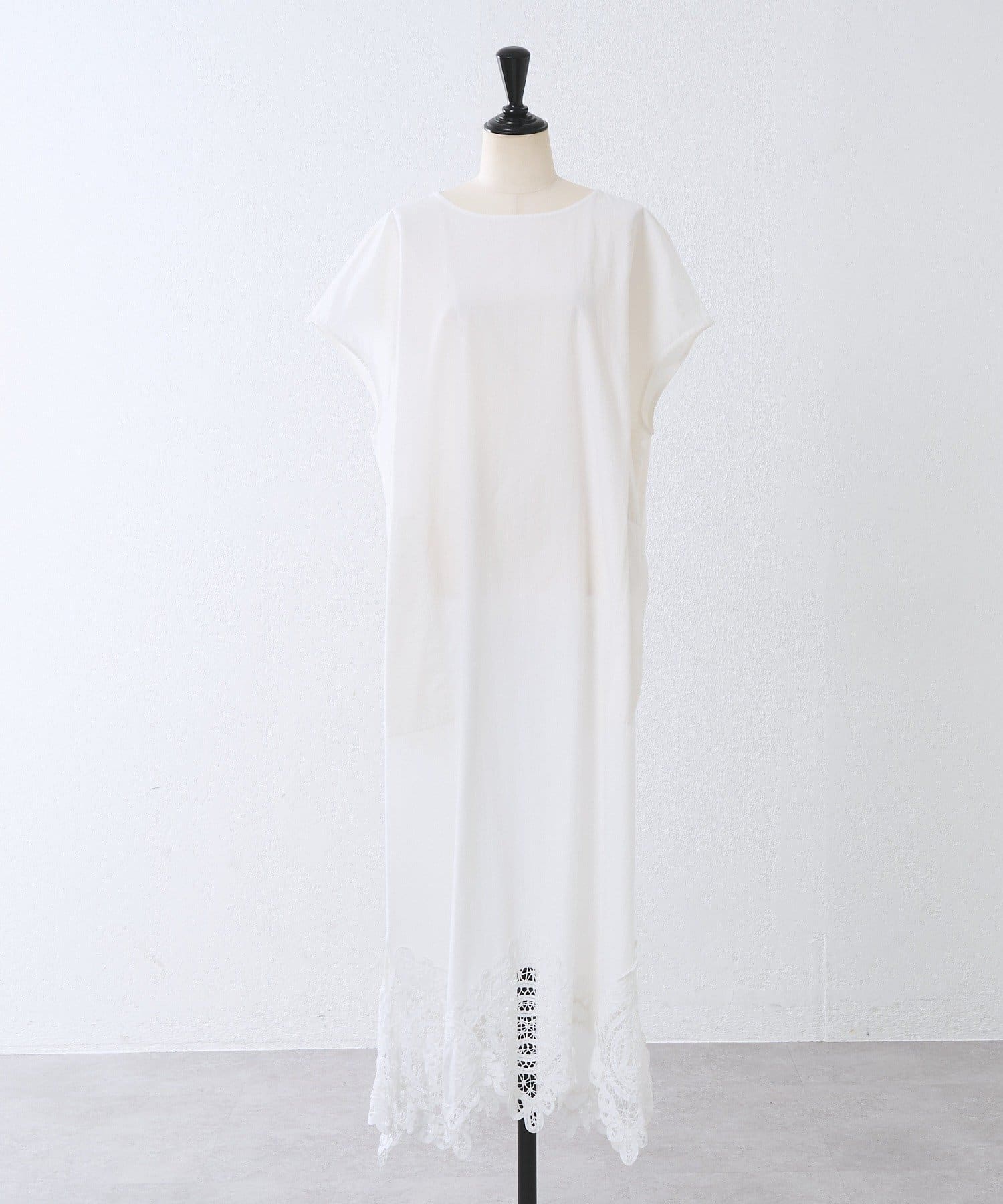 裾にあしらったバテンレースがアクセントになった、シンプルながら一枚で華やかに決まるワンピース。