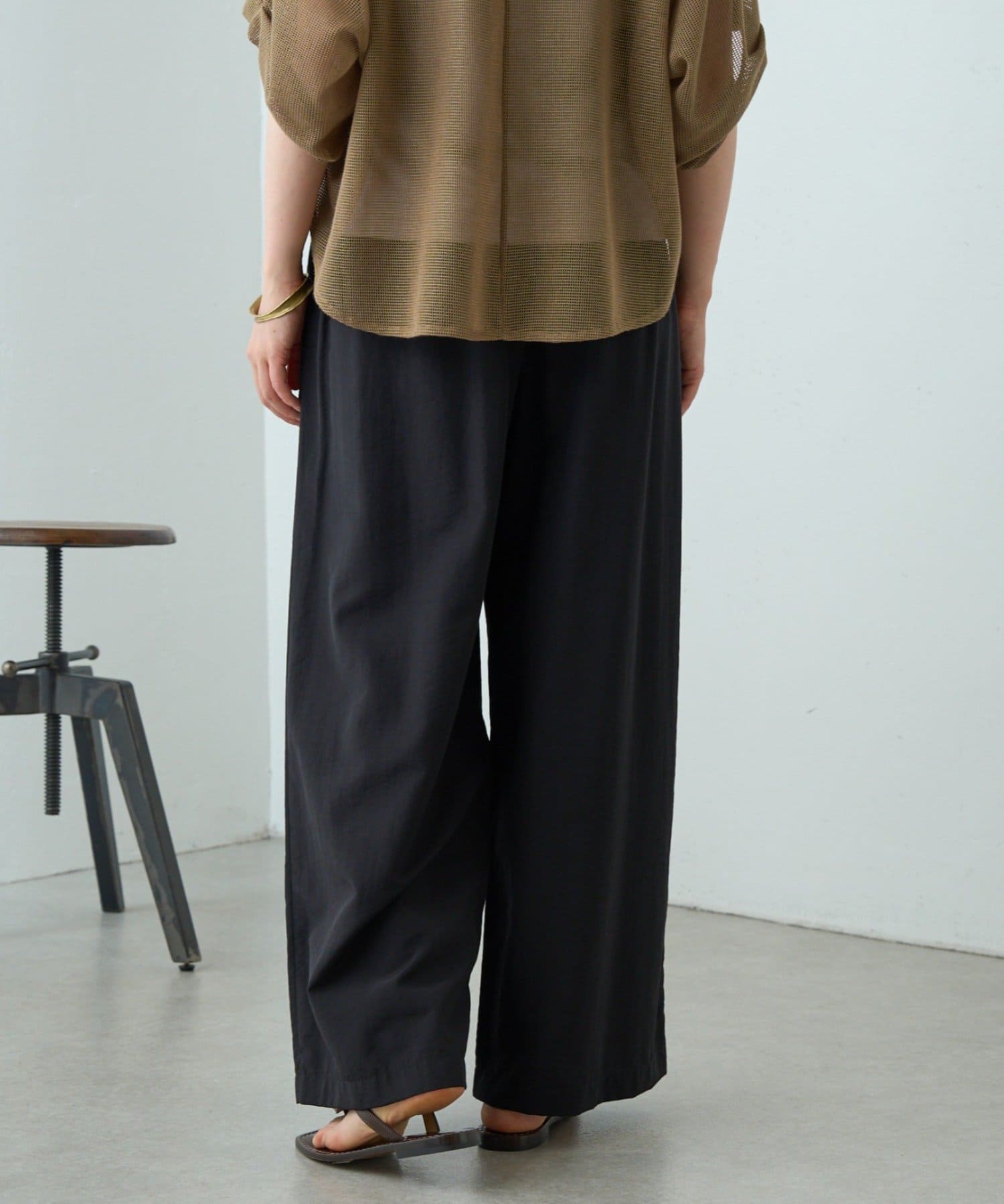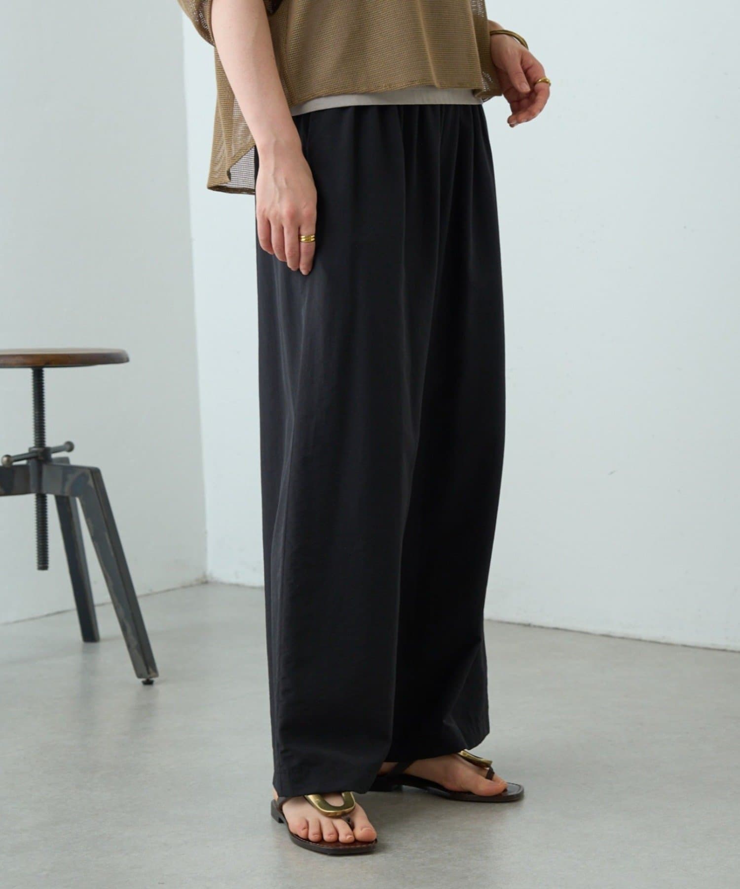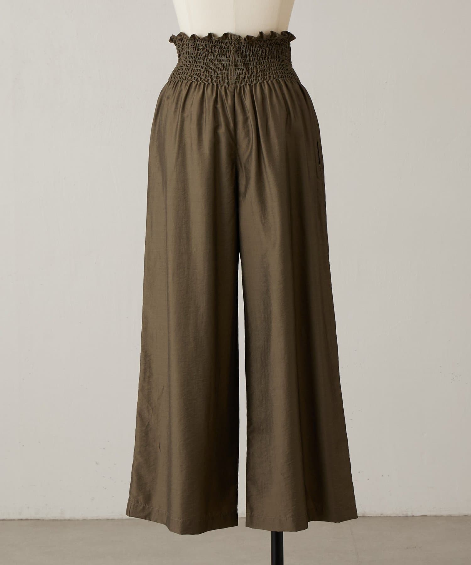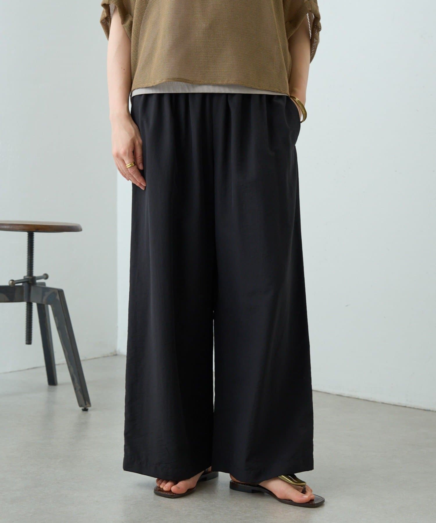 ウエストにシャーリング加工を施した、ストレスフリーな穿き心地のワイドパンツ。