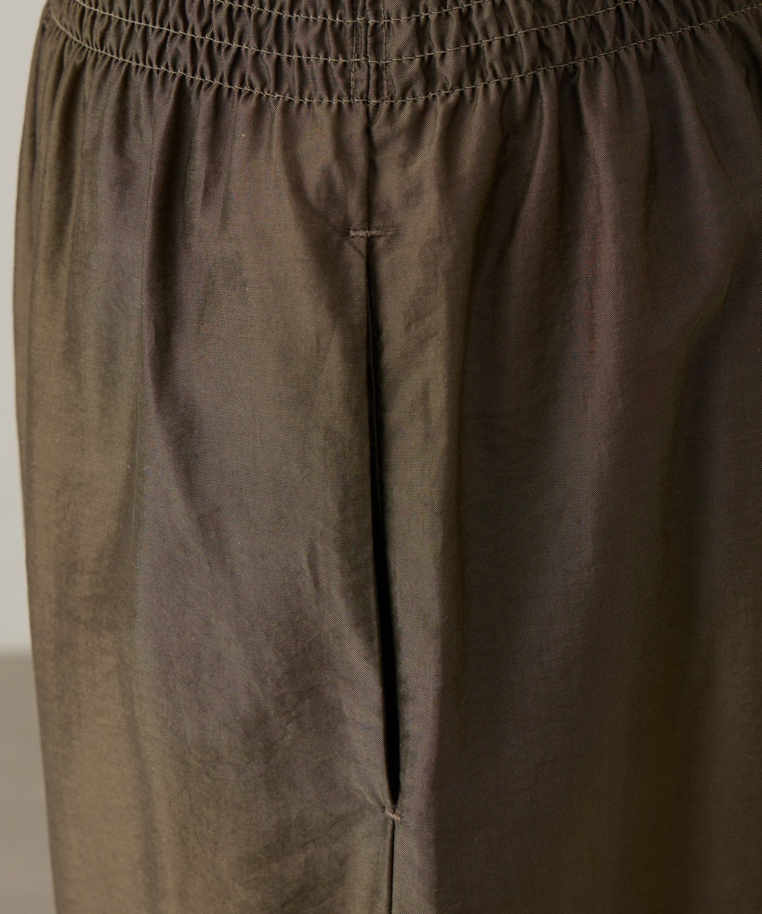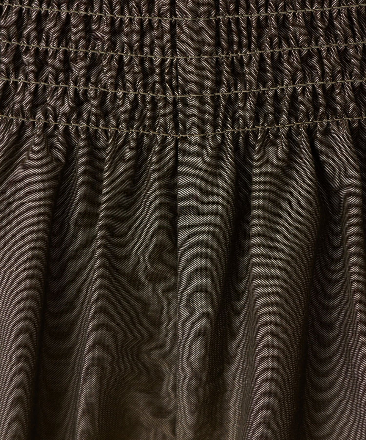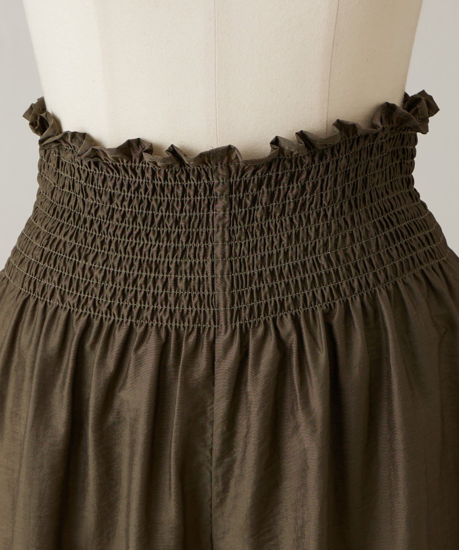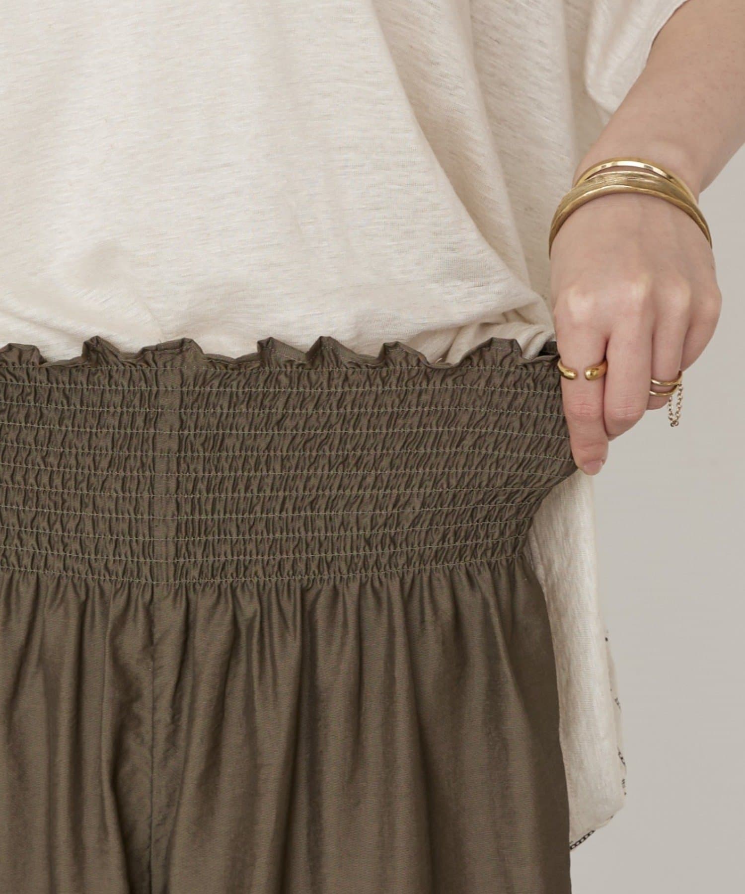 たっぷりと寄せたギャザーが生み出すゆとりのあるシルエットで、ヒップや脚のラインを自然にカバー。