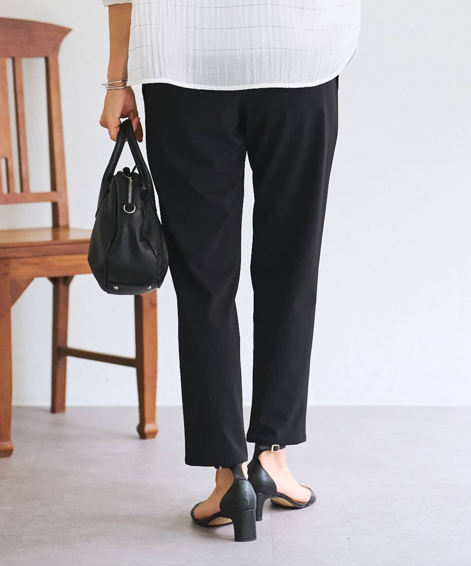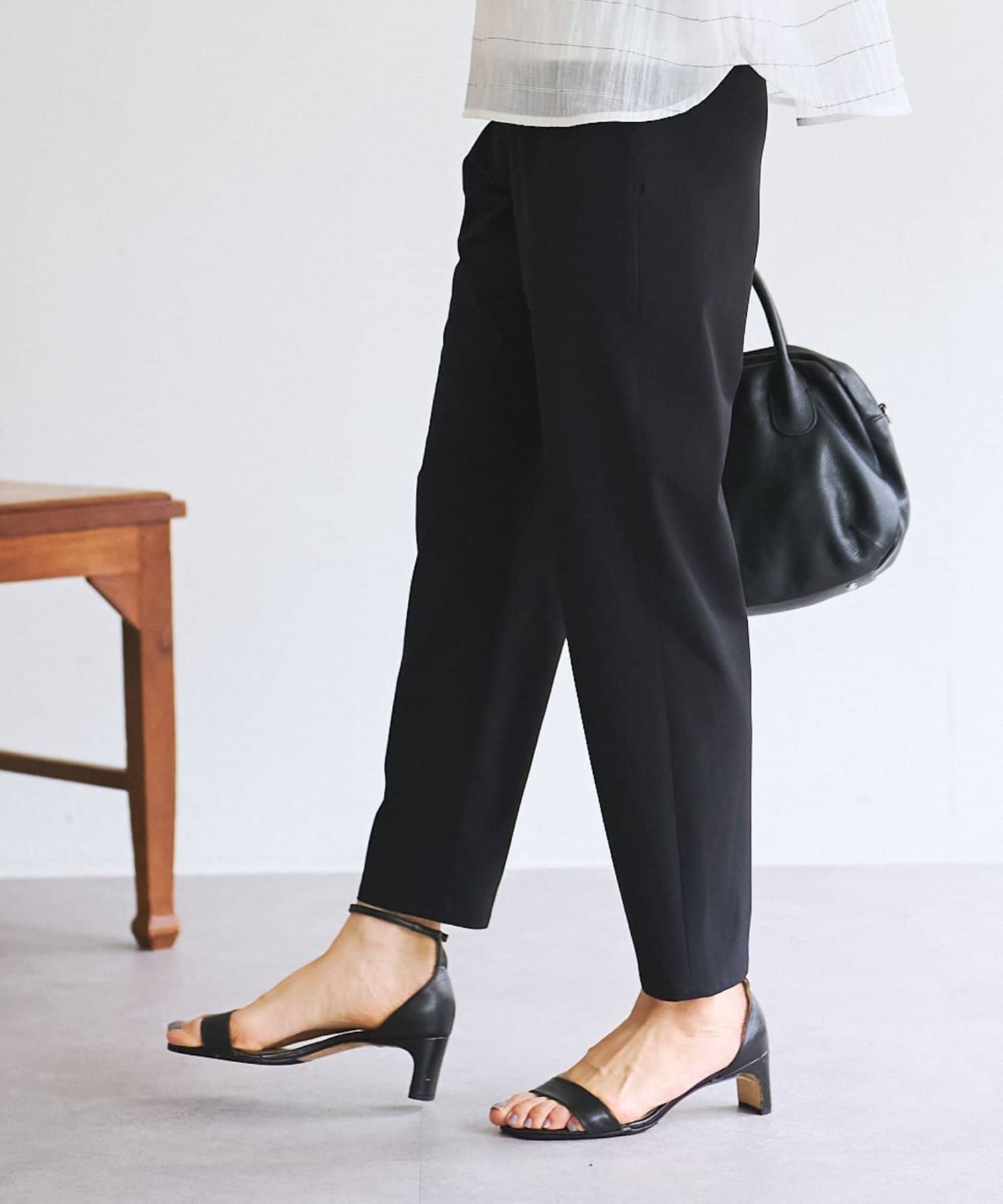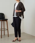 裾に向かってすっきりシルエットのテーパードパンツ。