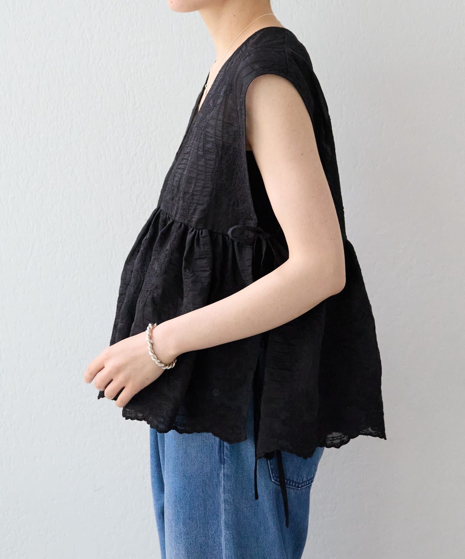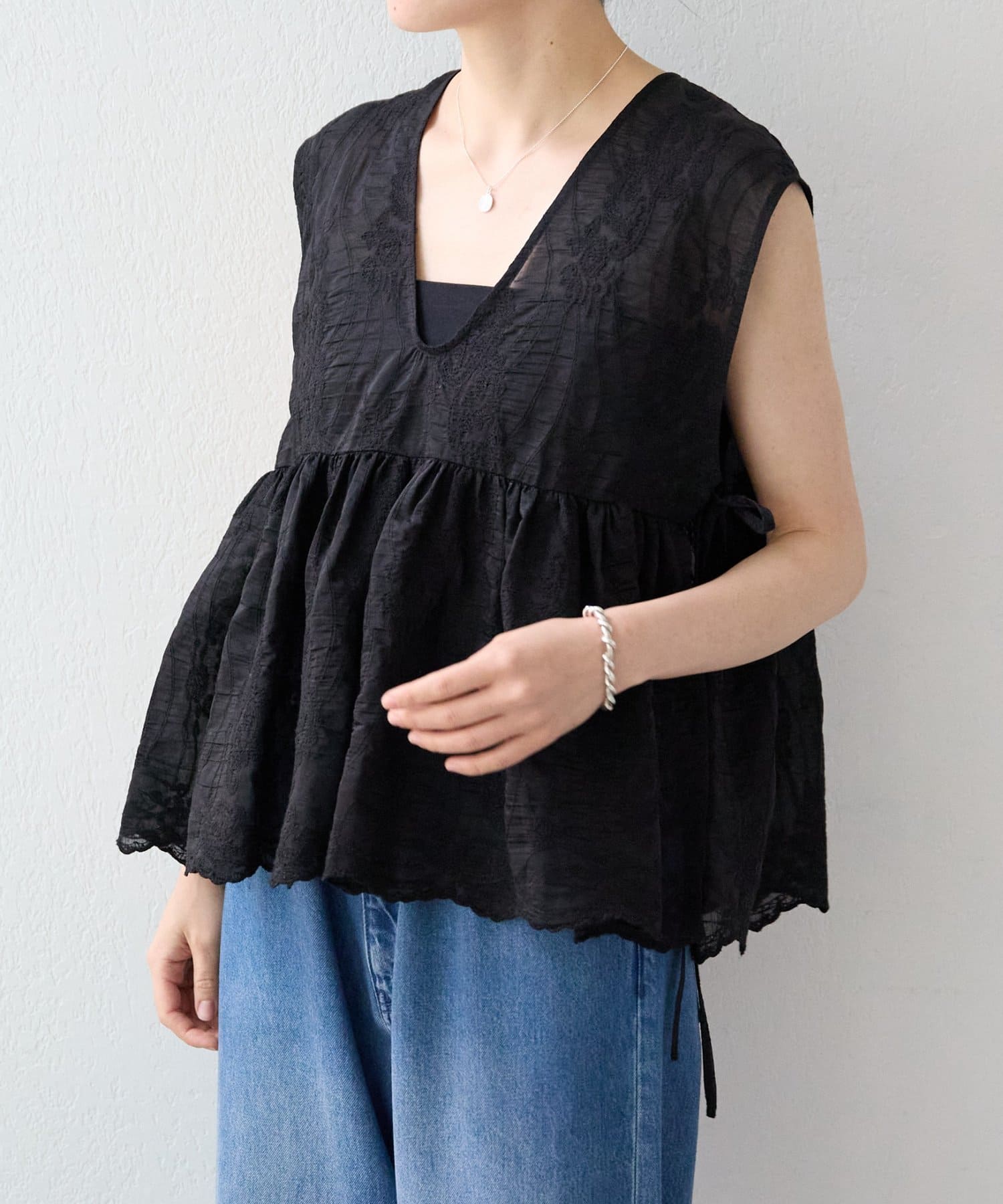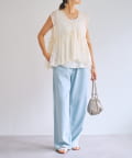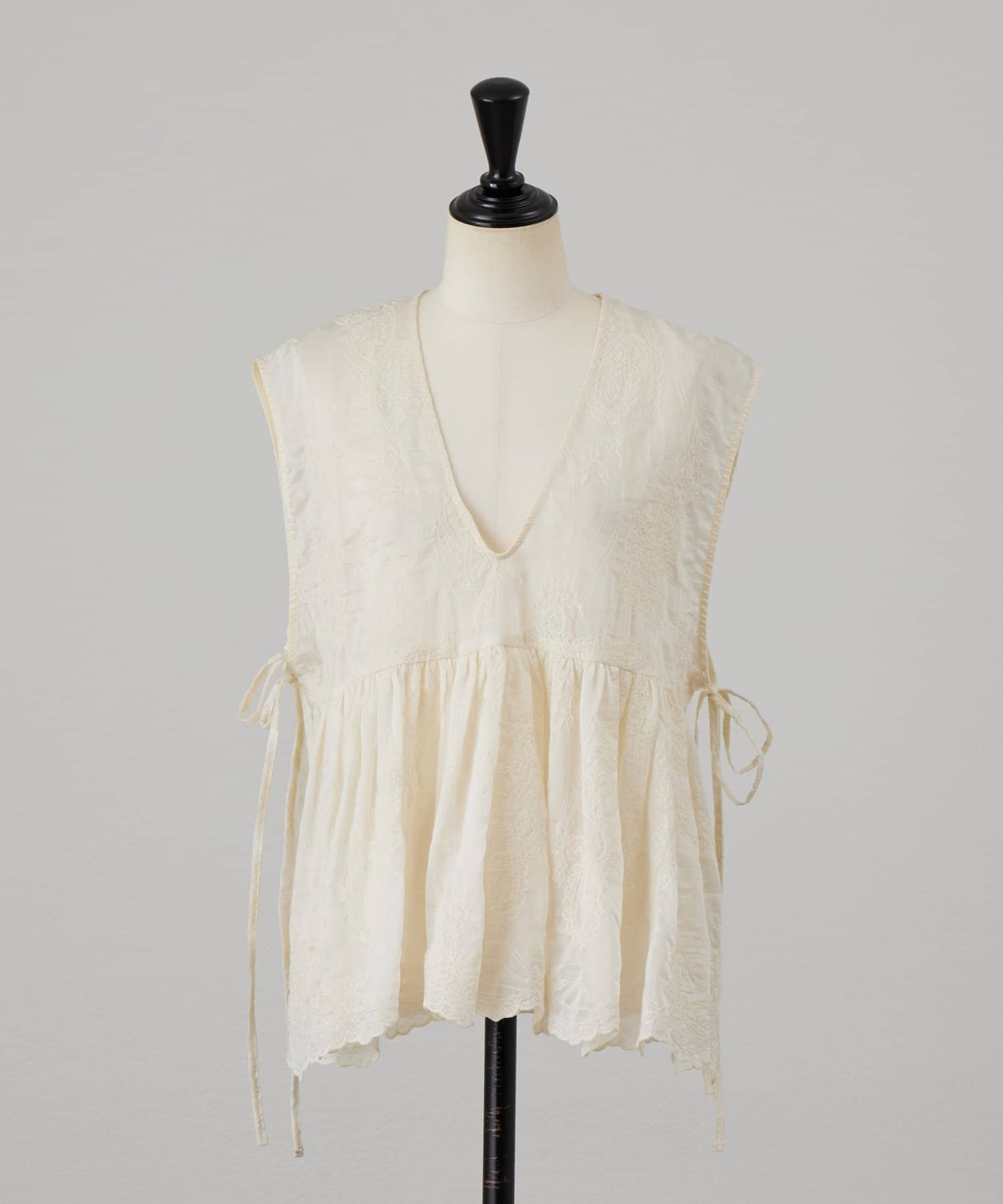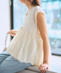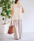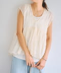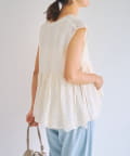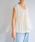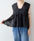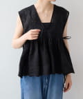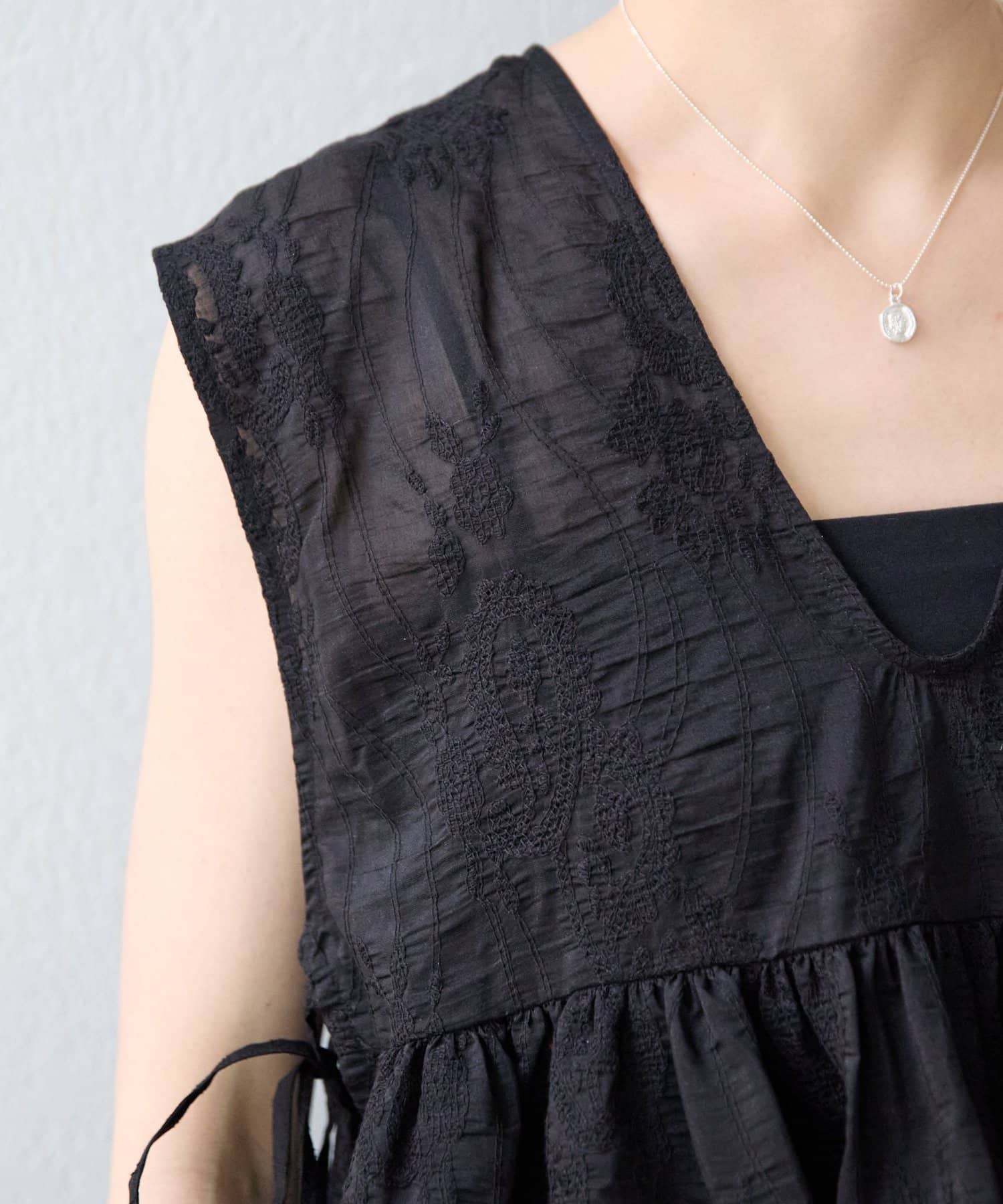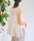 繊細なペイズリー柄をミシンステッチで描いた、印象的なノースリーブブラウス。