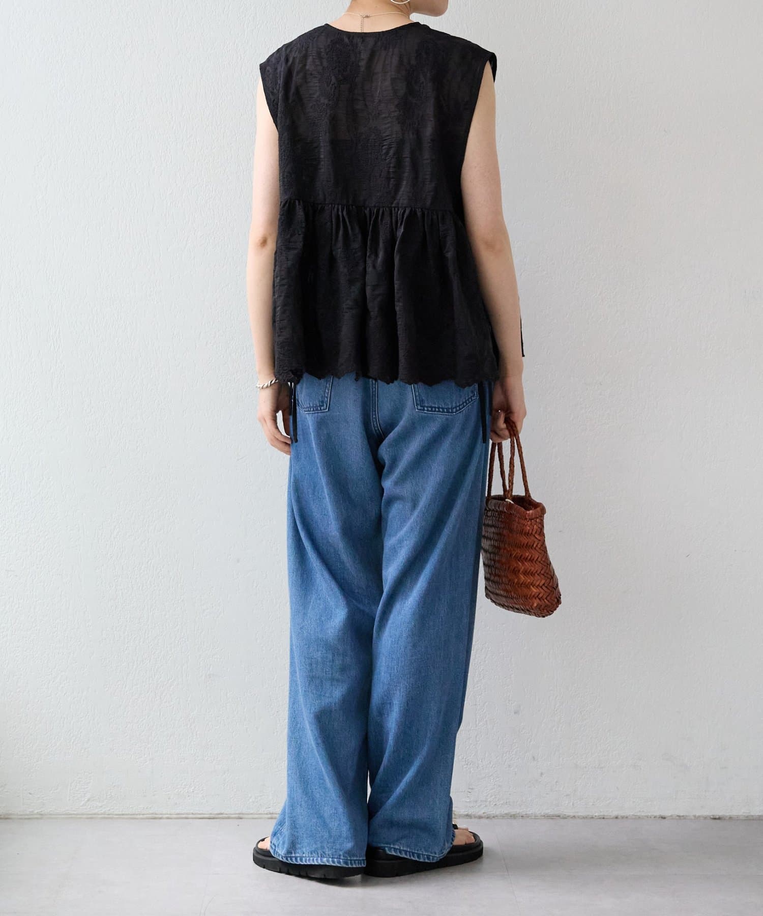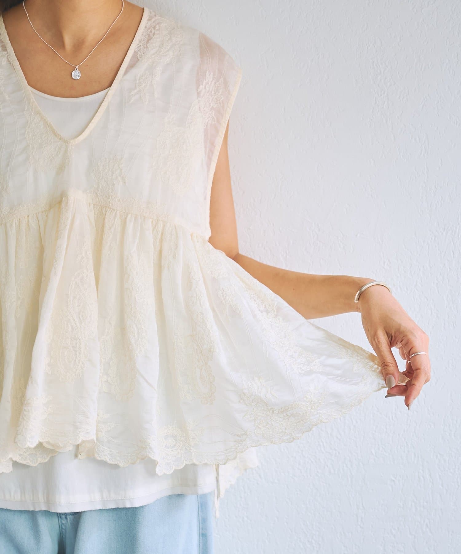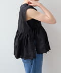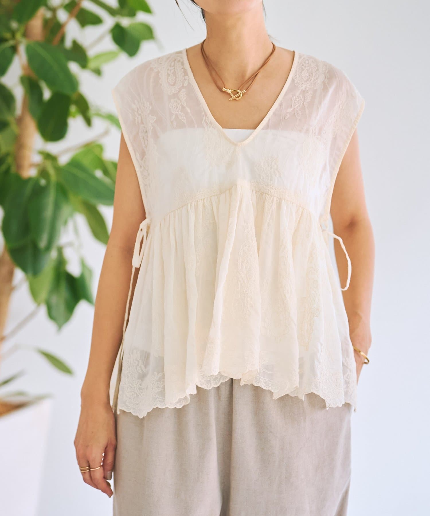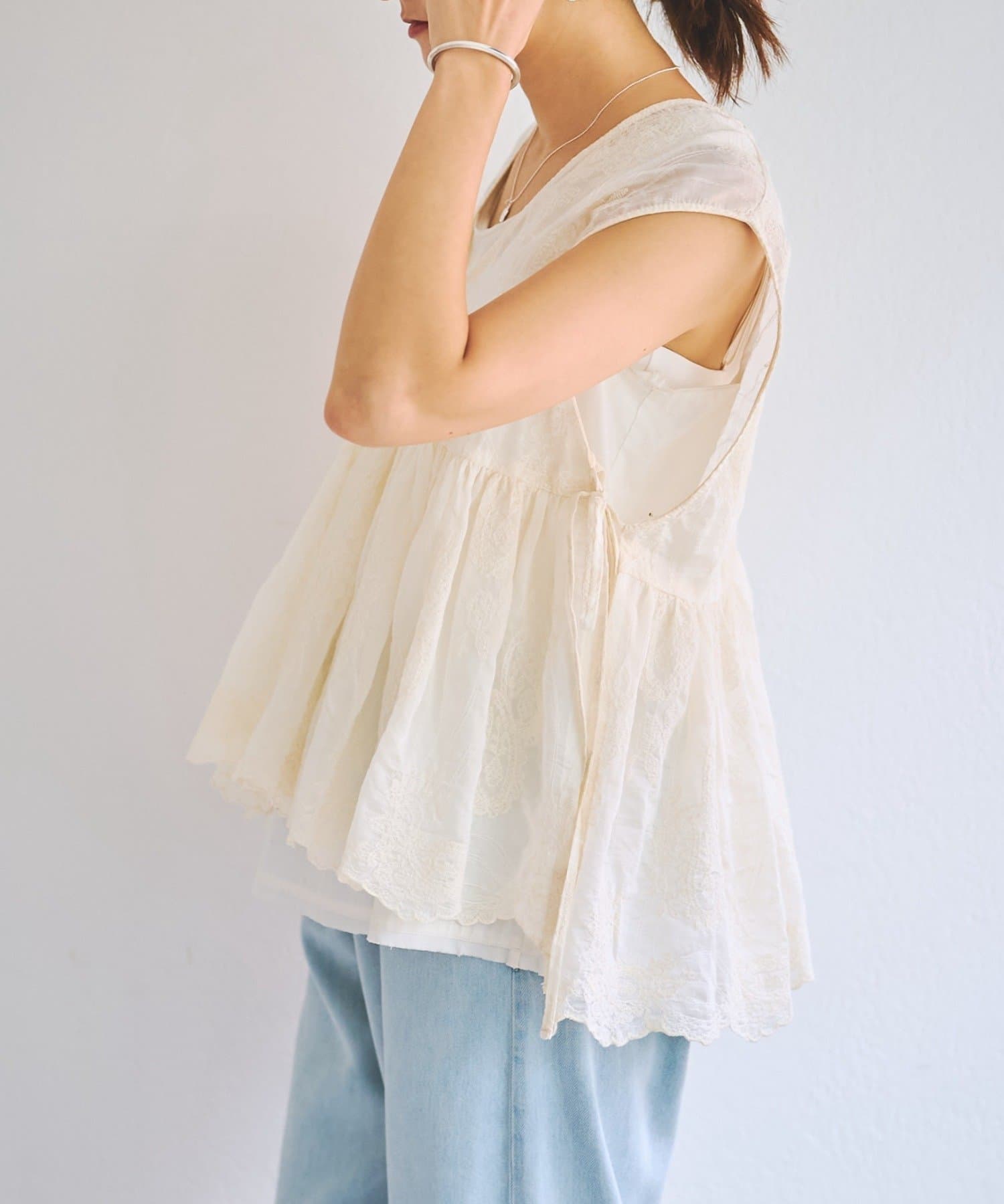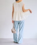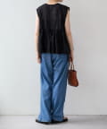 繊細なペイズリー柄をミシンステッチで描いた、印象的なノースリーブブラウス。