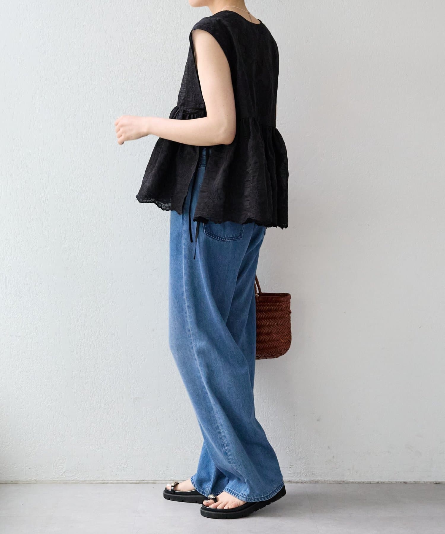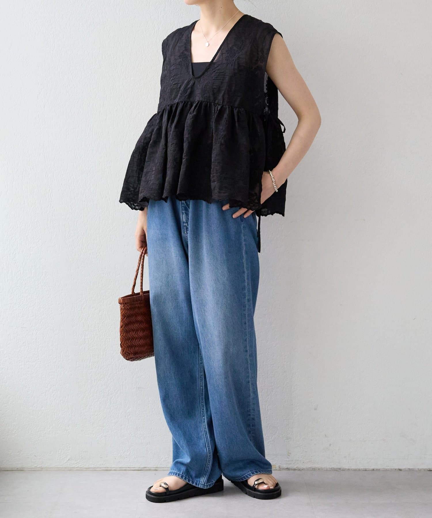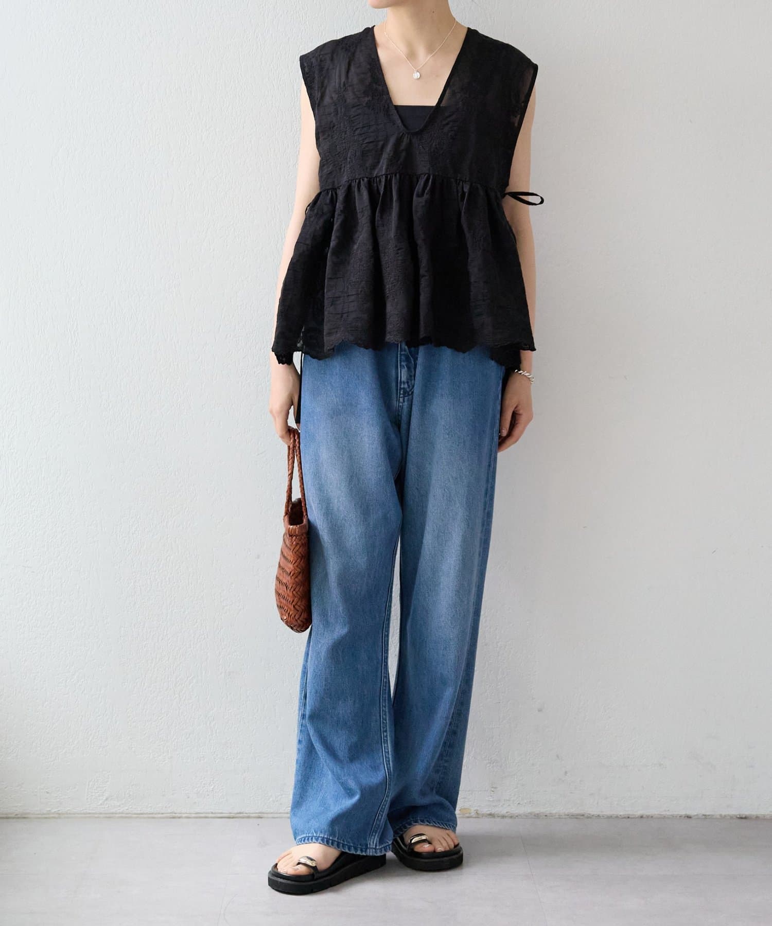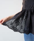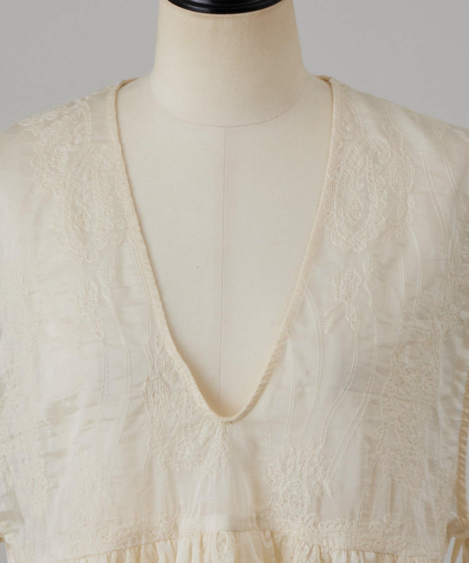 繊細なペイズリー柄をミシンステッチで描いた、印象的なノースリーブブラウス。