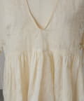 衿元はVネックですっきりと見せつつ、フロントはウエスト部分の切り替えからギャザーをたっぷりと入れています。