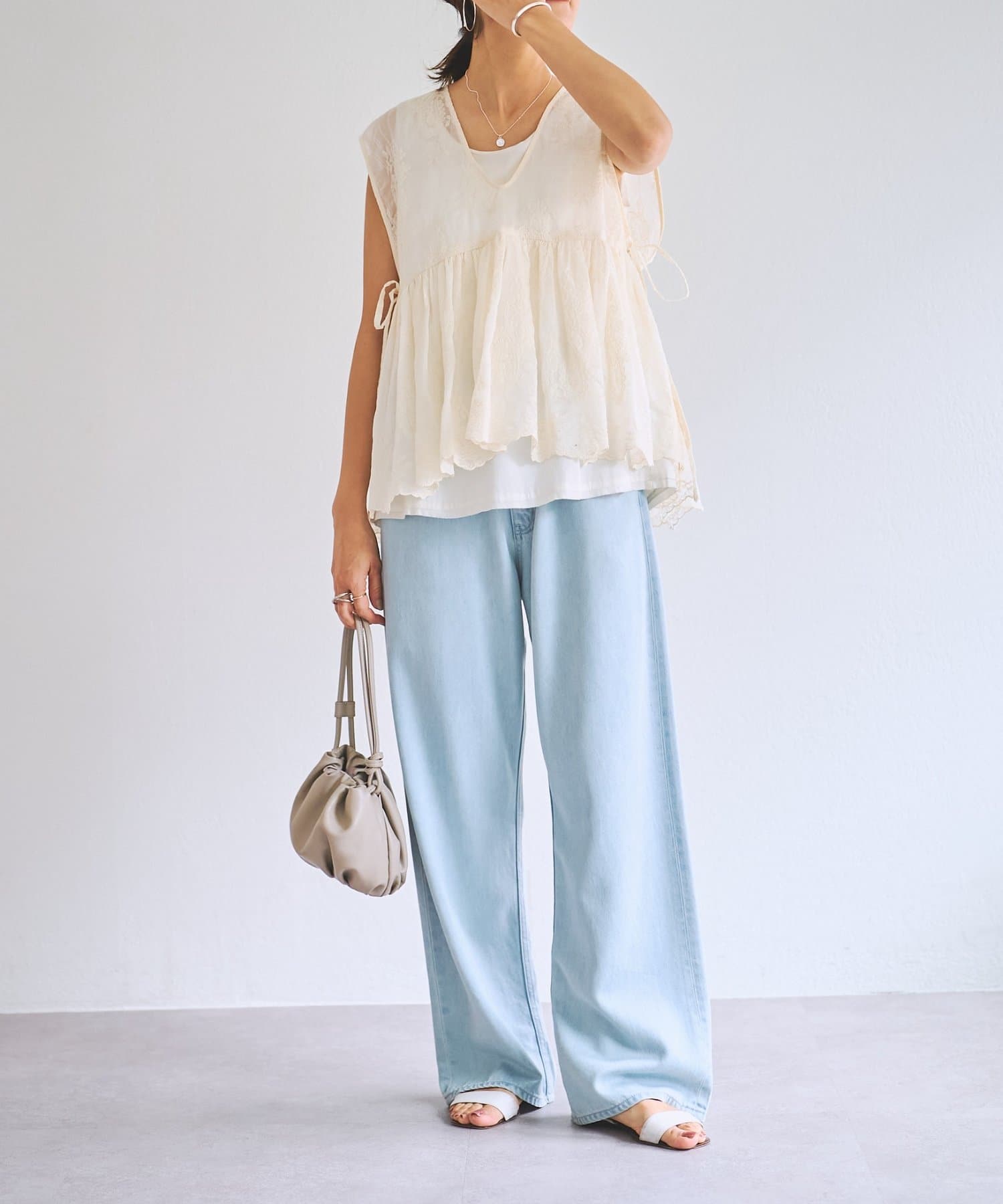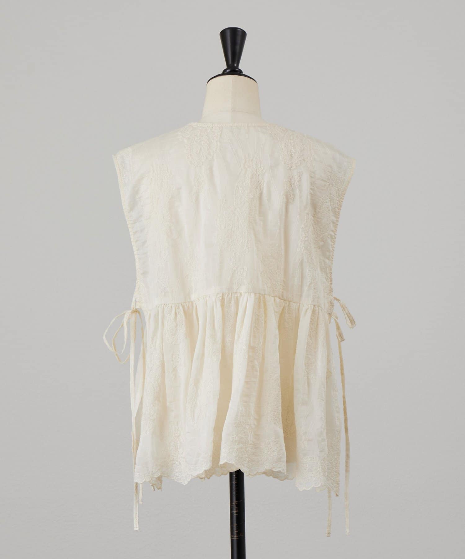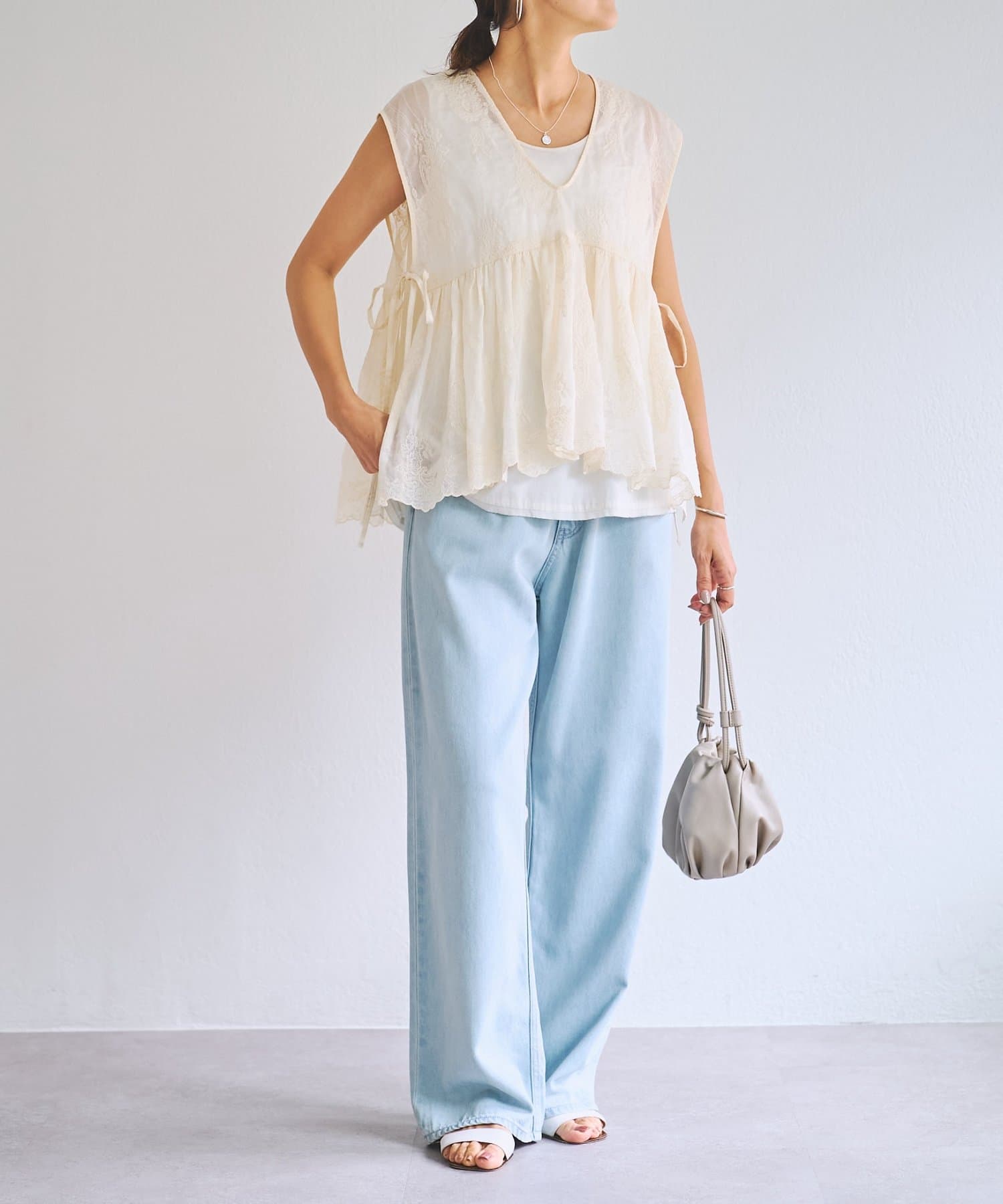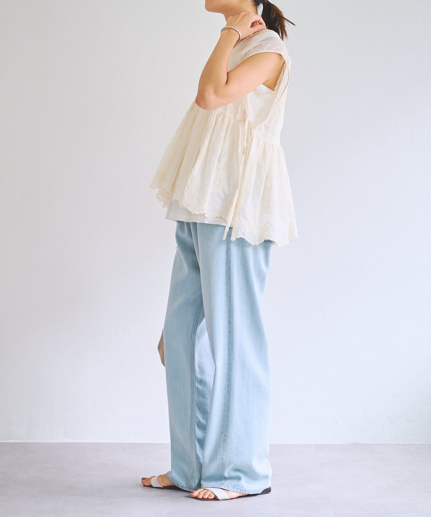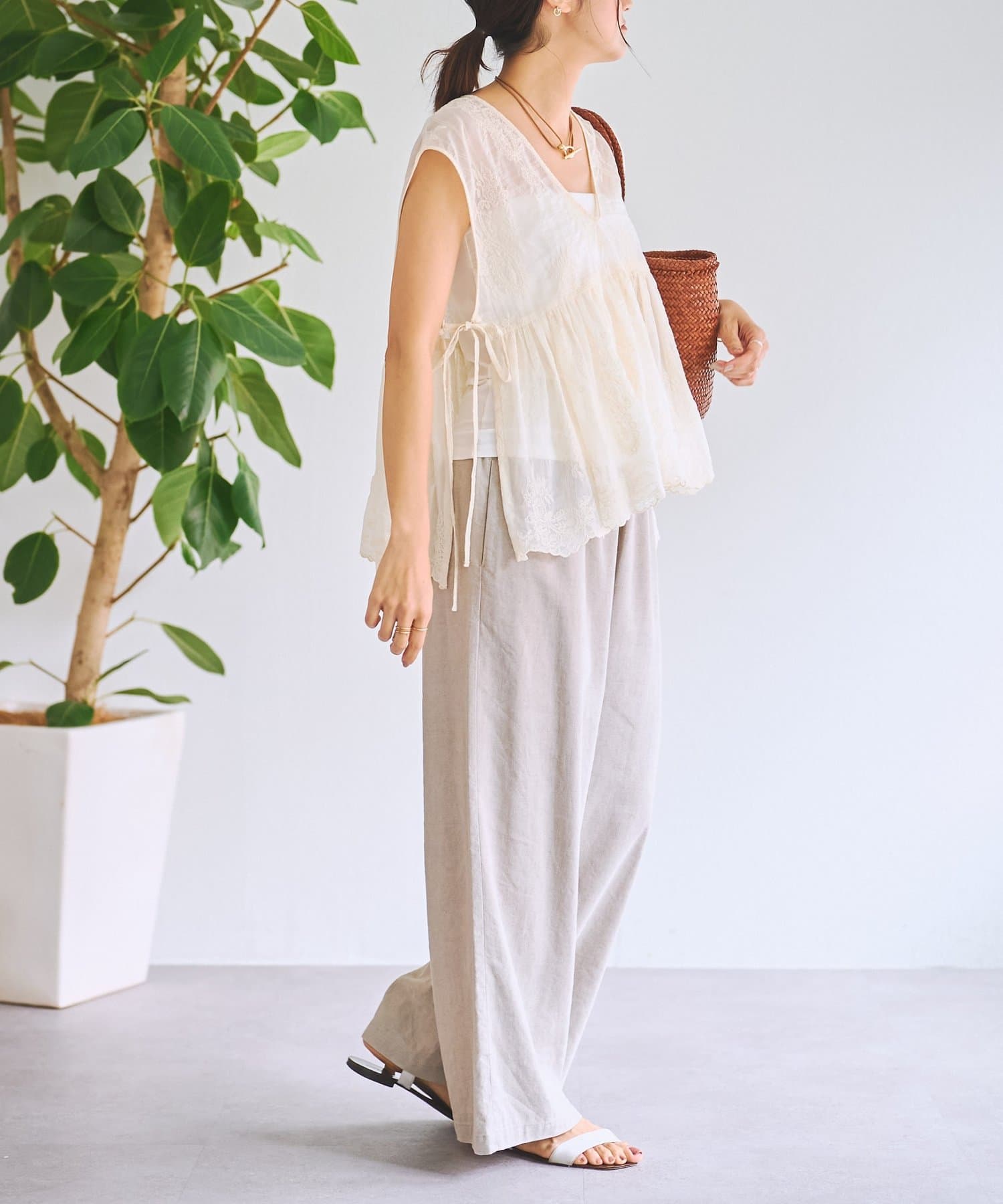 脇は縫い合わせずにサイドリボンを施し、軽やかに仕上げています。