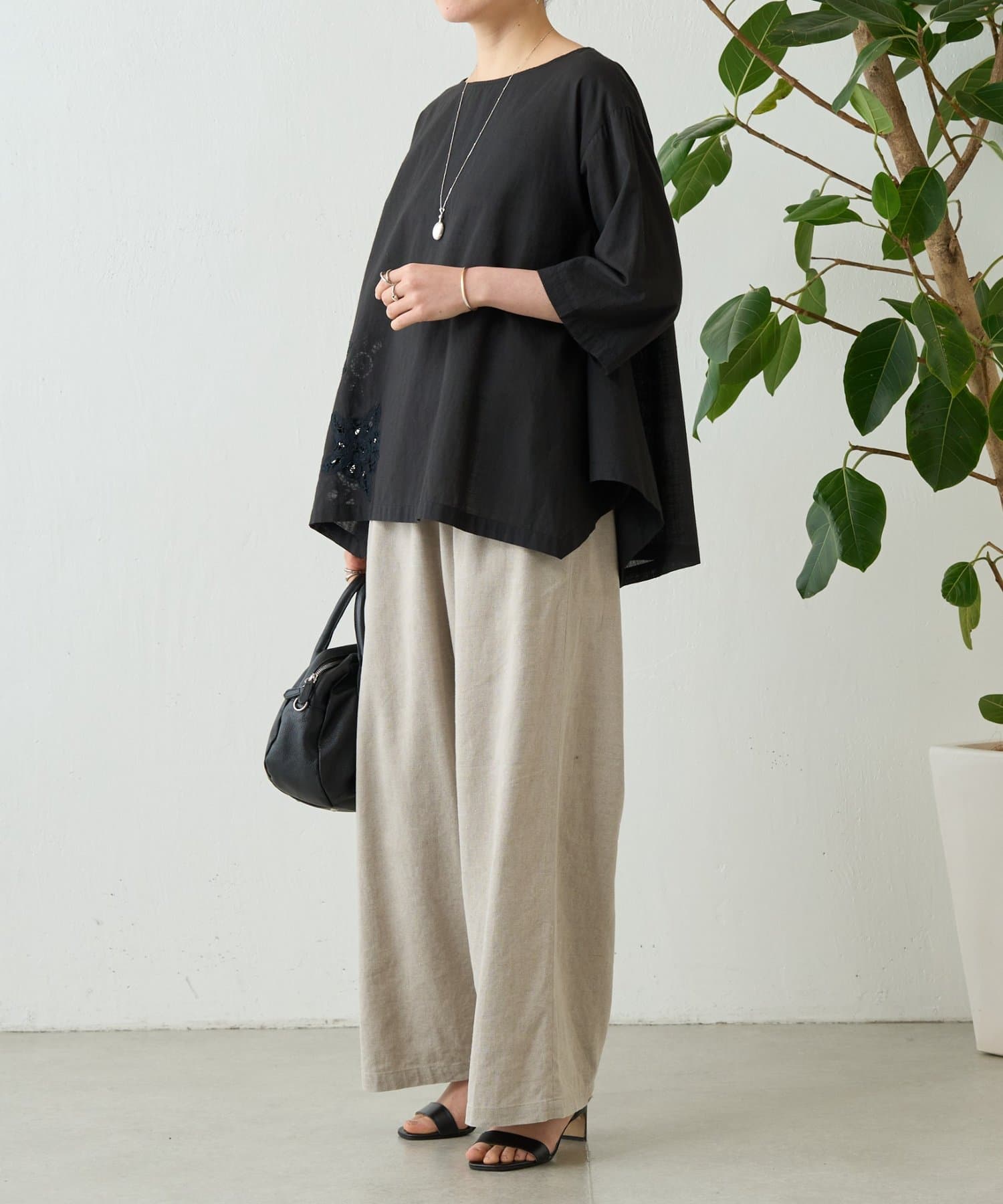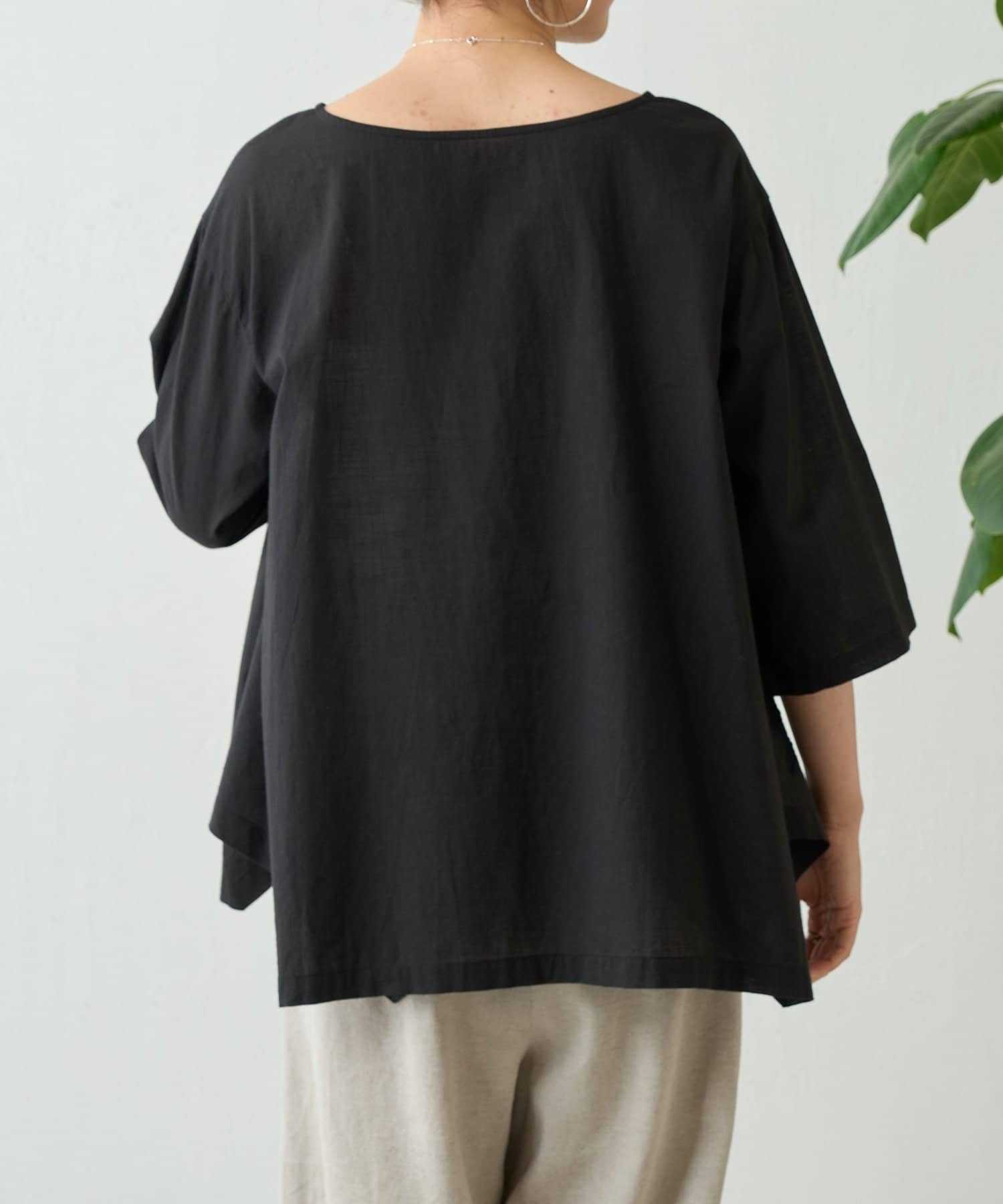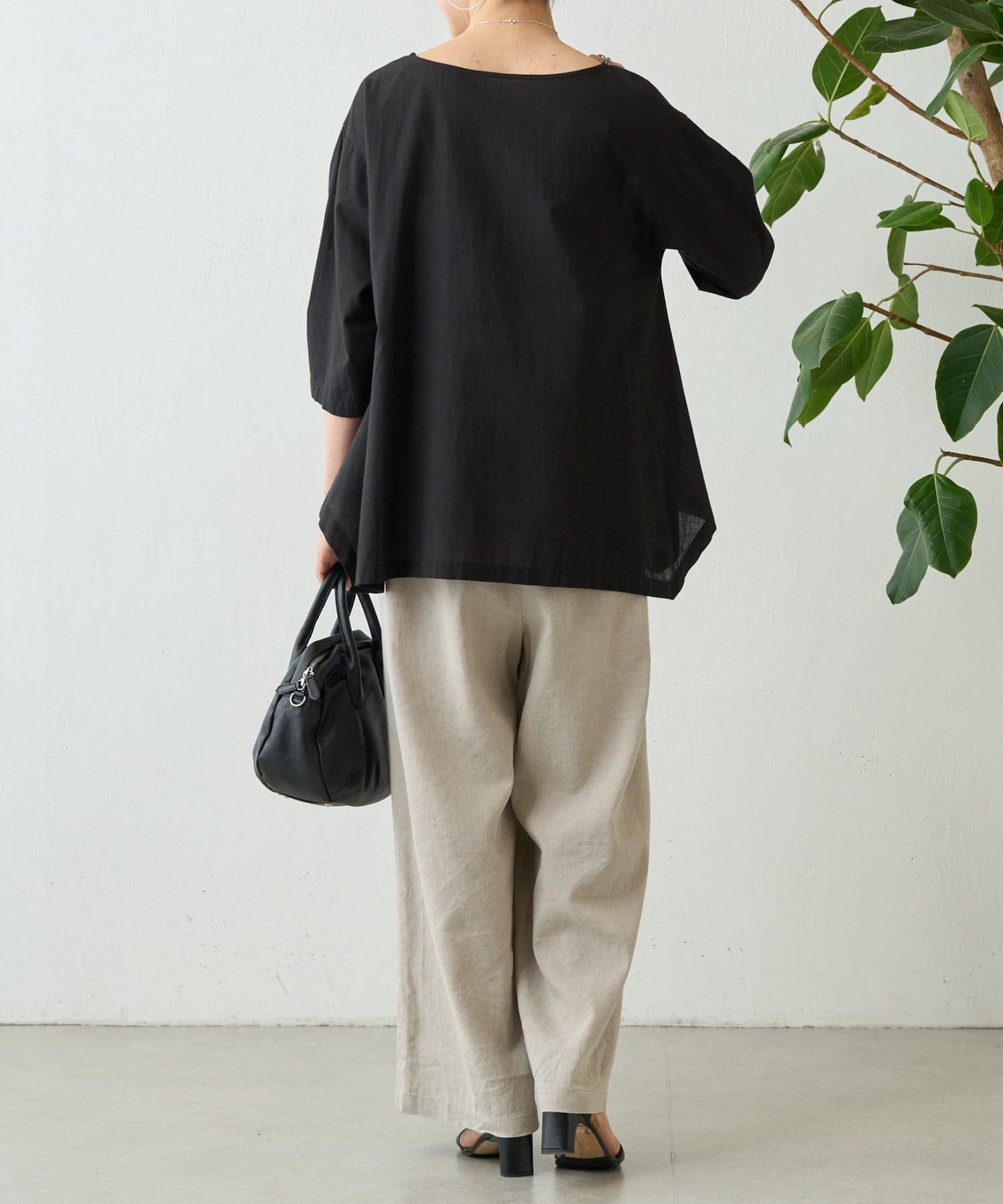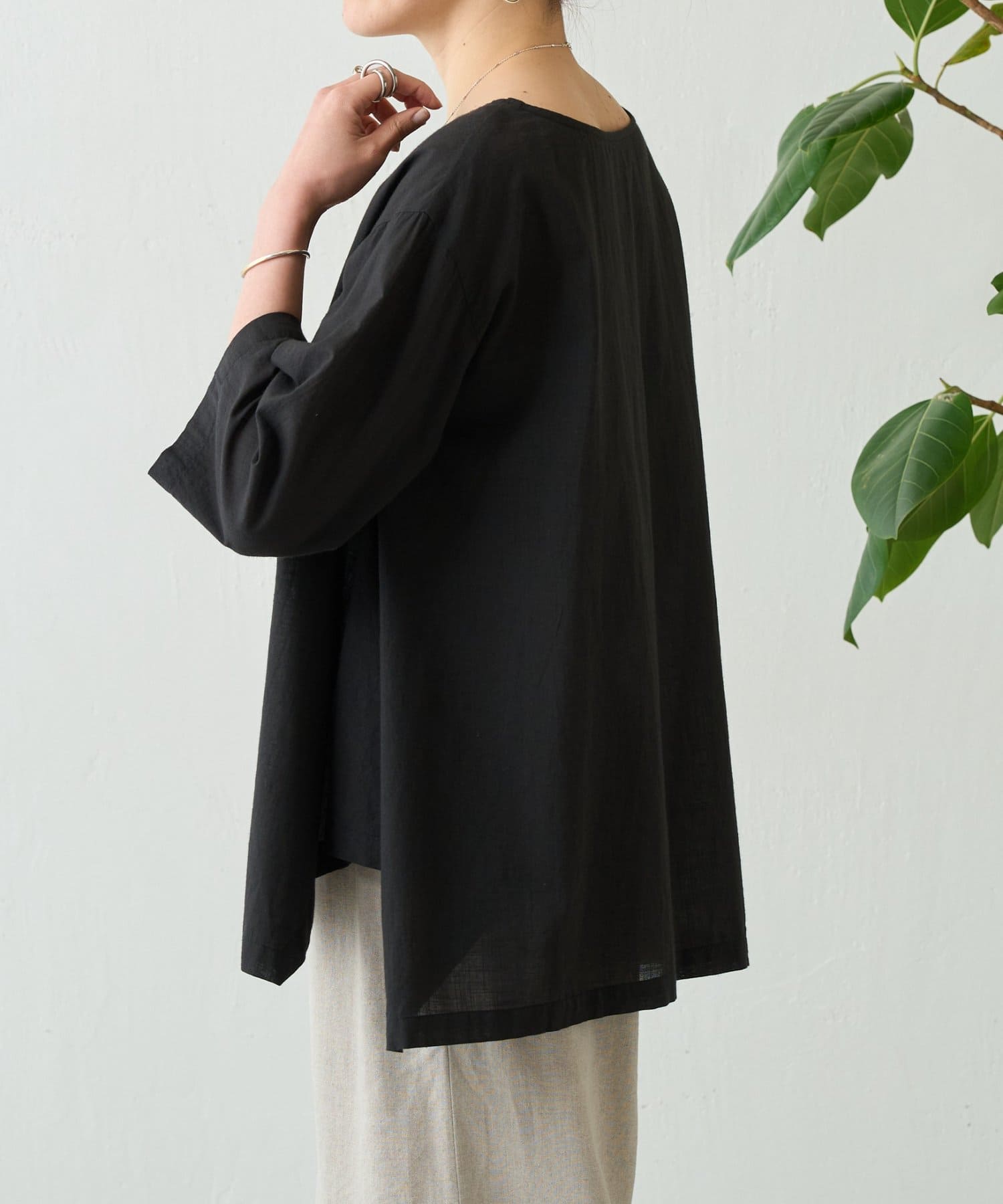 首元は詰まりすぎない程よい開きで、抜け感がありながら上品に着こなせます。