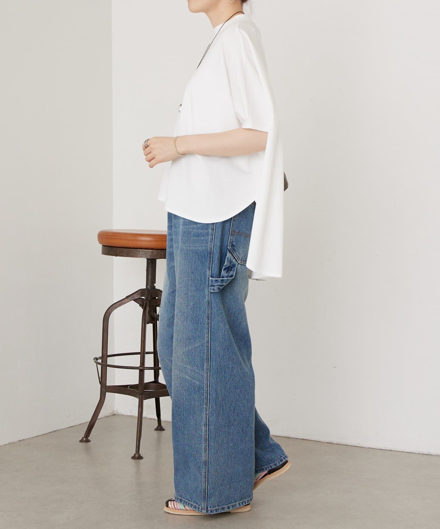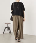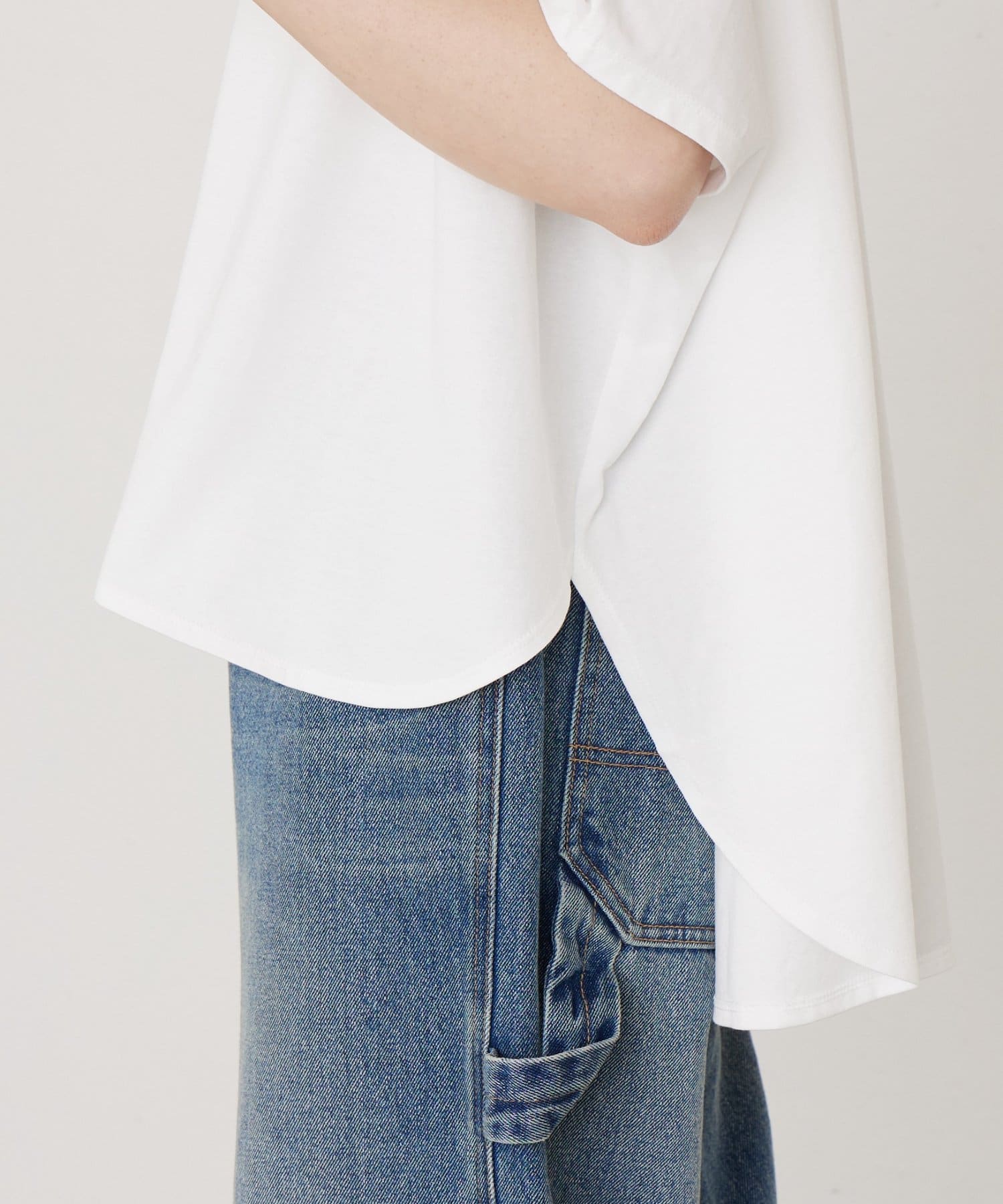 前後差のある着丈とラウンドヘムで、ワイドボトムストも好相性。
