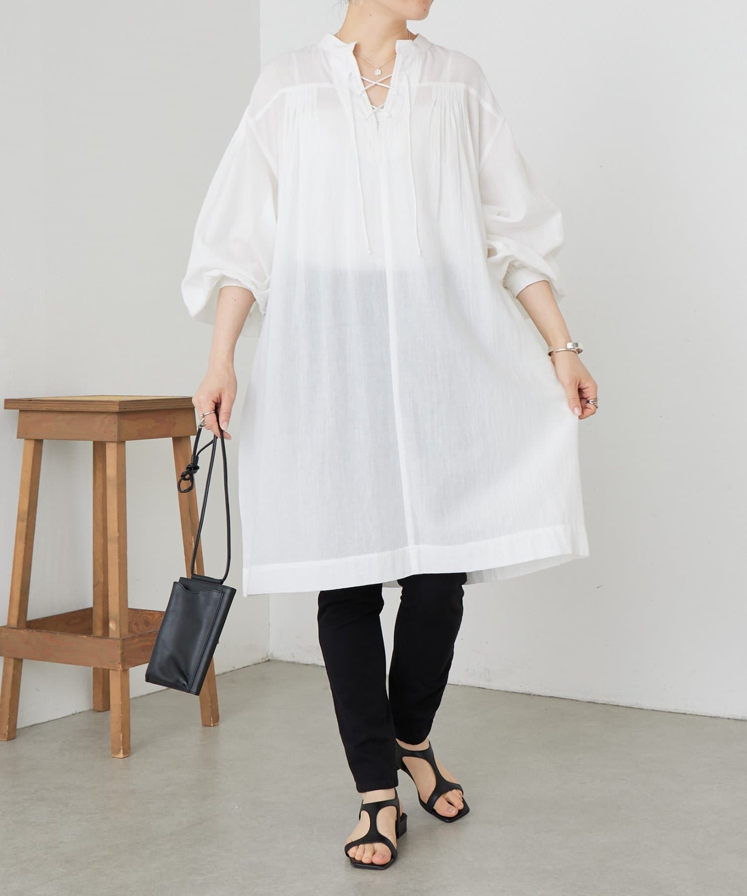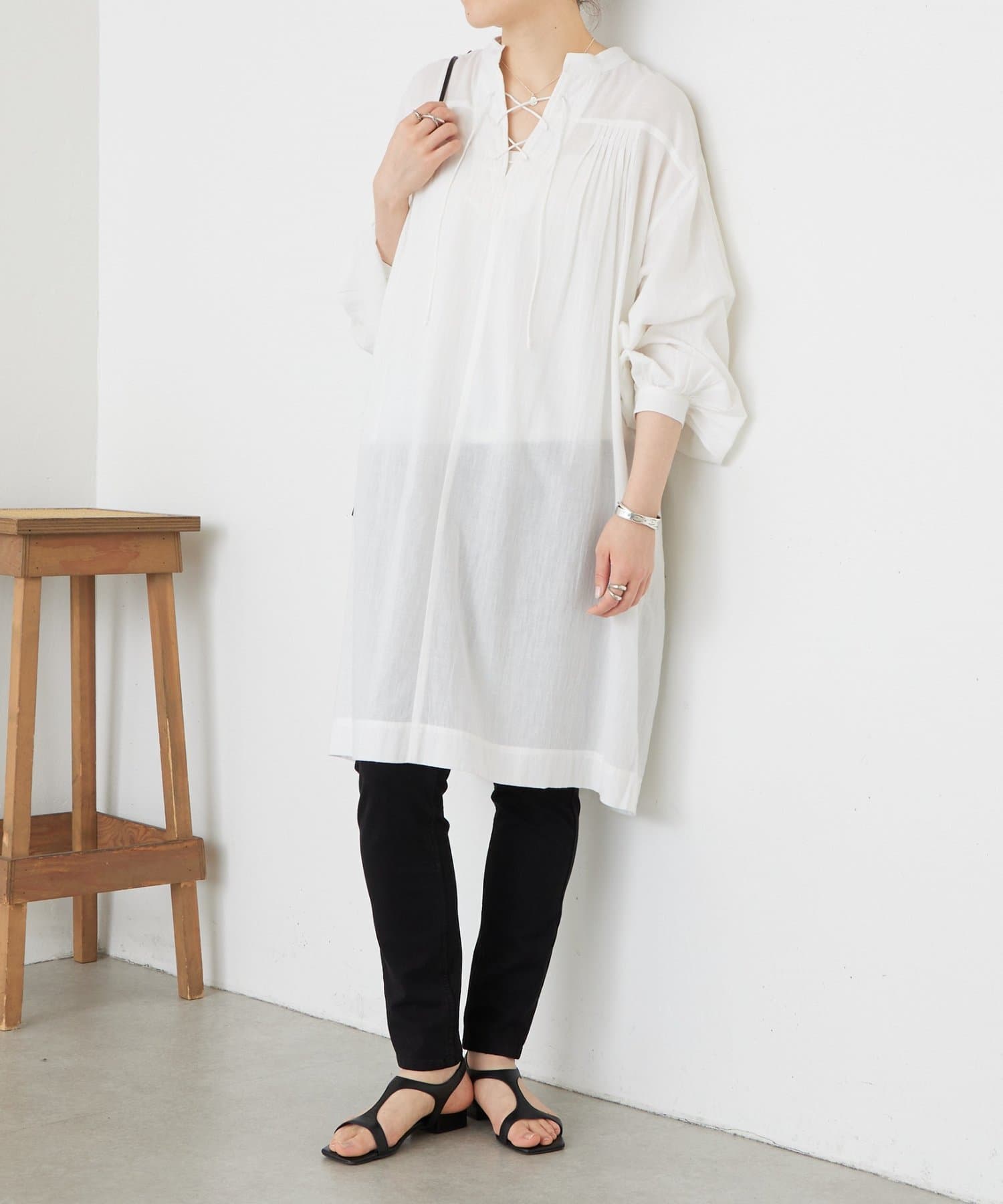 長すぎない着丈で細身パンツやワイドパンツとのレイヤードスタイルも楽しめます。