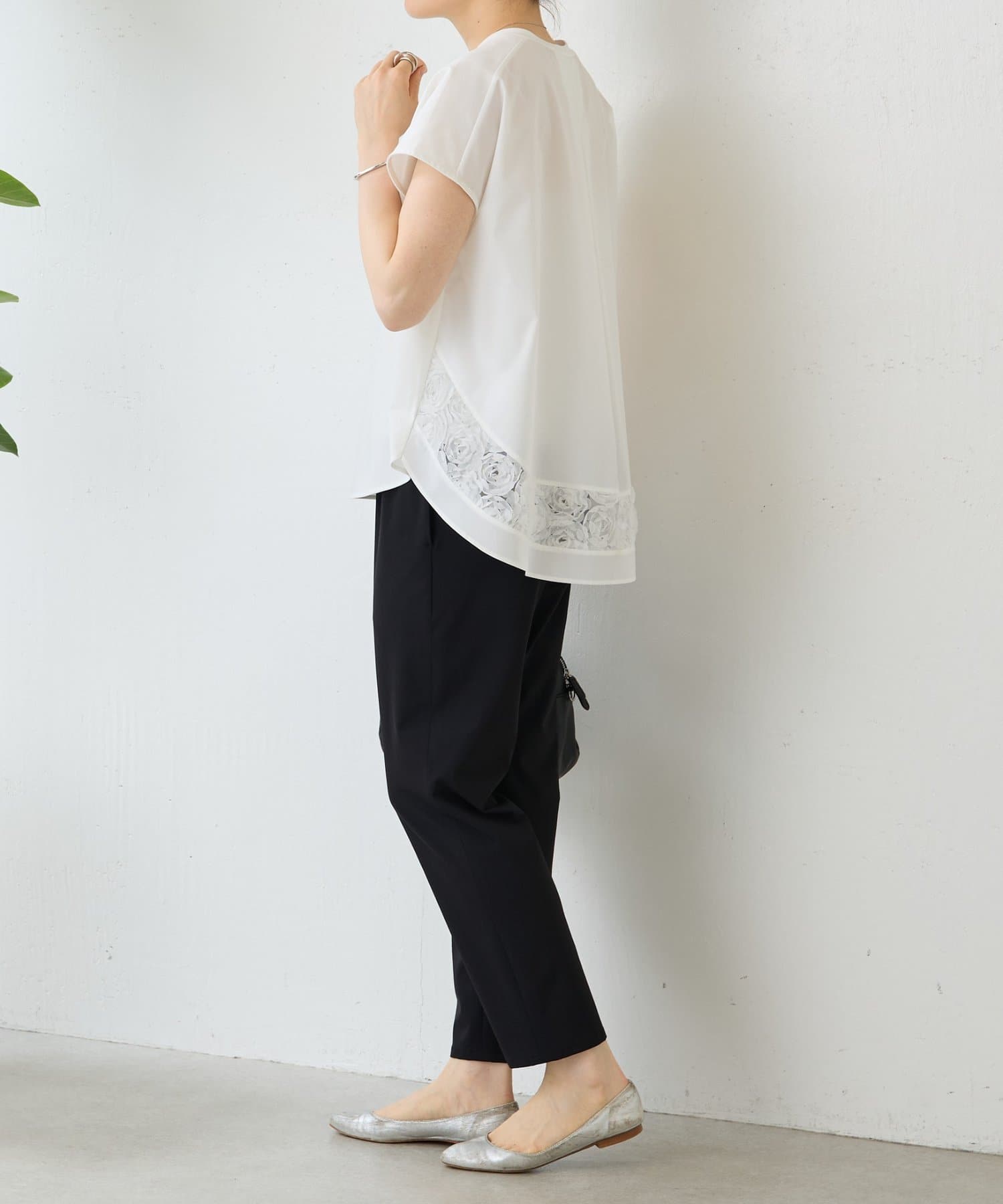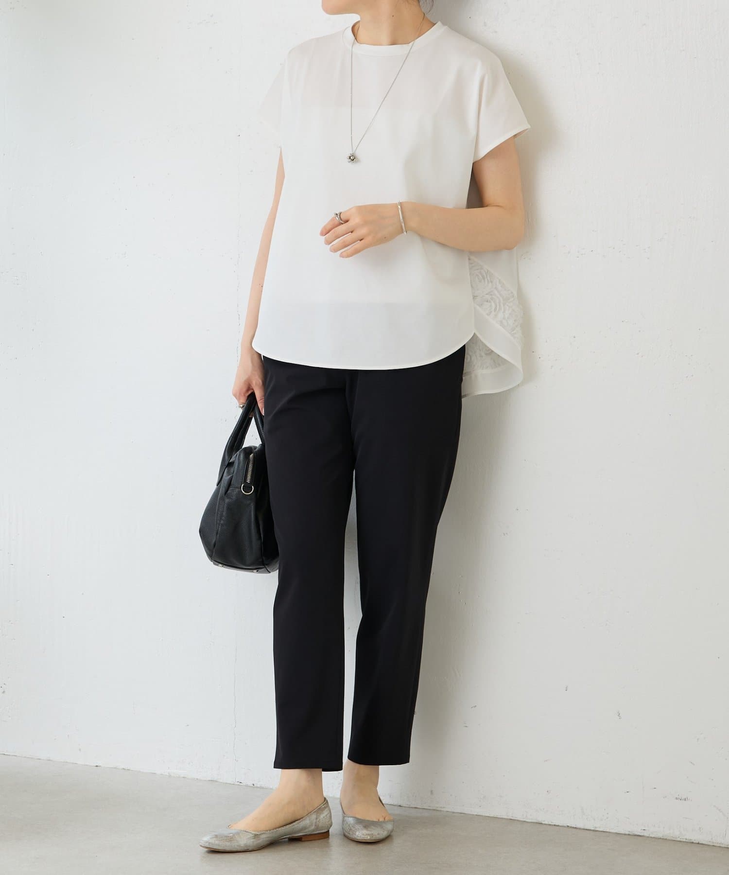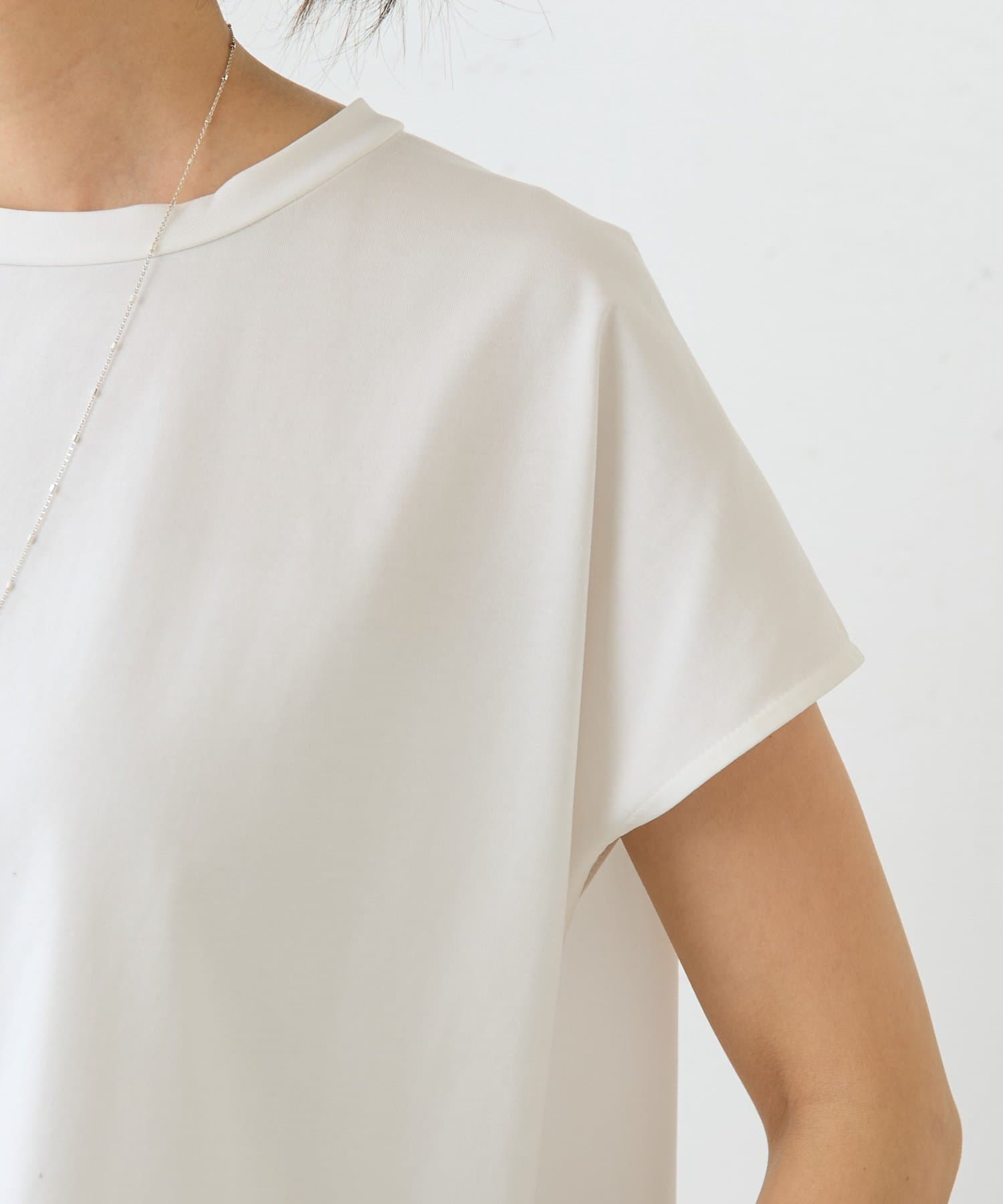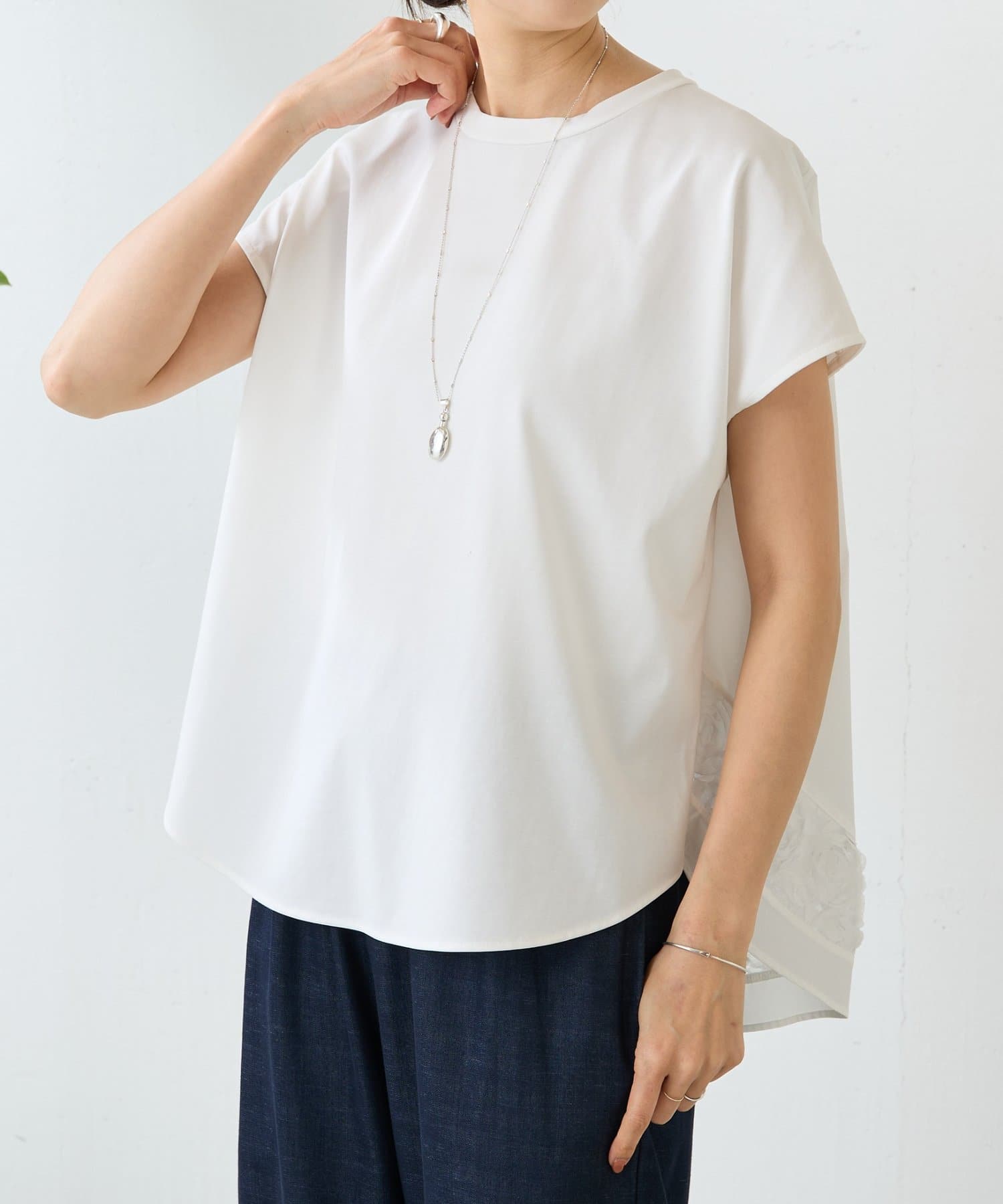 前は伸縮性のある滑らかなカットソー、後ろはハリのあるきれいめなシャツ地の異素材使いがさりげないポイント。