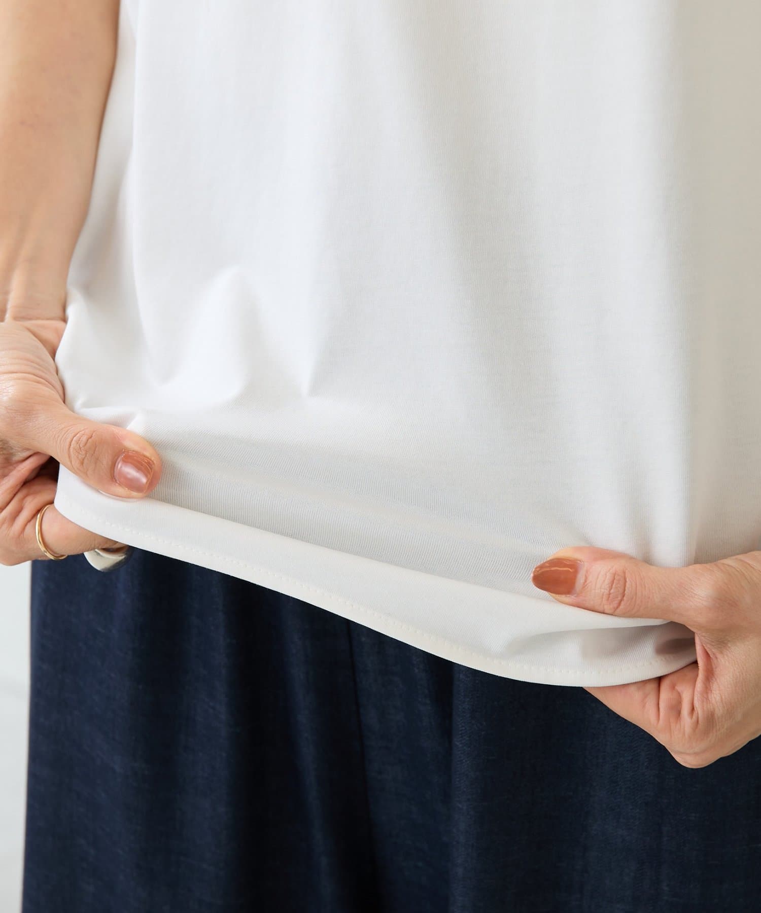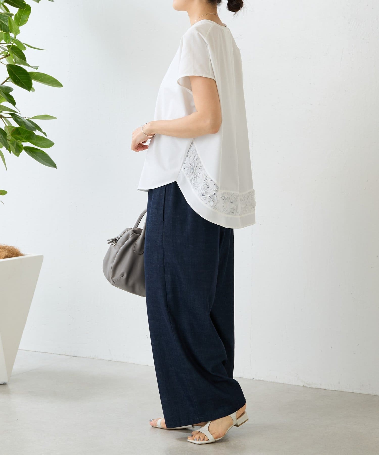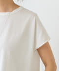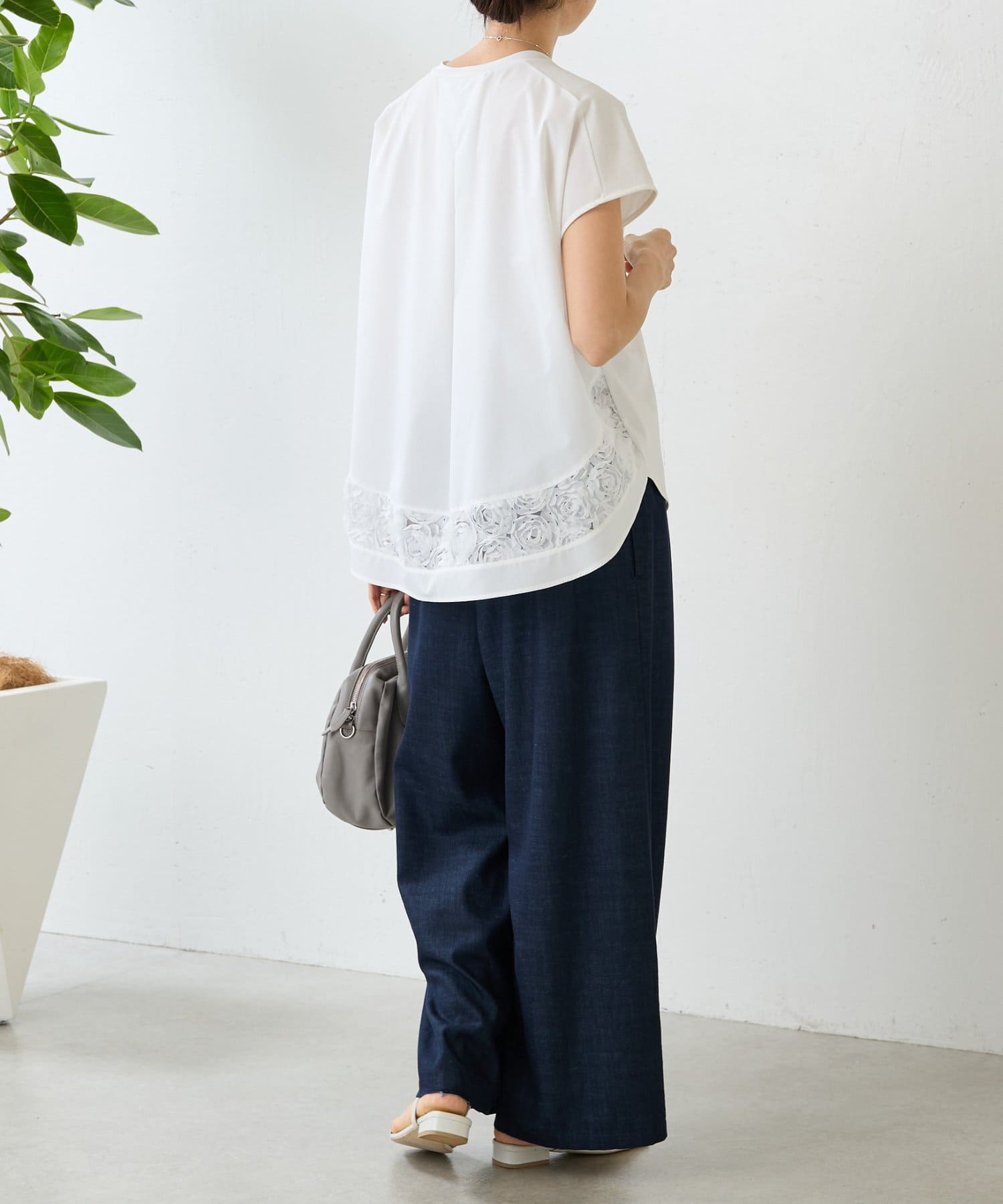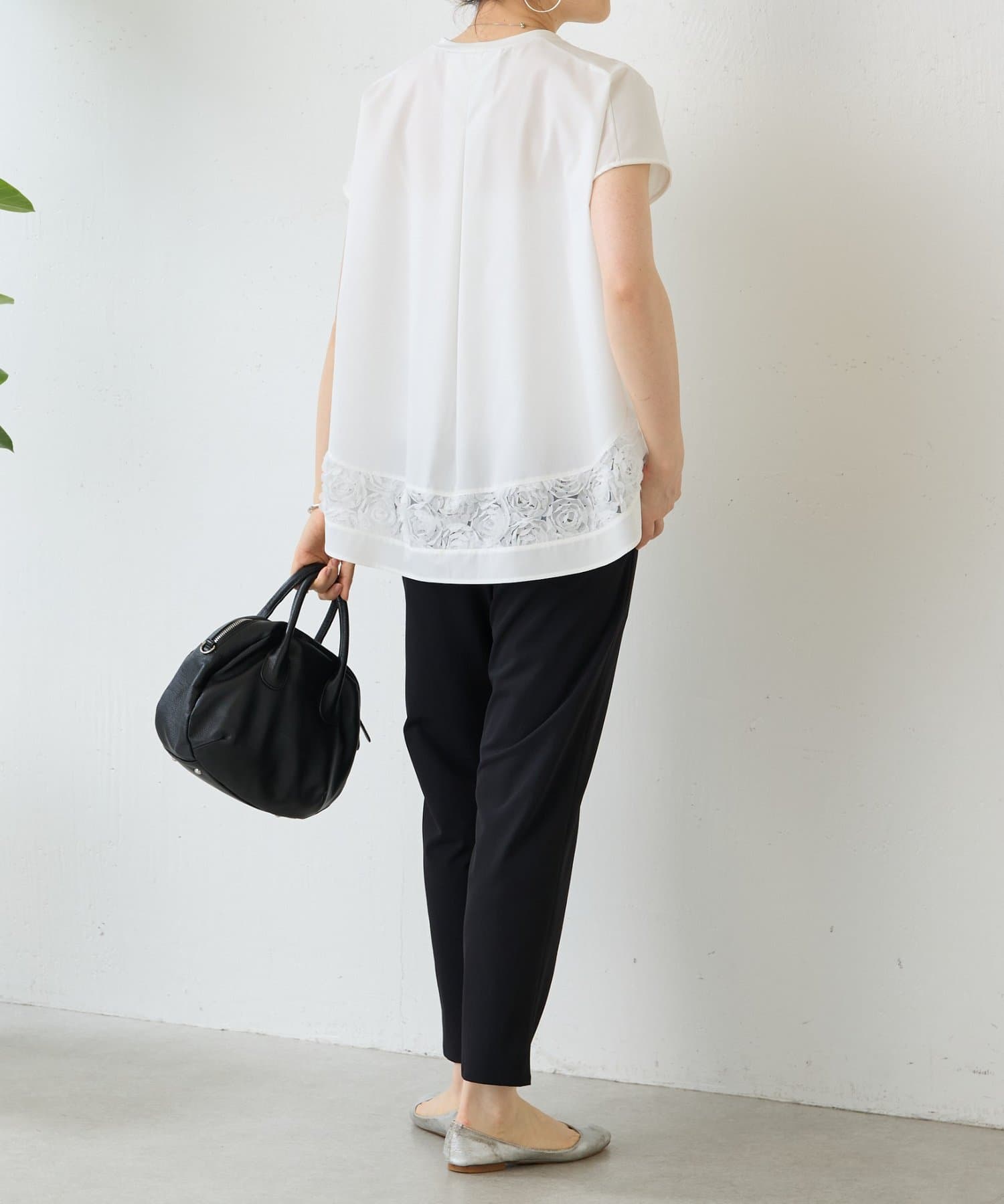 前は伸縮性のある滑らかなカットソー、後ろはハリのあるきれいめなシャツ地の異素材使いがさりげないポイント。