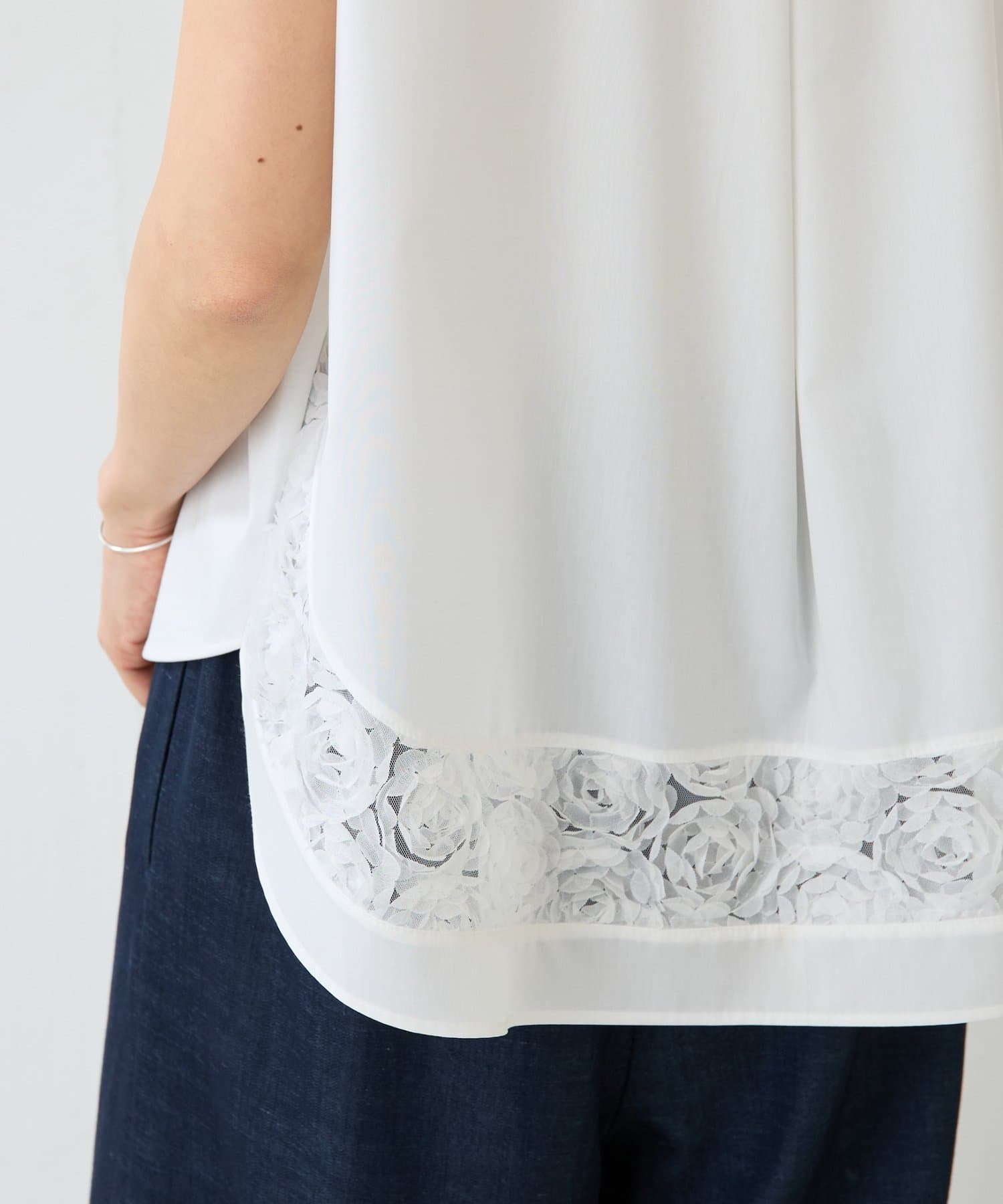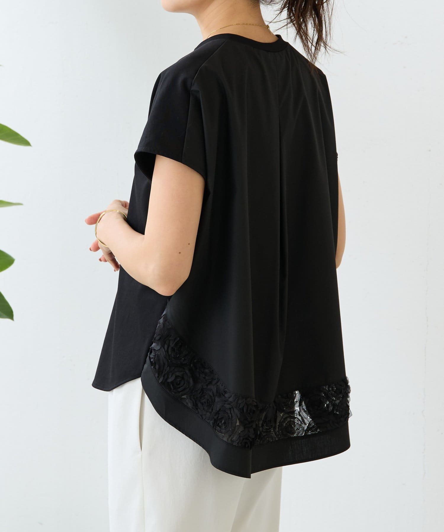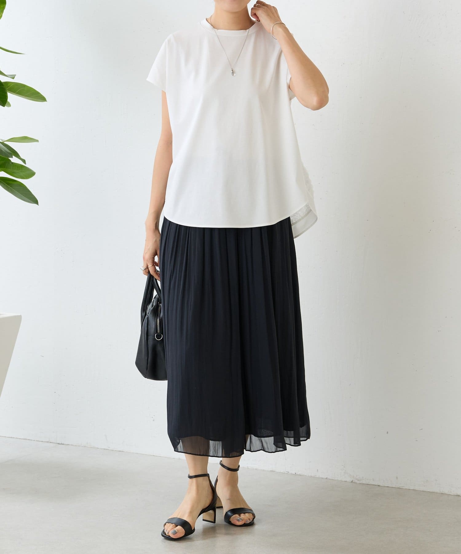 透け感のあるチュール素材を組み合わせ、シンプルながらも着映えする一枚です。