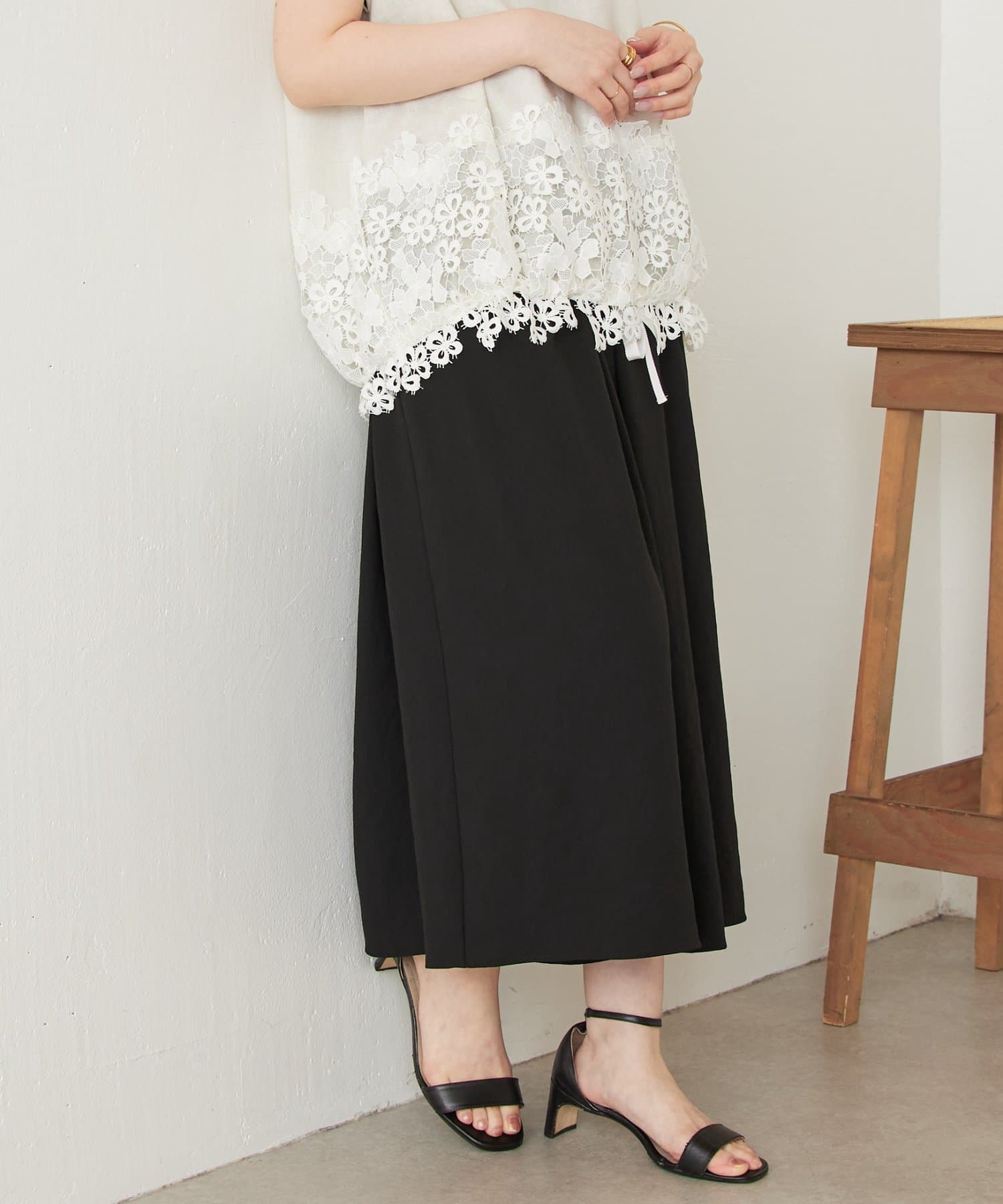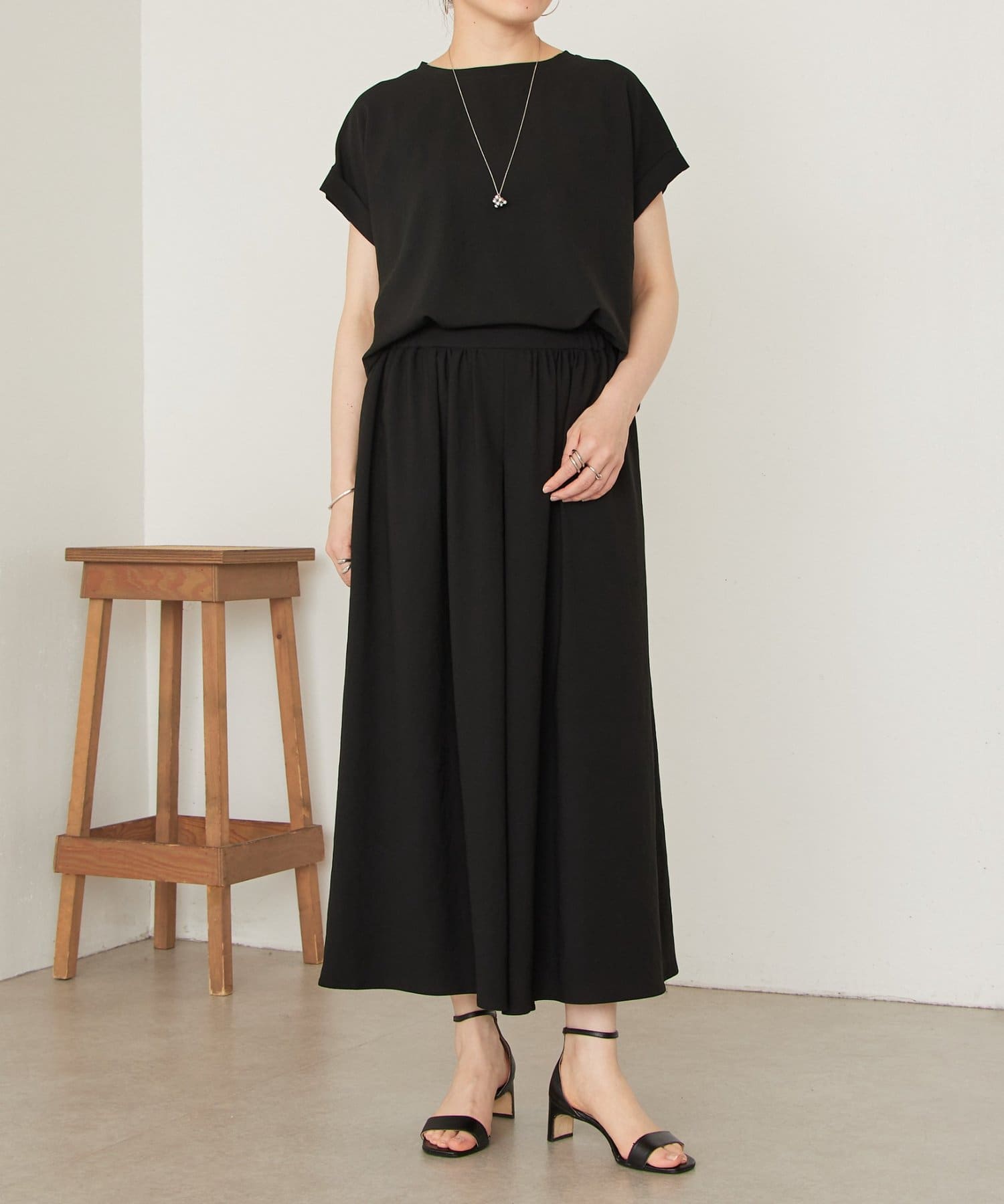 落ち感のあるジョーゼット素材を使用しており、足のラインを拾わず綺麗なドレープを描きます。