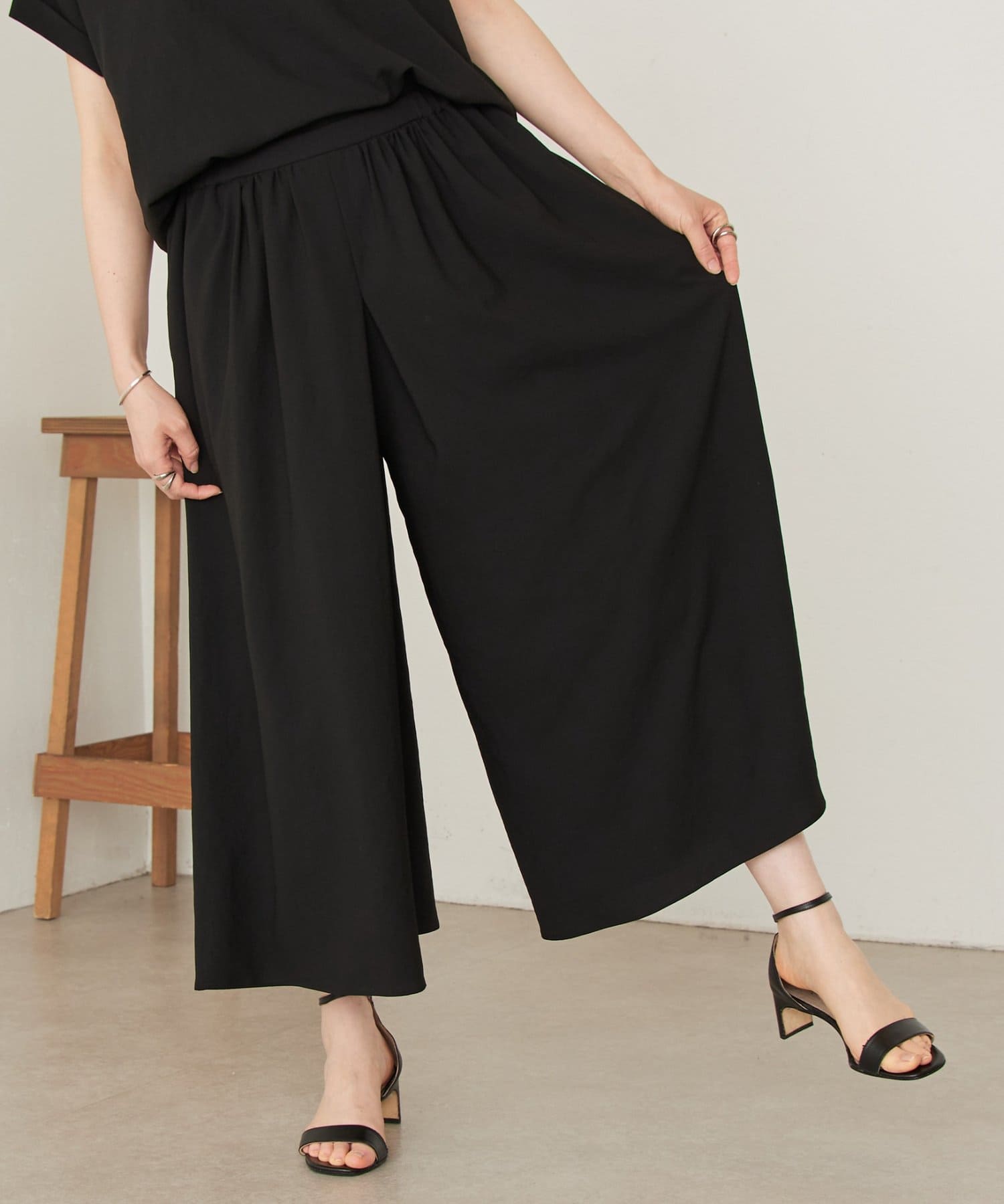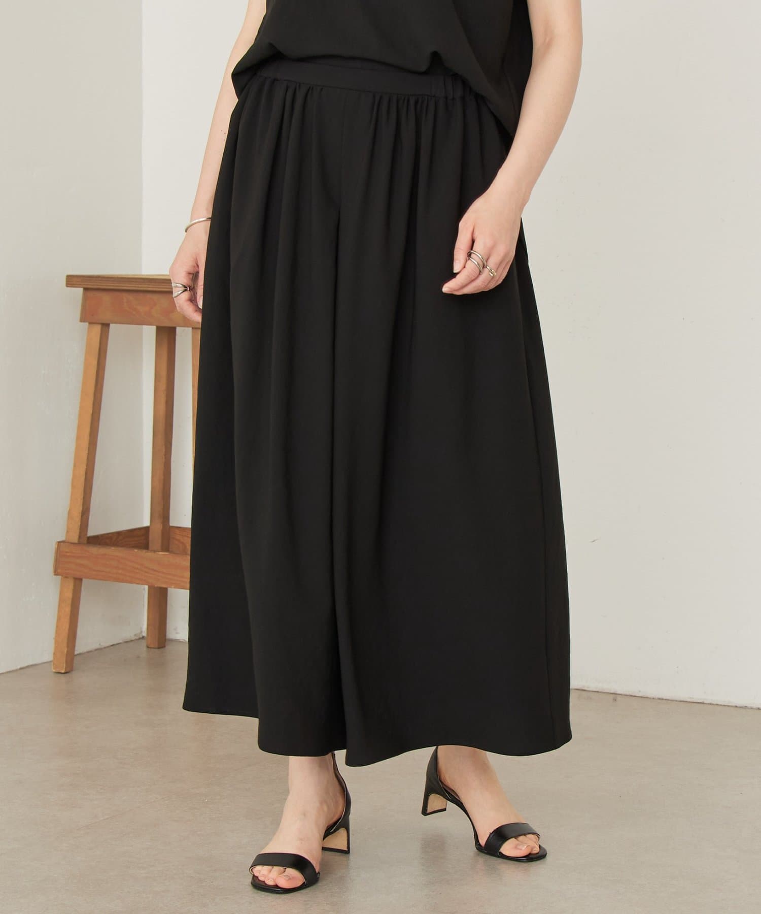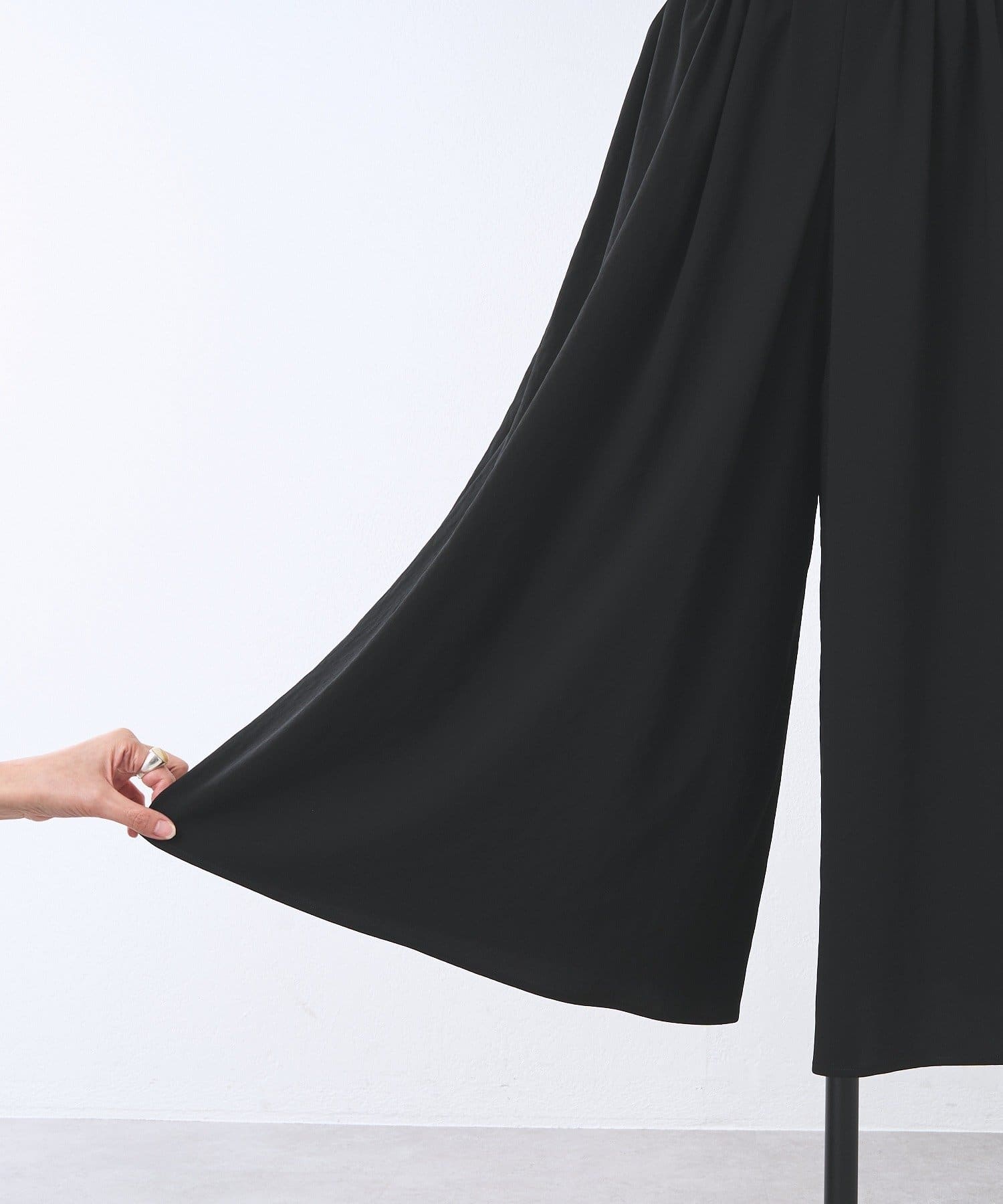 一見スカートのような、エレガントで上品なシルエットが魅力のギャザーパンツ。