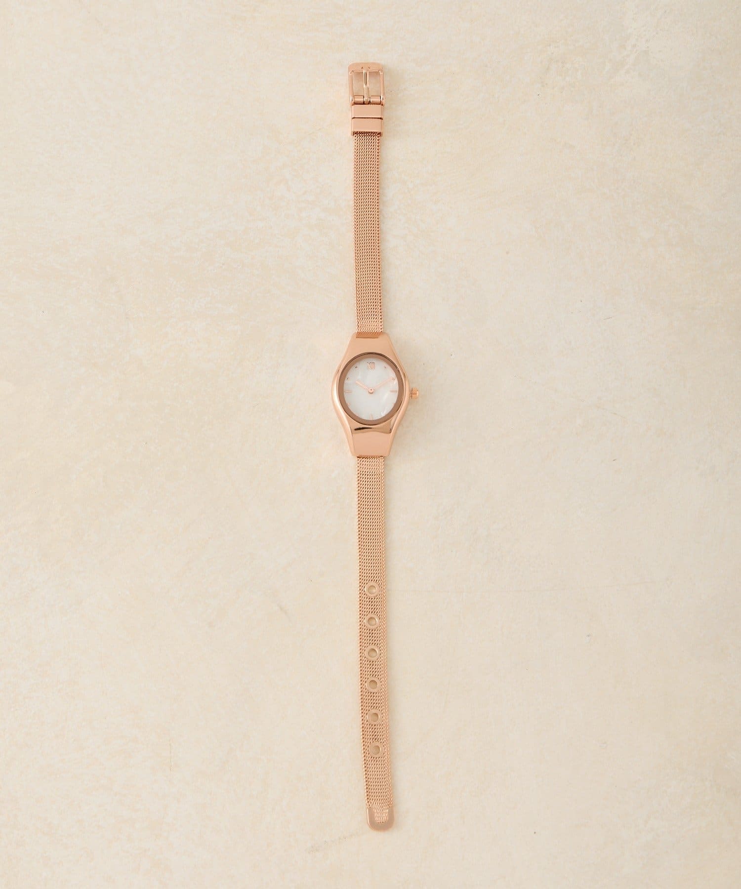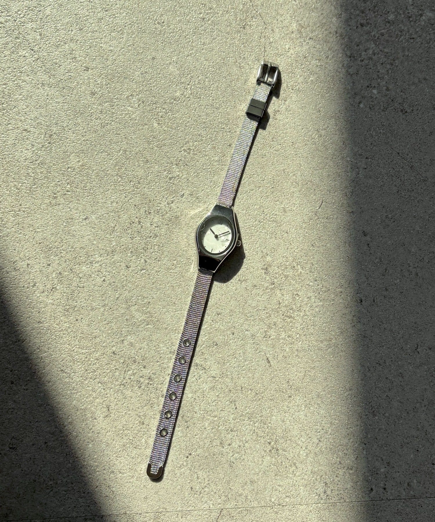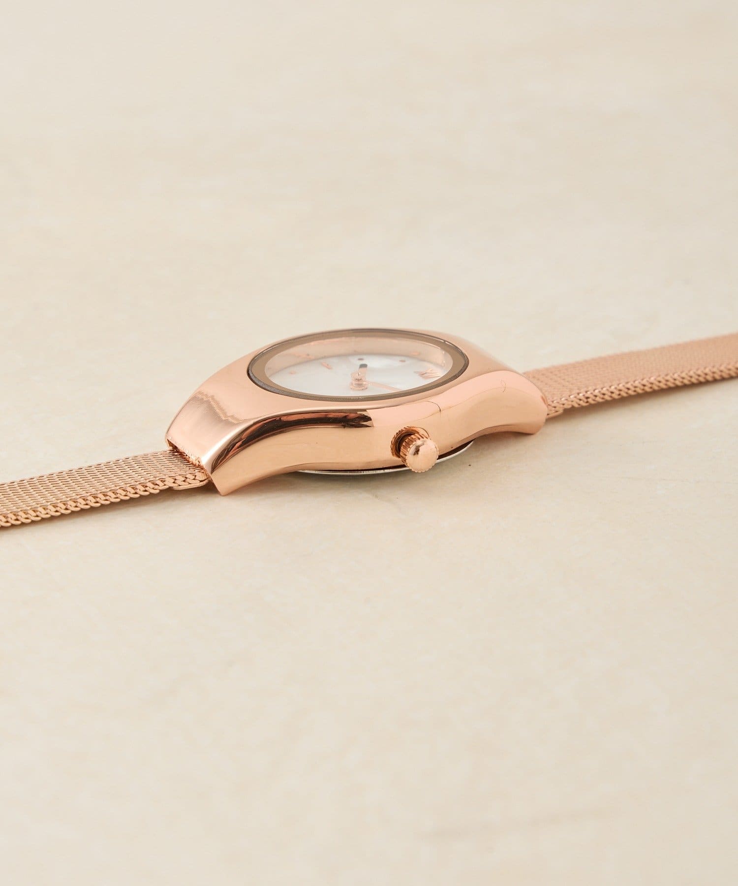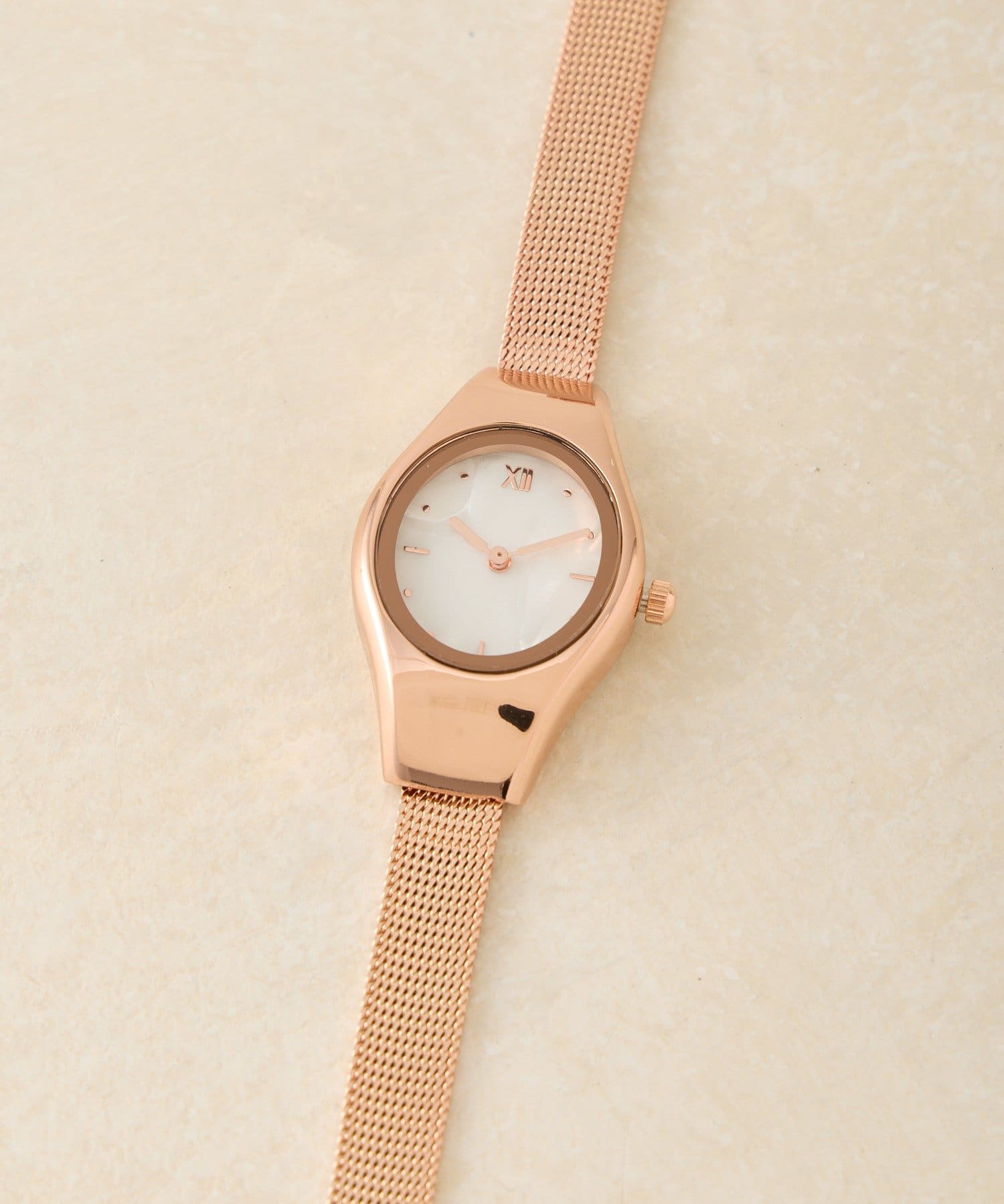 ころんとした形とスタイリッシュなメッシュベルトがレディライクな腕時計。
