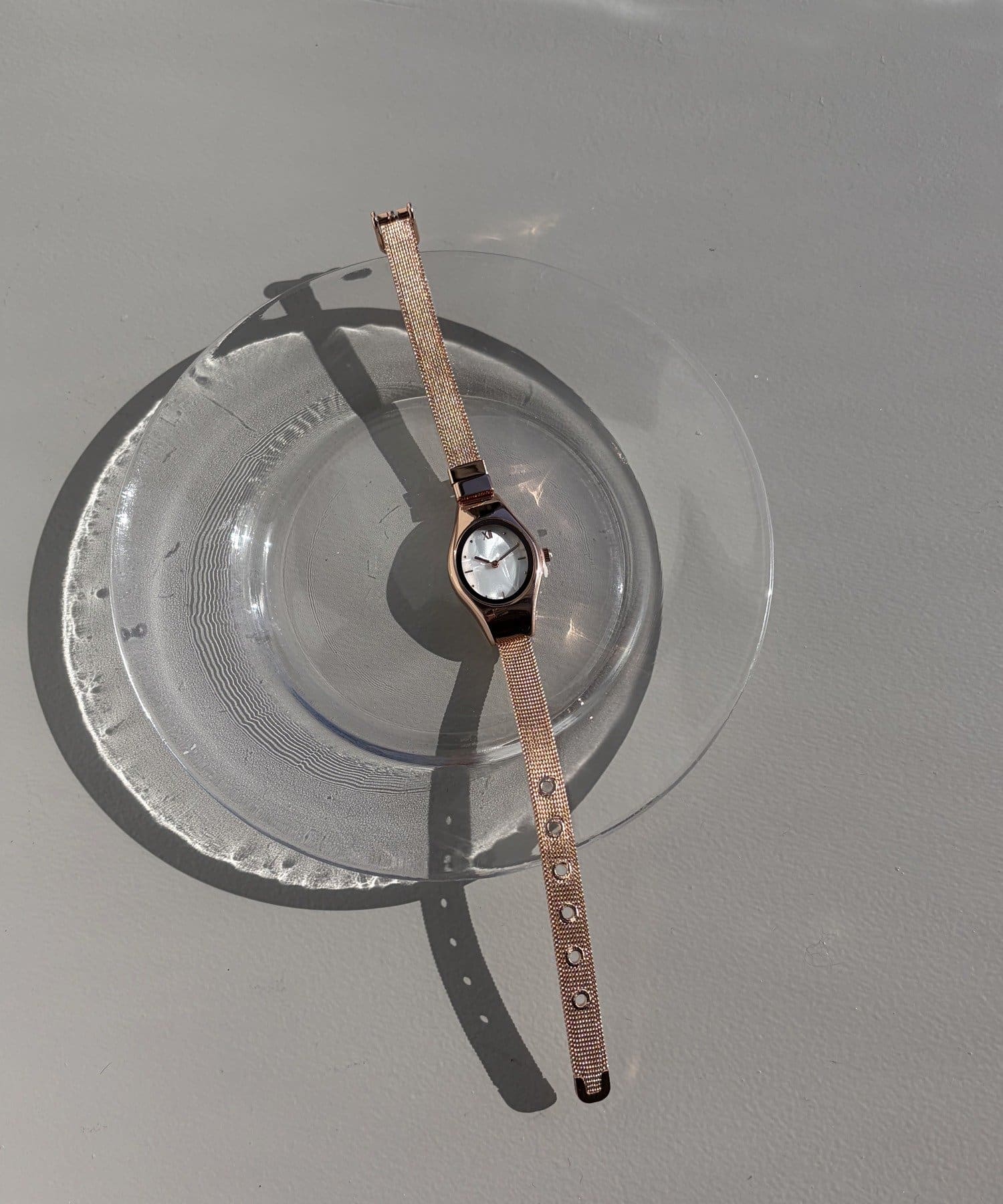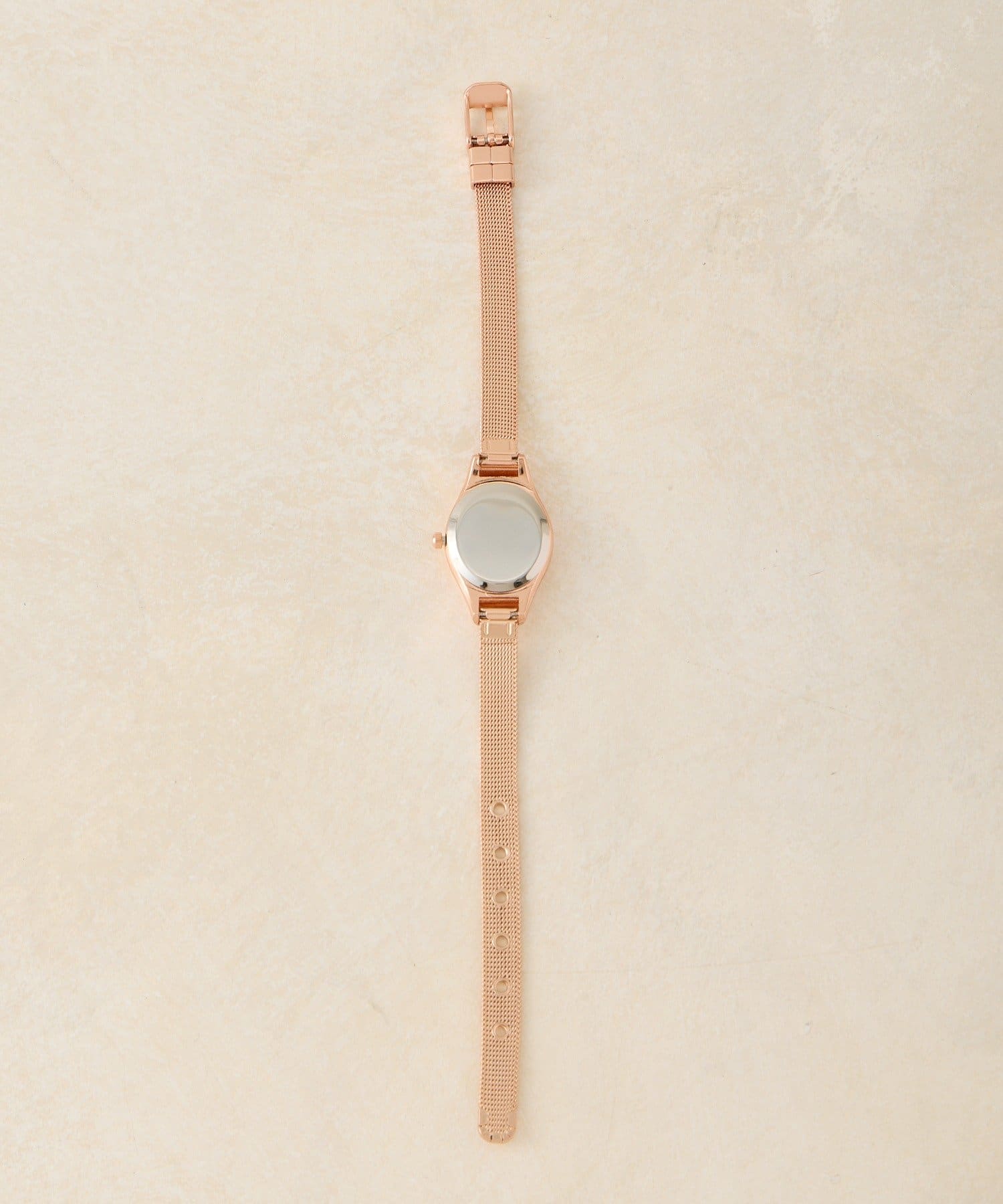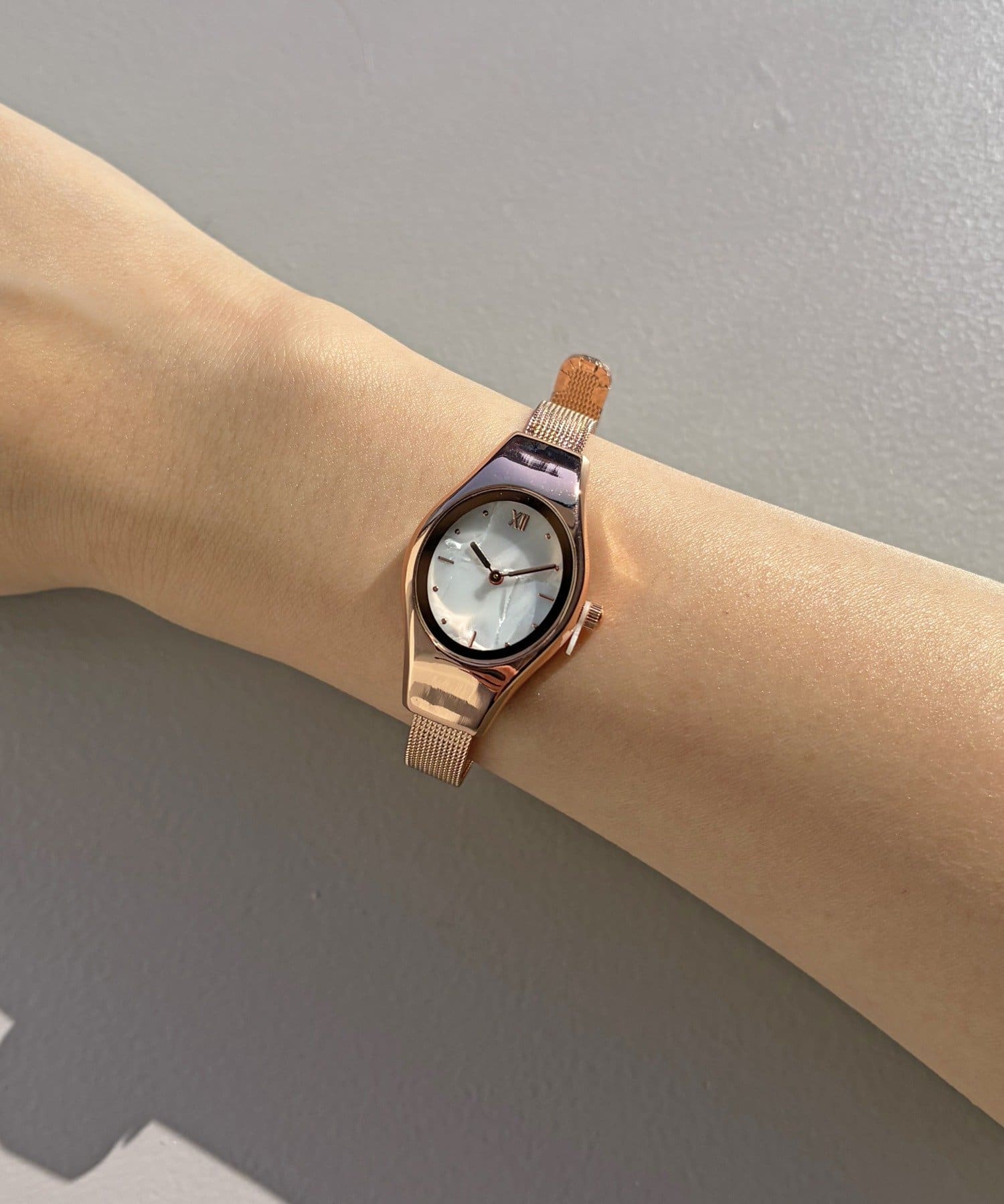 ころんとした形とスタイリッシュなメッシュベルトがレディライクな腕時計。