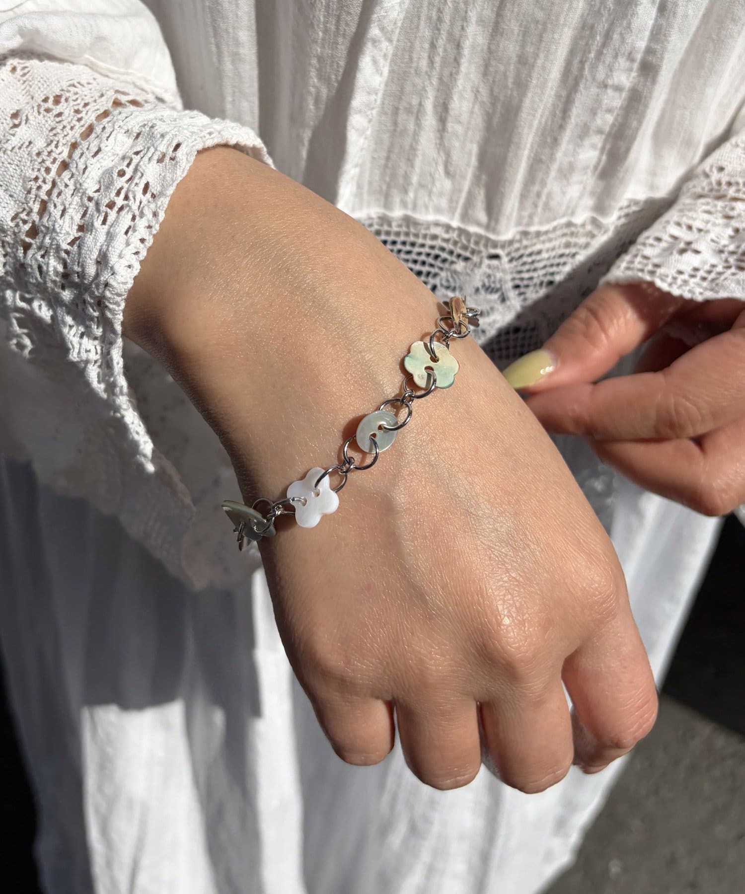 チェーンの合間にきらめくクリアパーツが、涼しげで軽やかな印象をプラスしてくれます。
