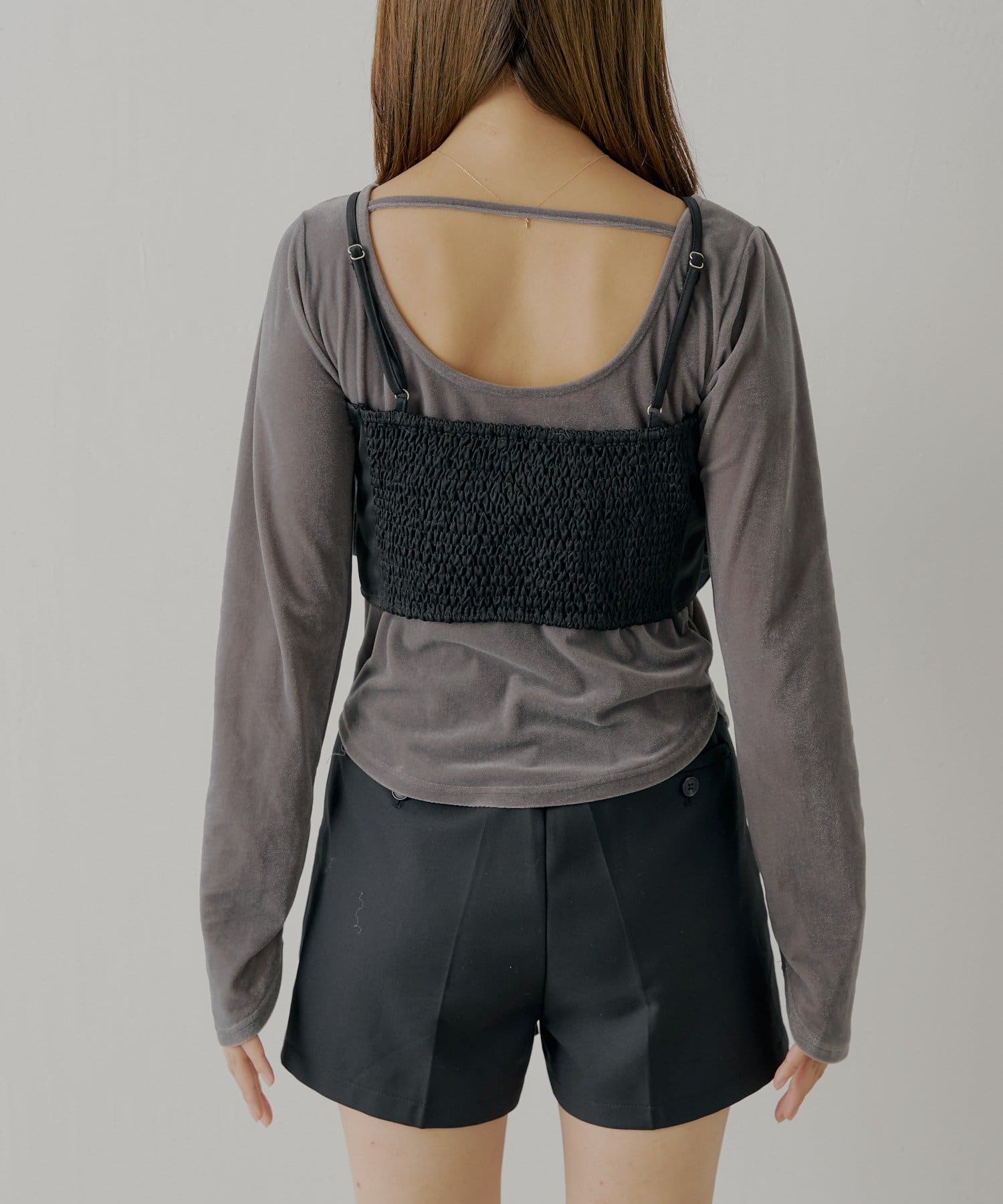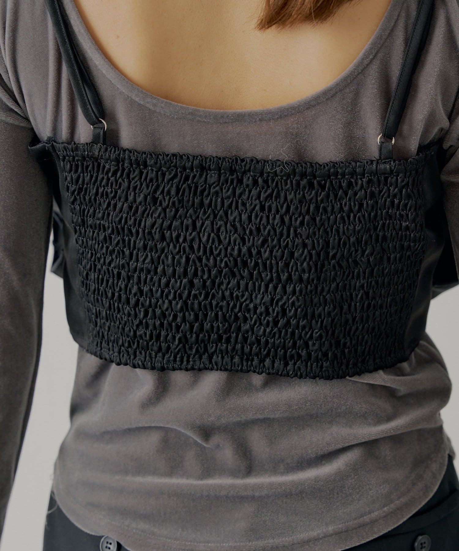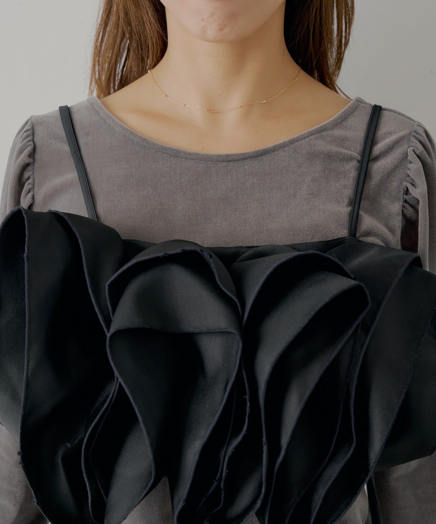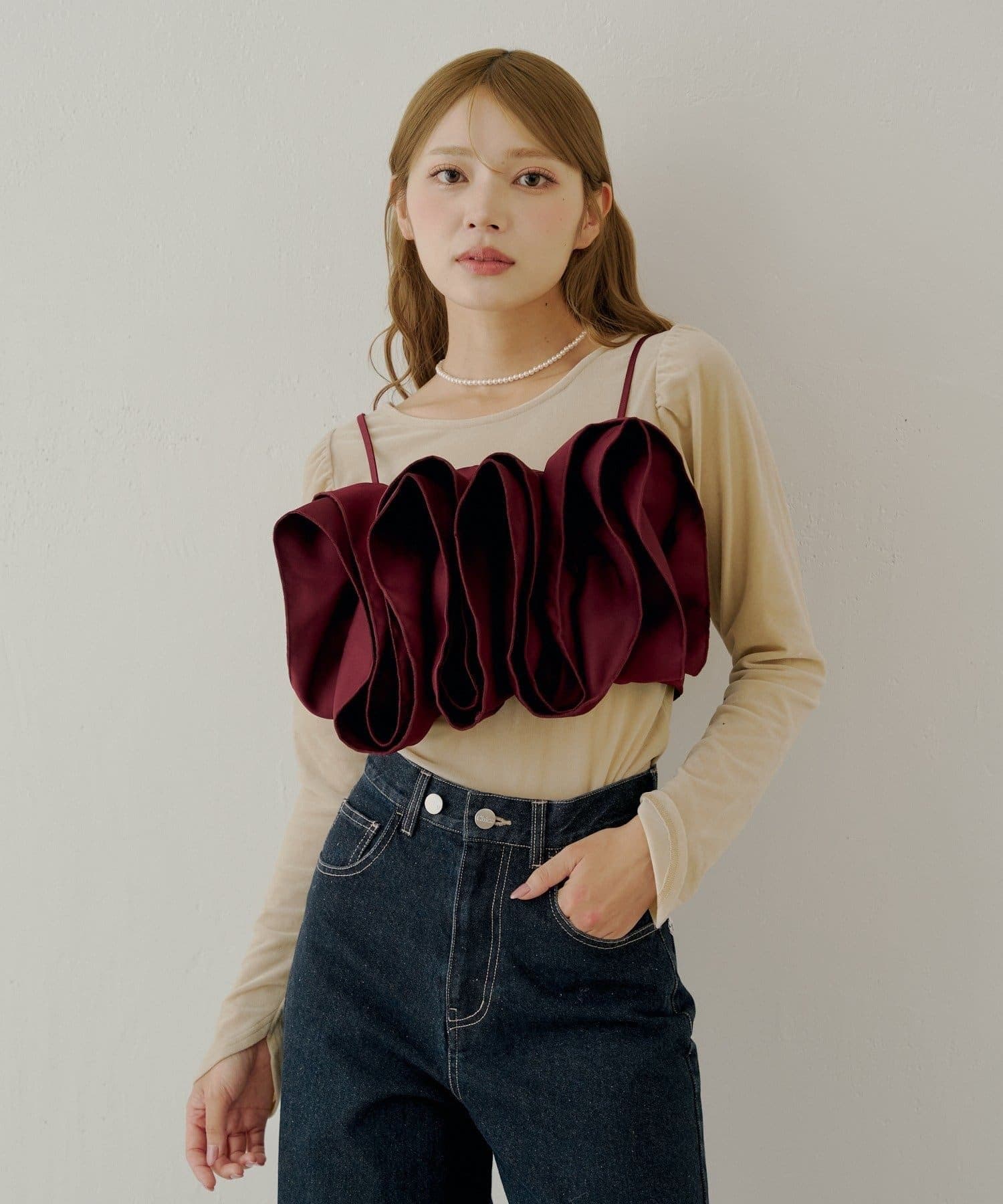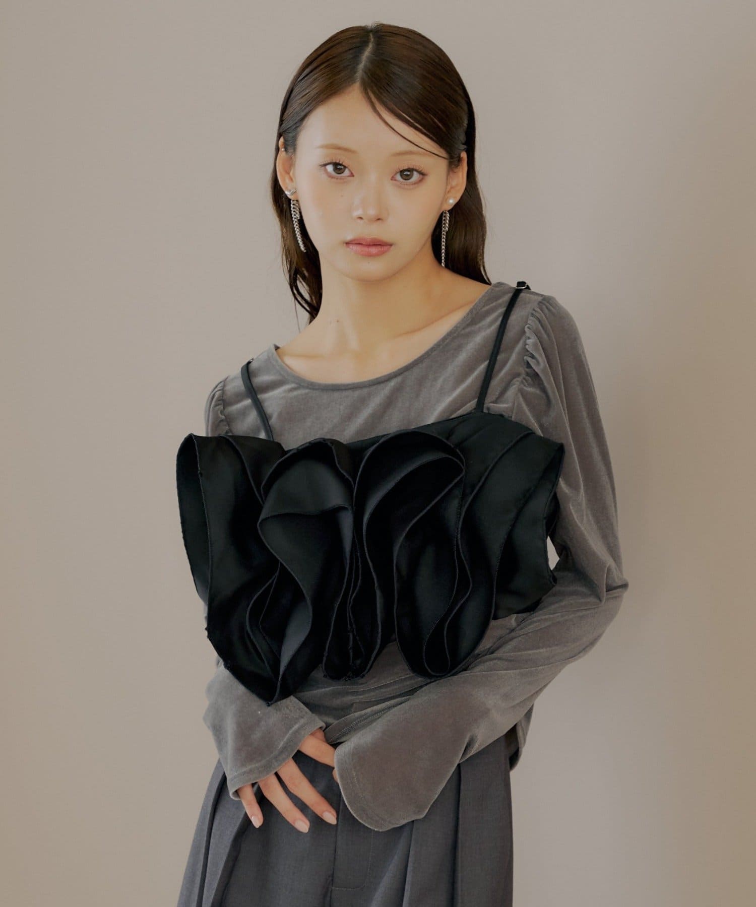 ・大胆なフリルが目を引くベアキャミソールと、上品な光沢感が魅力のベロアトップスのセットアイテム。
