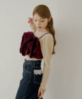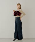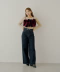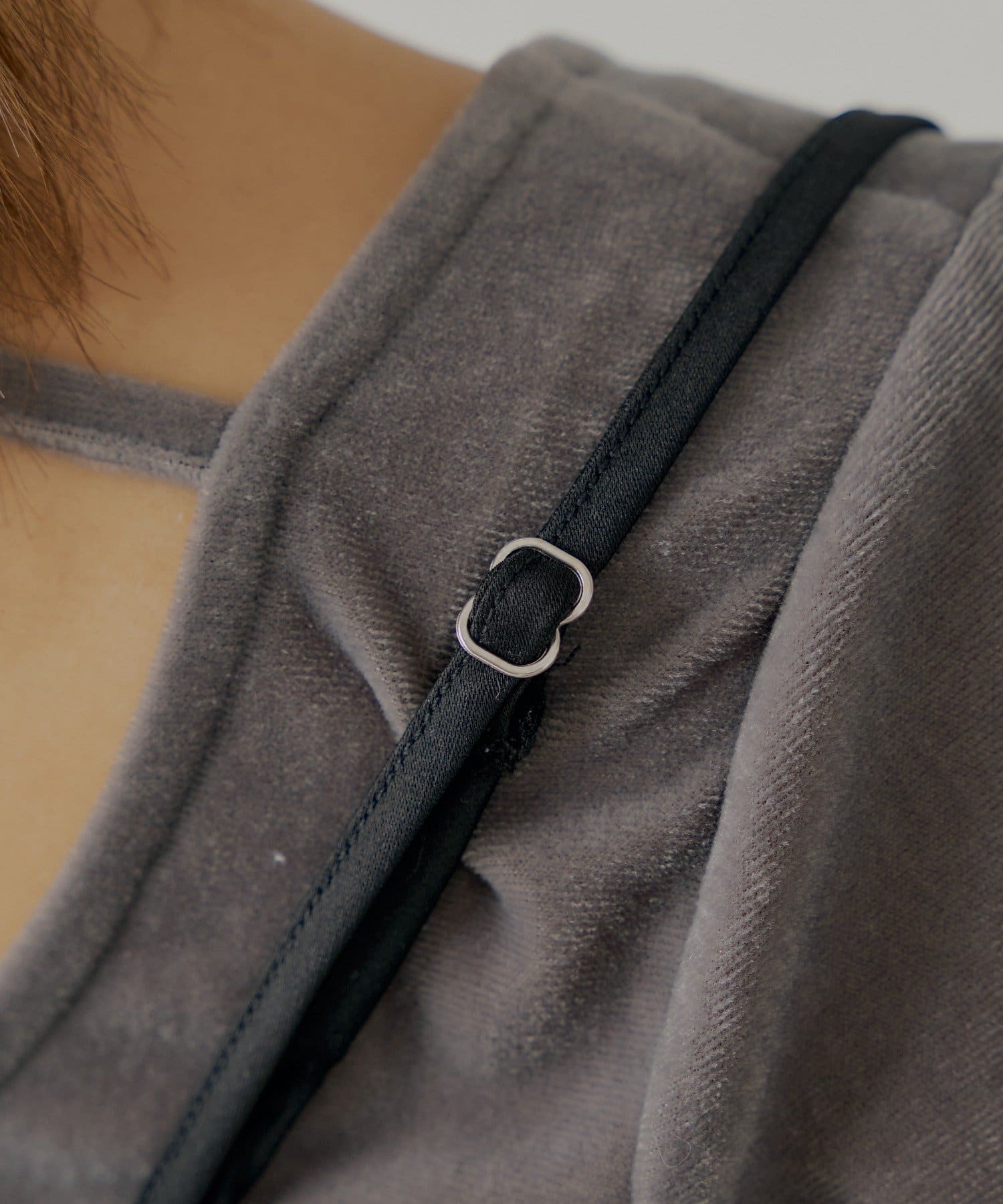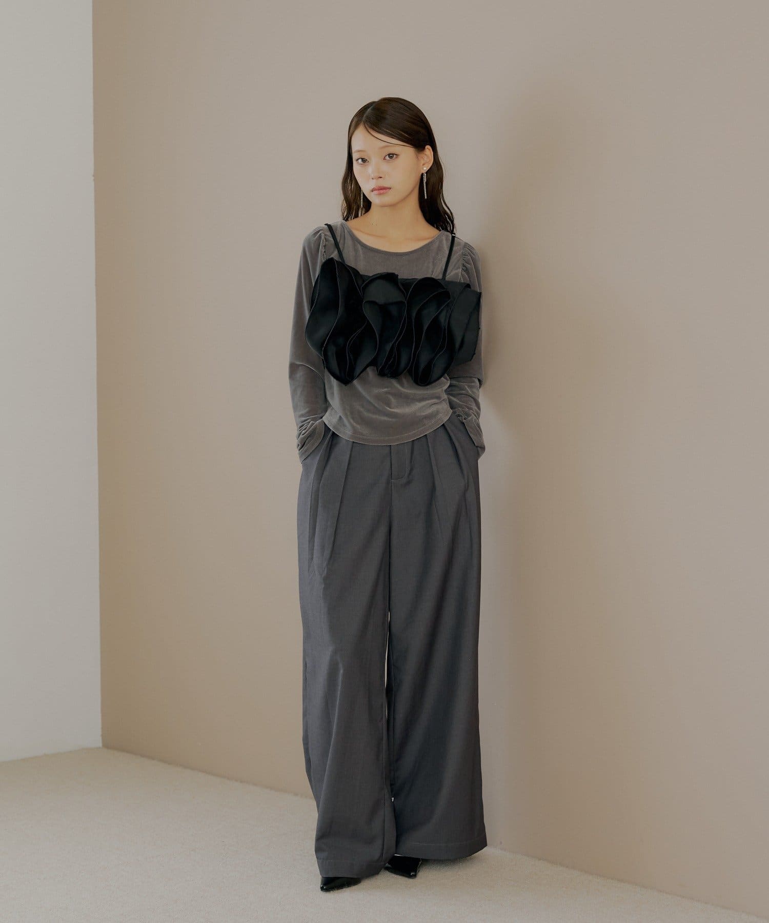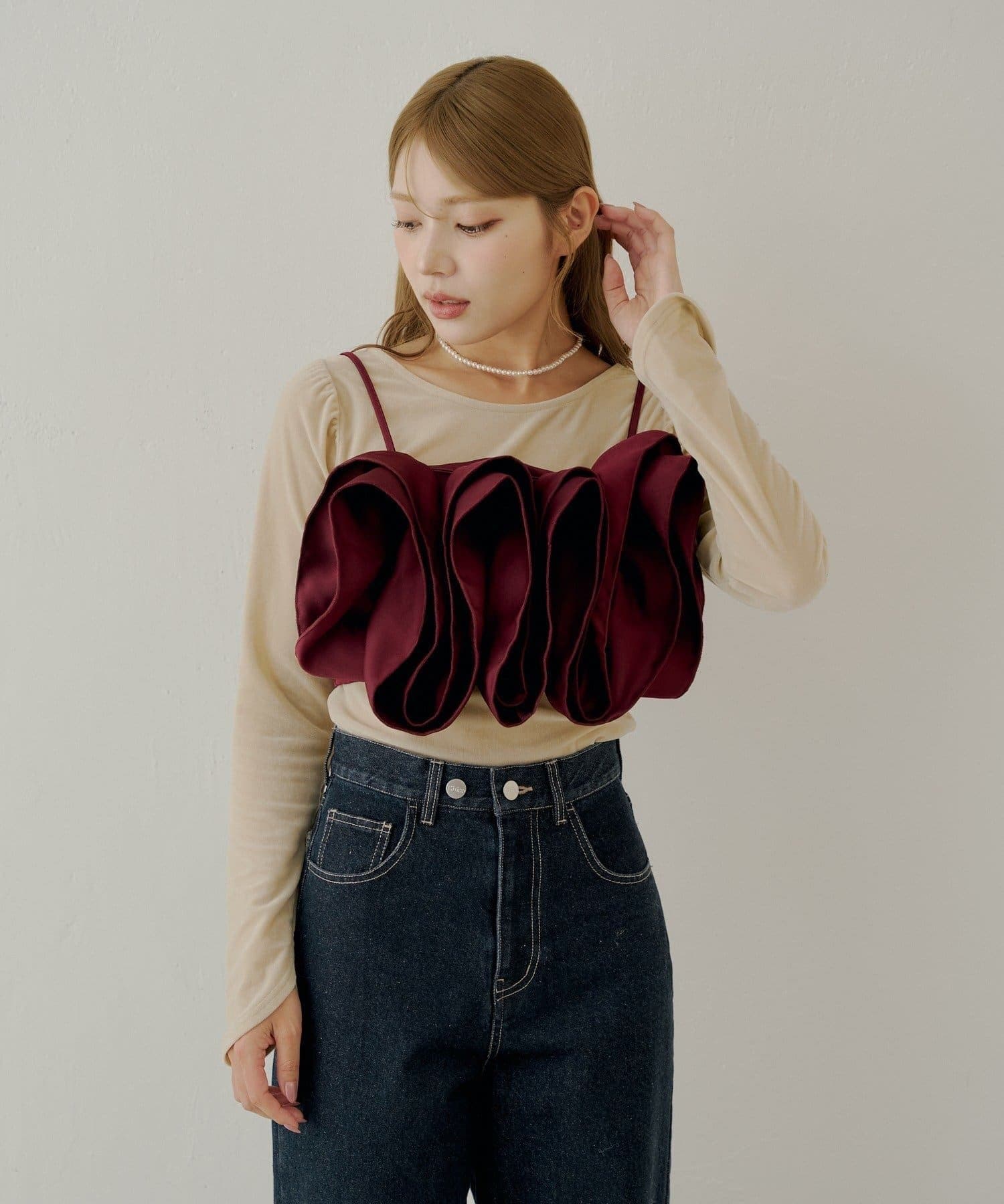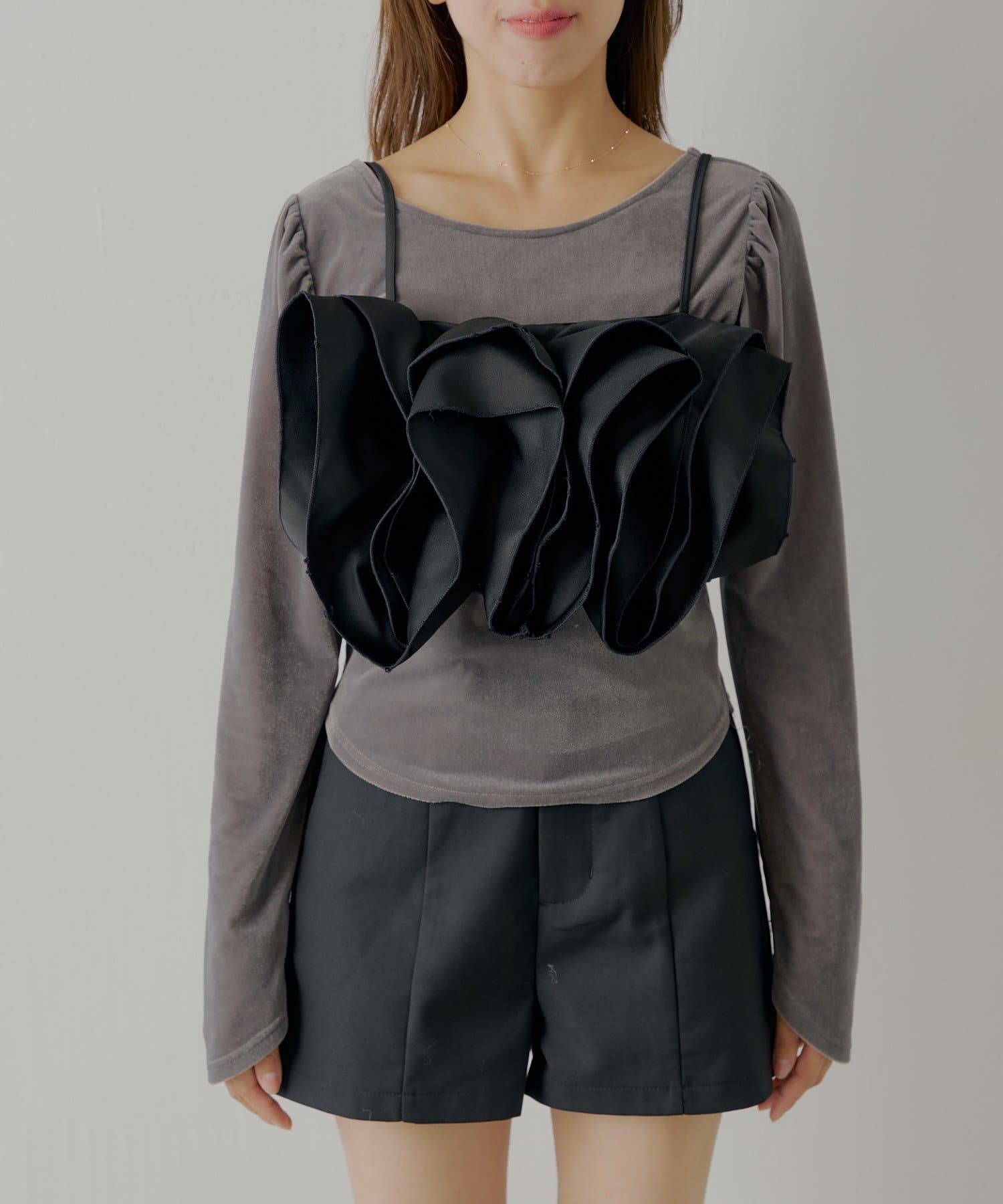 ・大胆なフリルが目を引くベアキャミソールと、上品な光沢感が魅力のベロアトップスのセットアイテム。