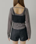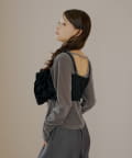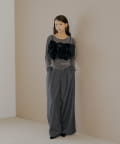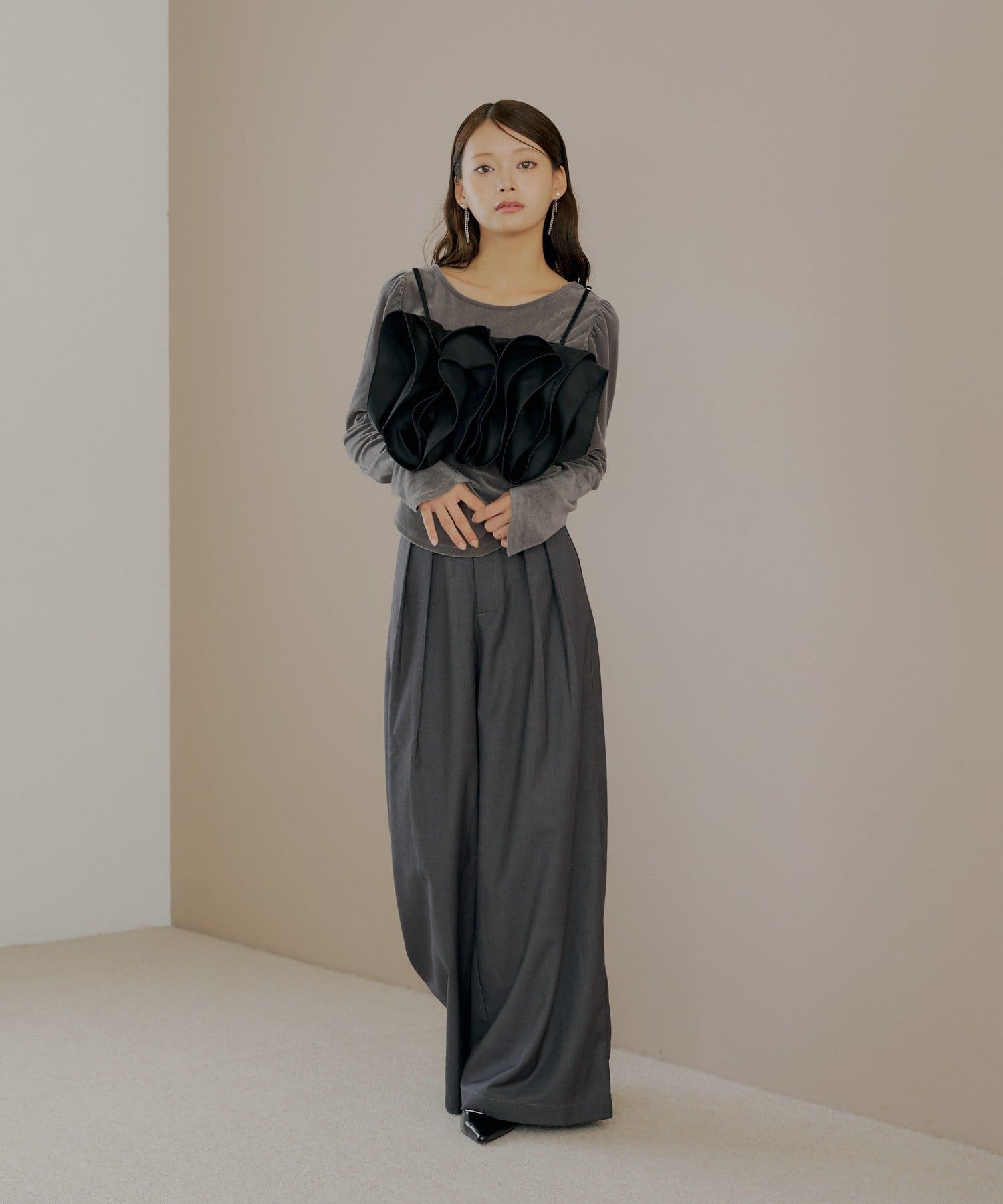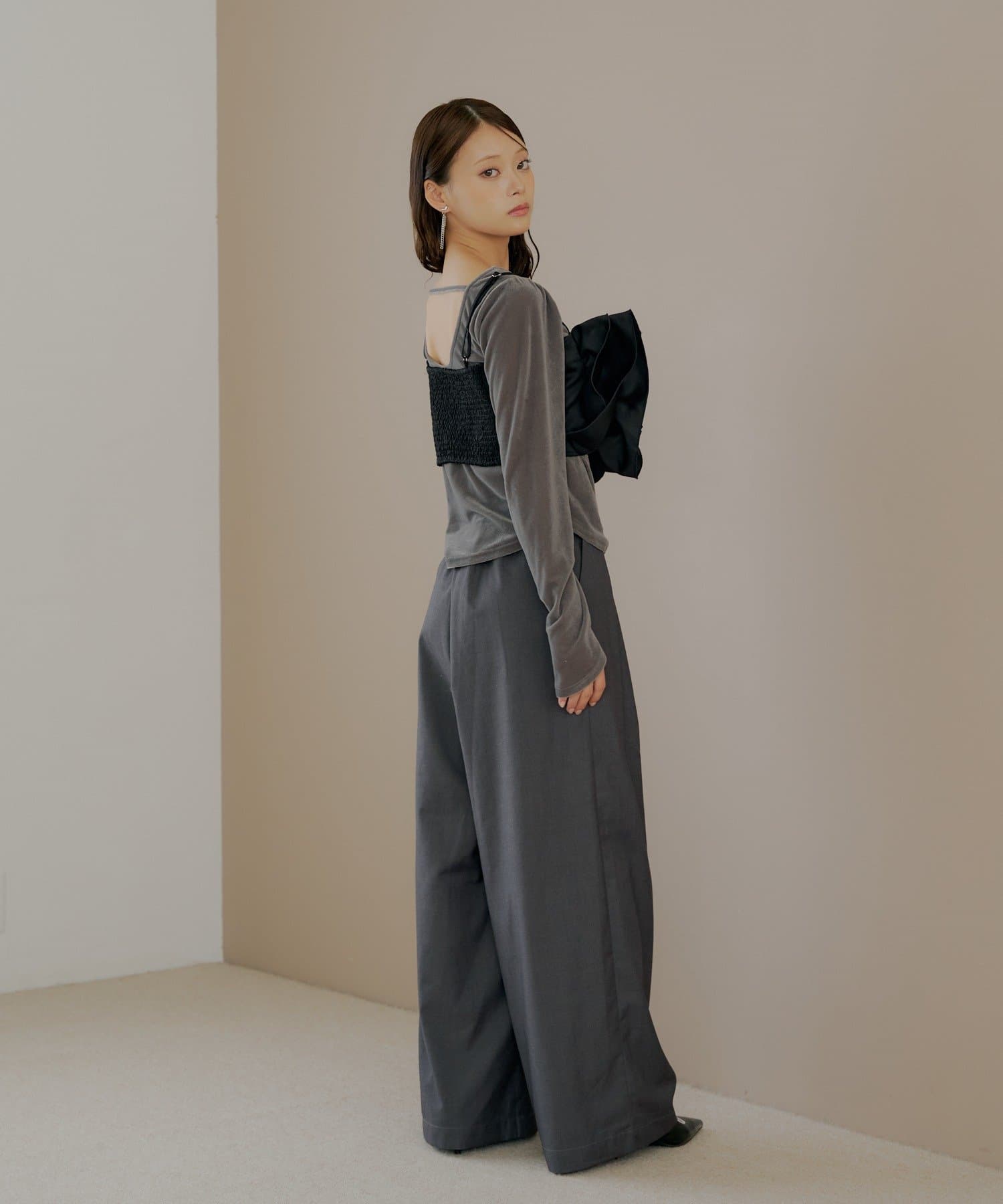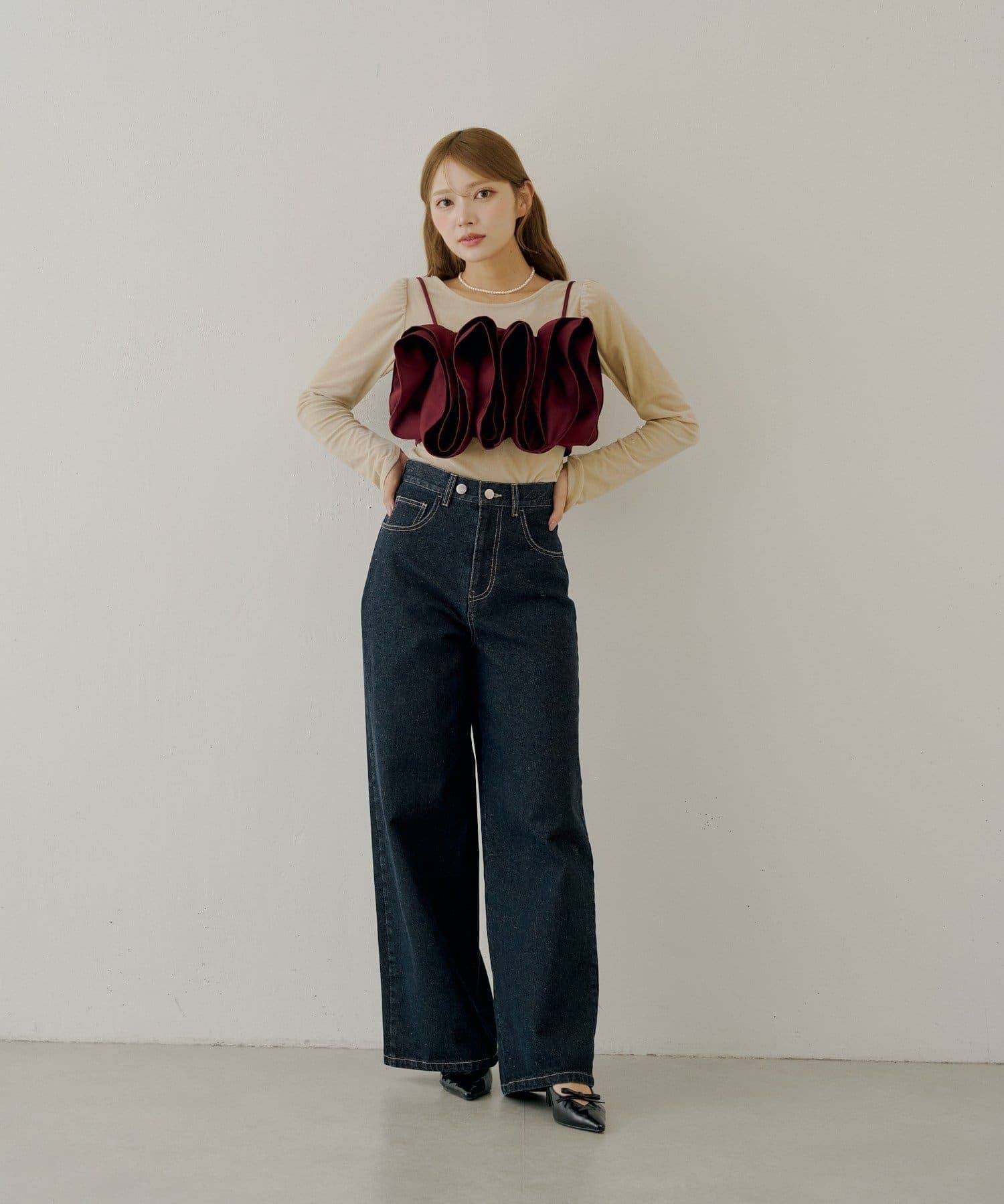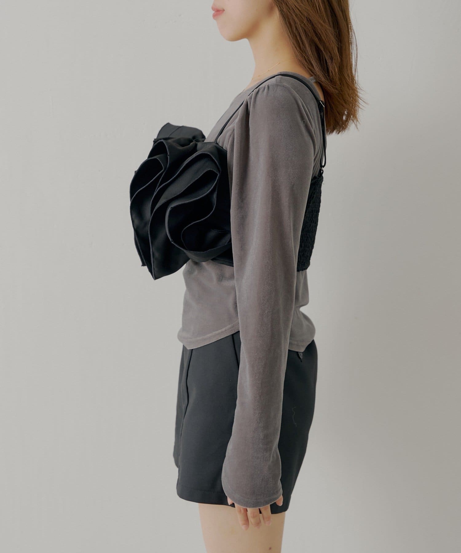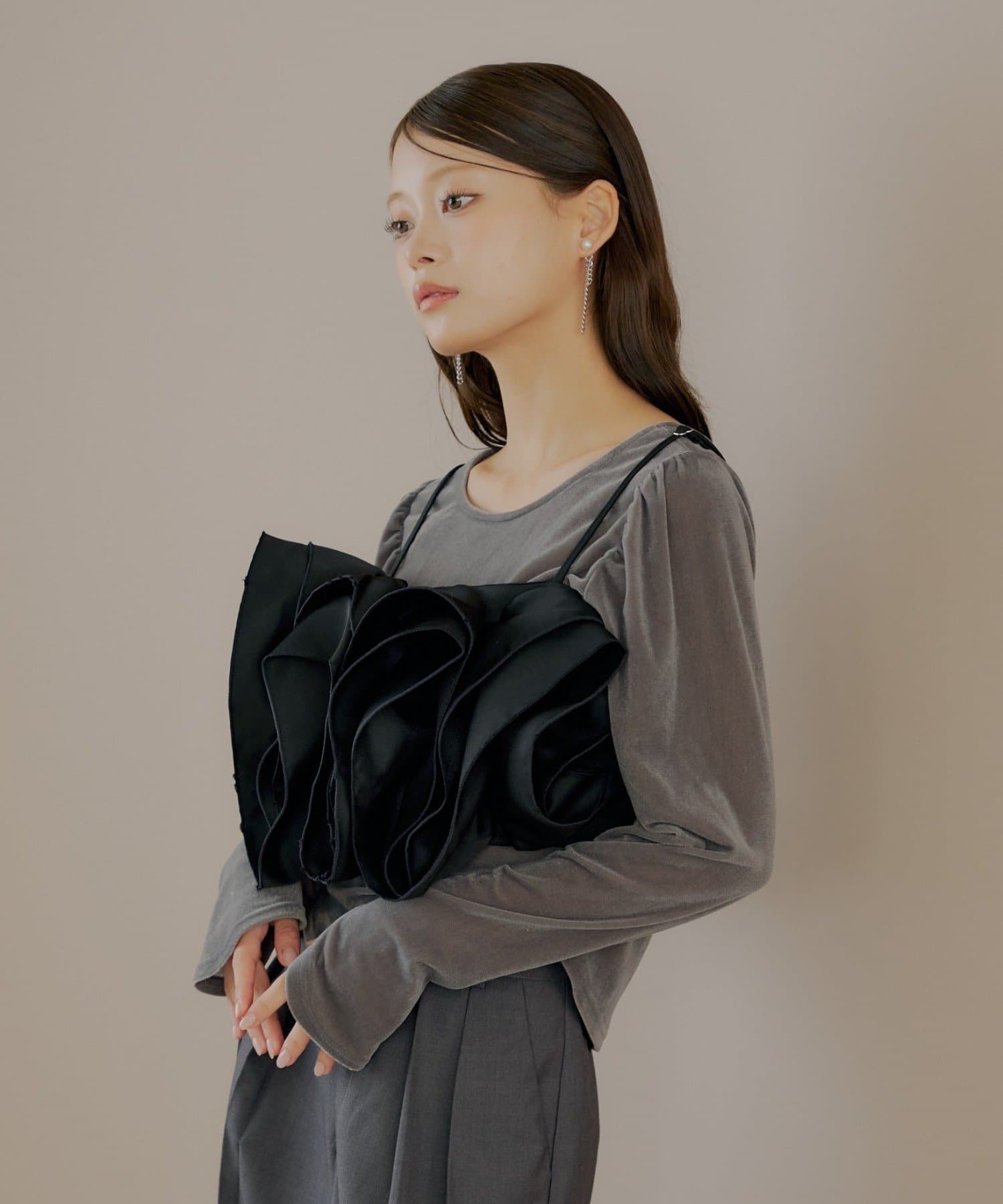 ・大胆なフリルが目を引くベアキャミソールと、上品な光沢感が魅力のベロアトップスのセットアイテム。
