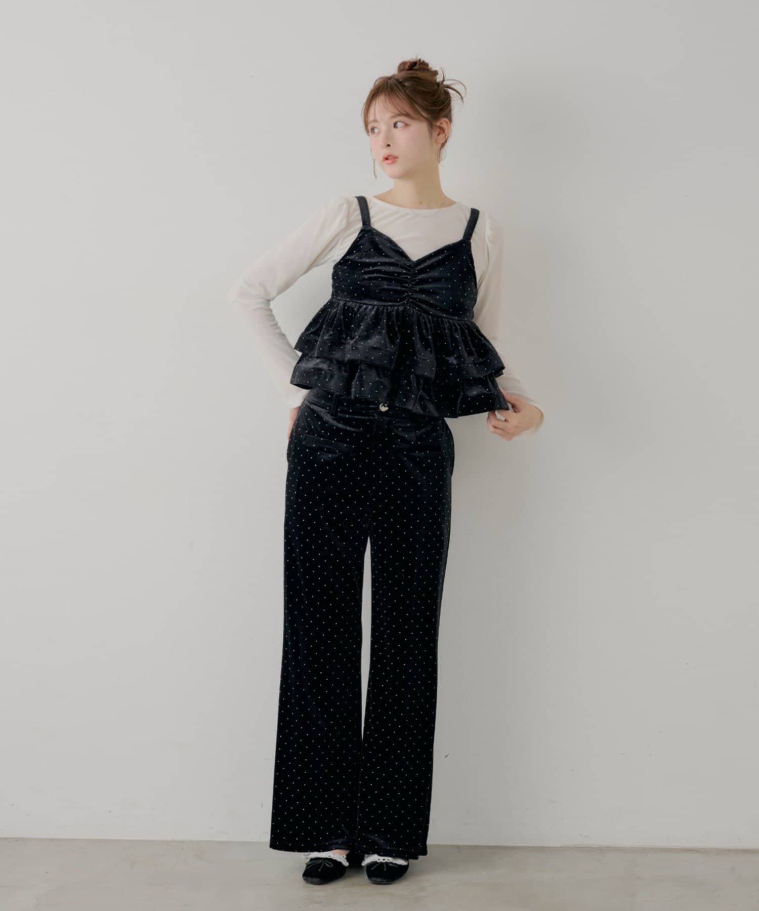 ・ベロア素材ならではの、深みのある色合いと上品な光沢感が、コーディネートに奥行きと高級感をプラスします。