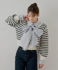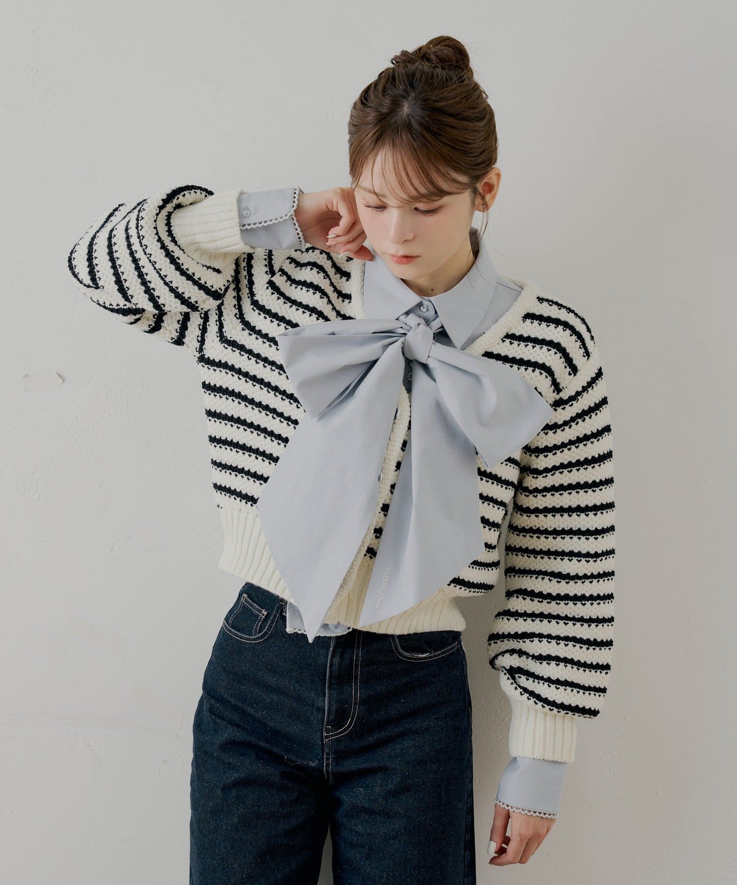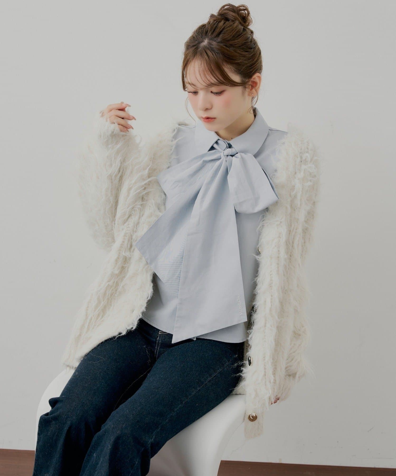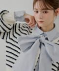 ・首元を華やかに彩るリボンは、結び方次第で雰囲気を変えられるのが魅力。