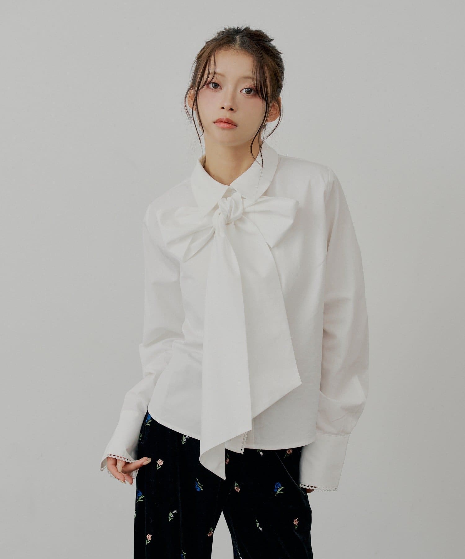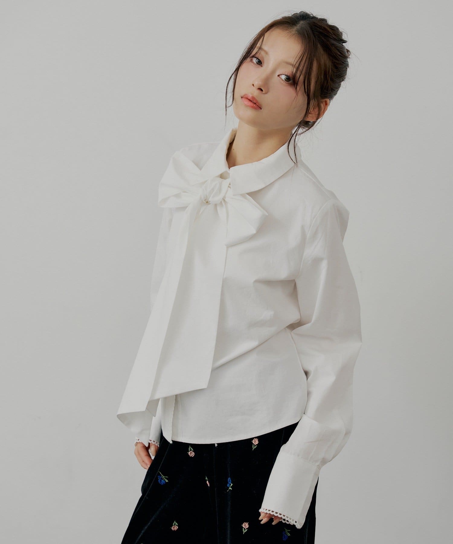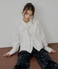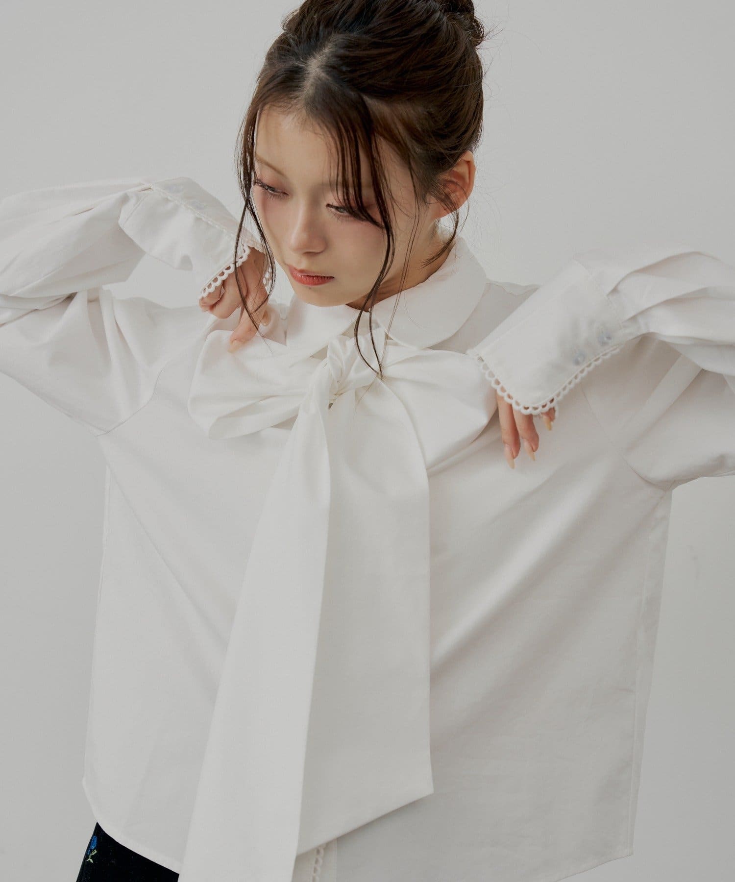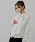・胸元のリボンと袖口の繊細なレースが、クラシカルで上品な印象を演出するデザインシャツ。