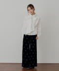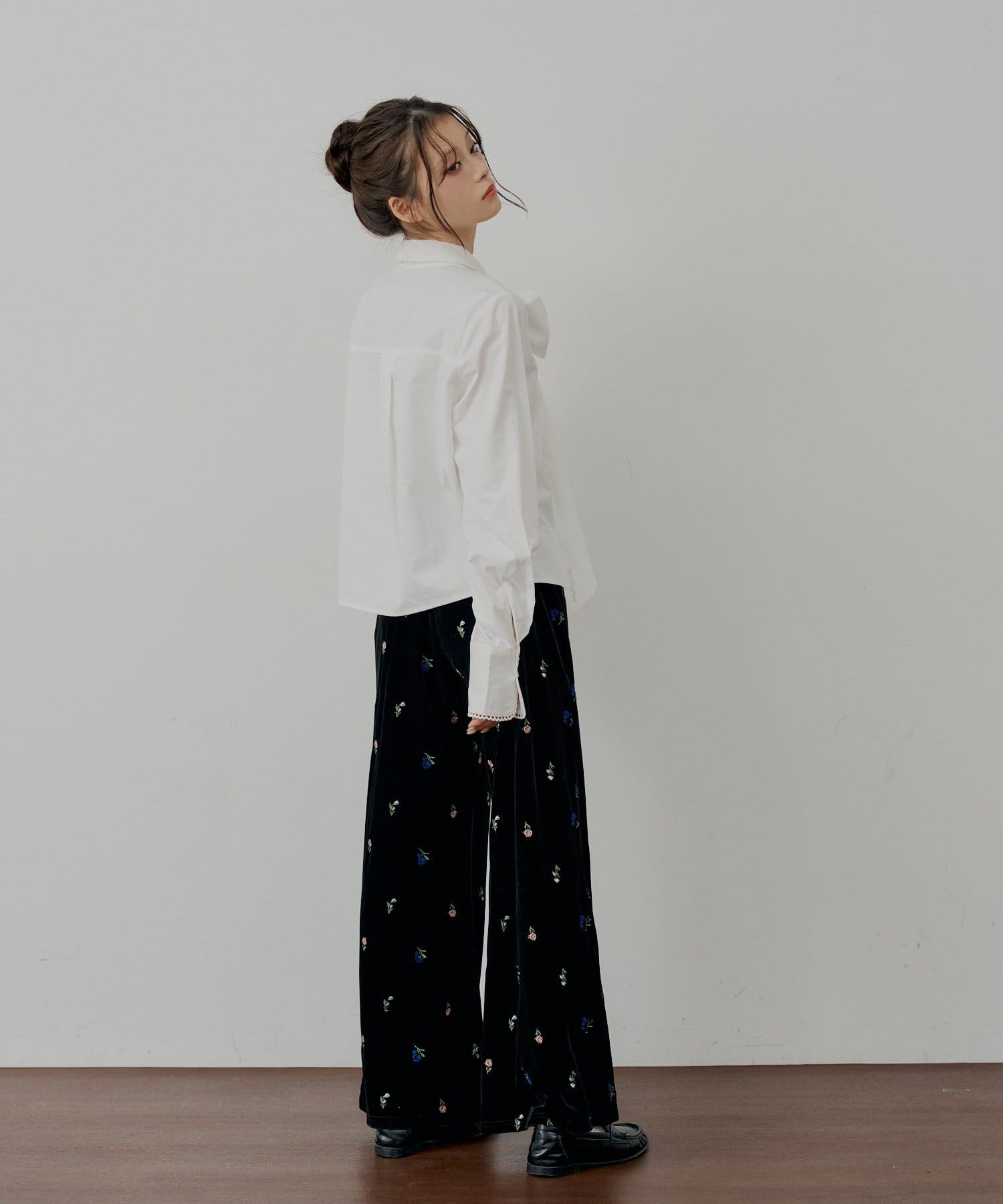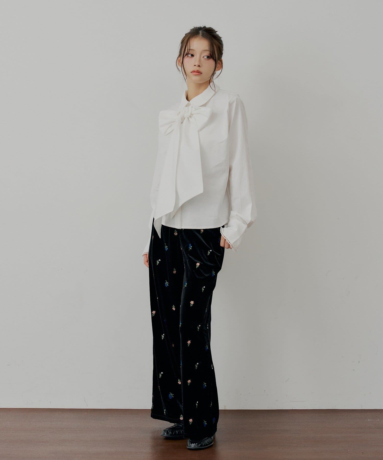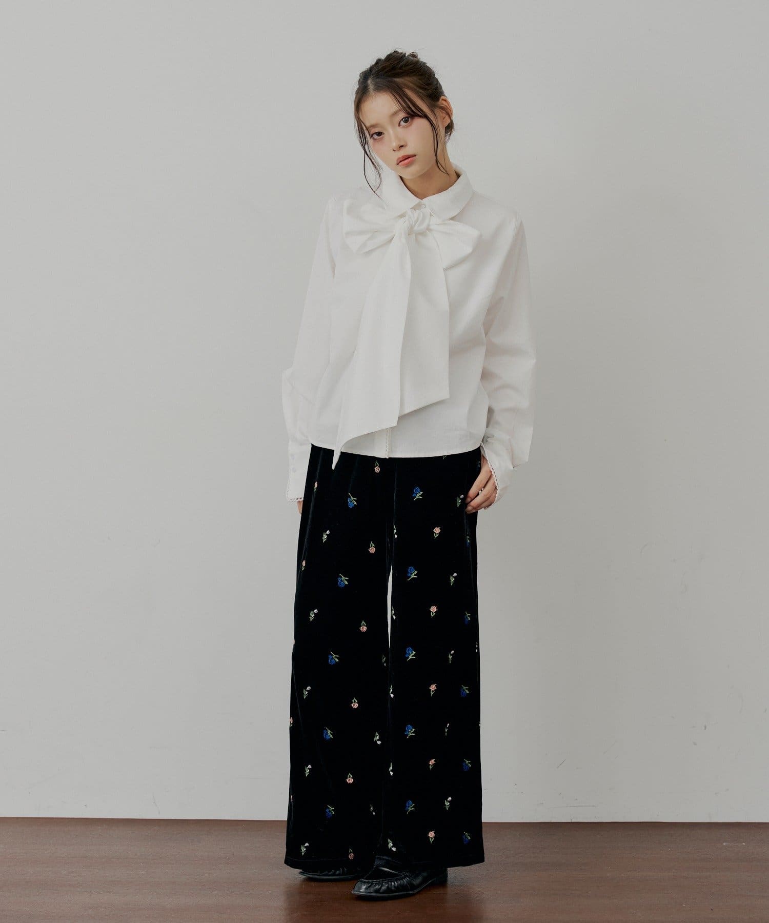 ・胸元のリボンと袖口の繊細なレースが、クラシカルで上品な印象を演出するデザインシャツ。