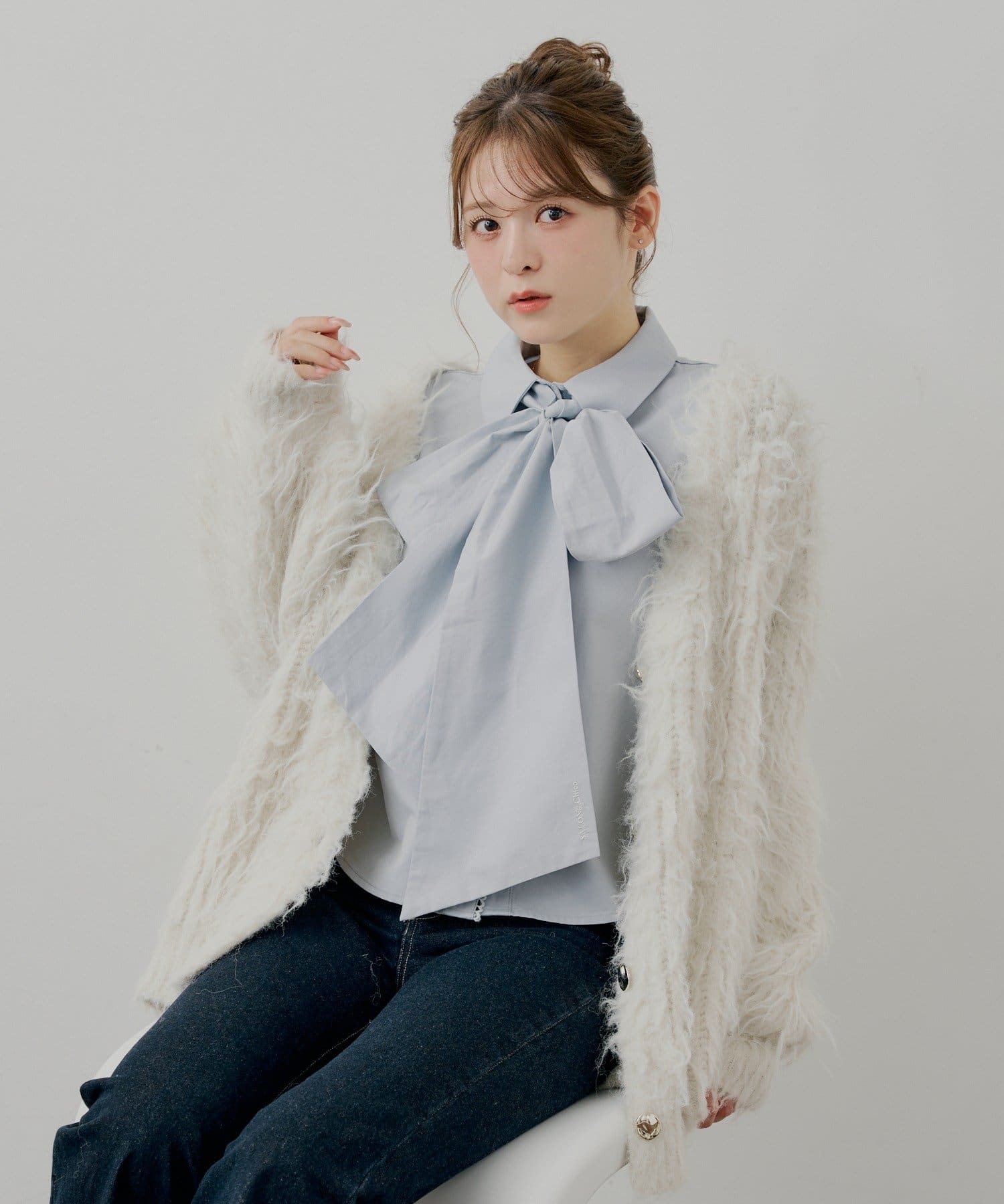 ・首元を華やかに彩るリボンは、結び方次第で雰囲気を変えられるのが魅力。