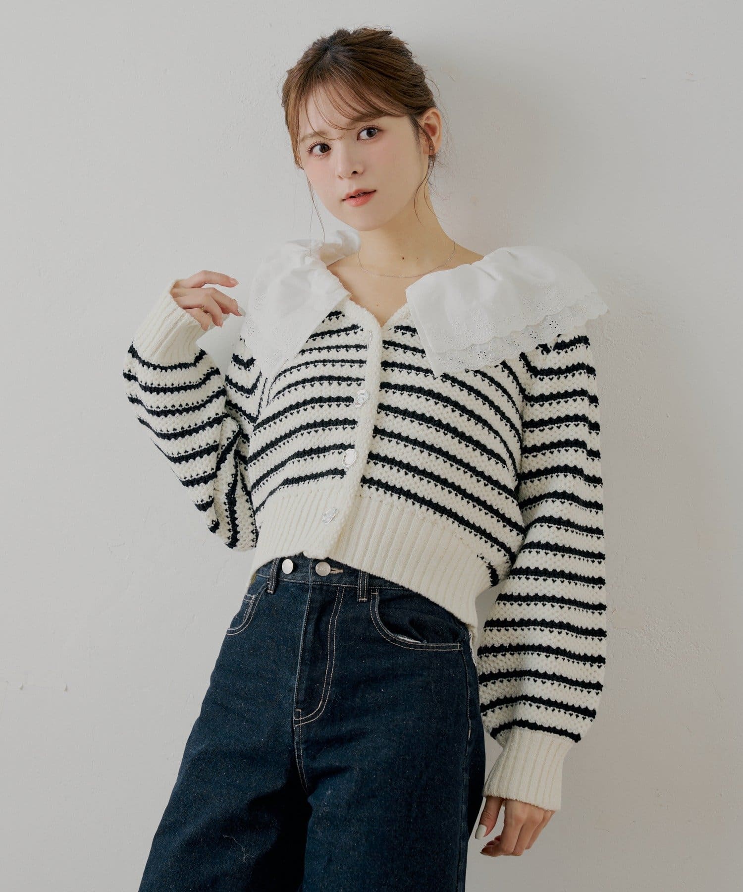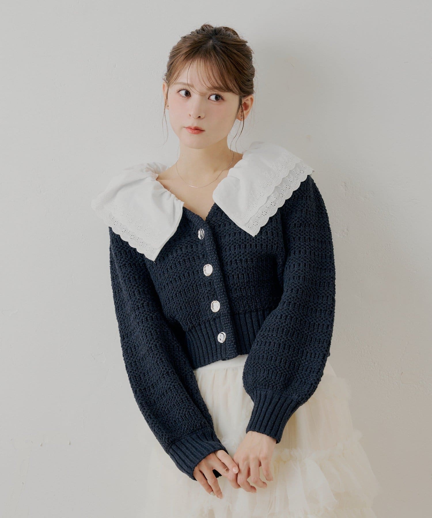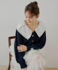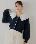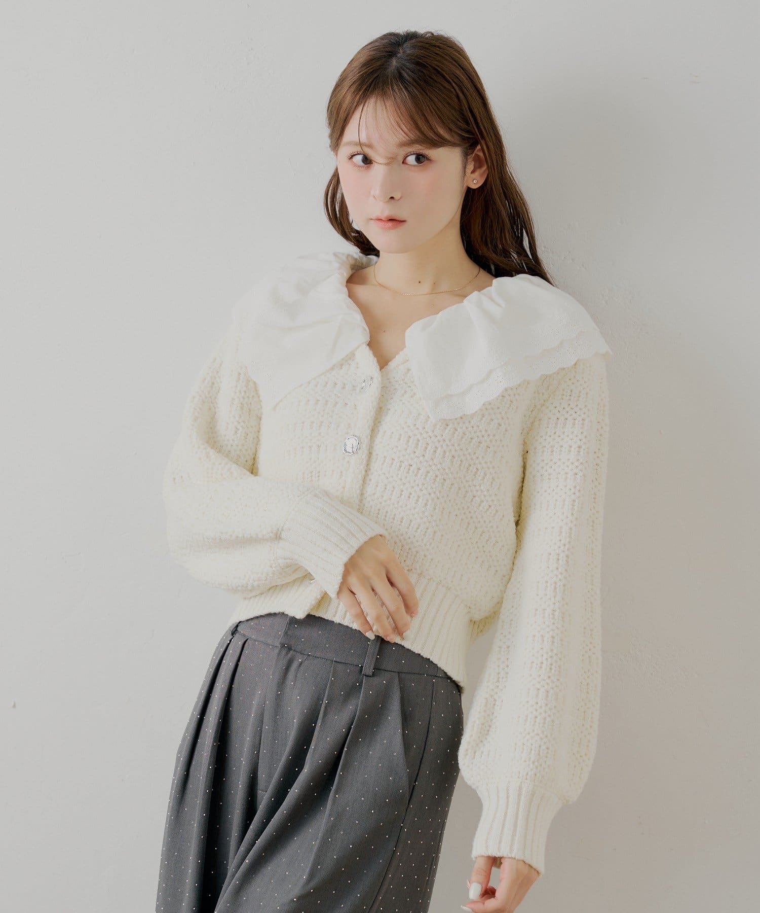 甘さと上品さを兼ね備えたダブルフリルカラー柄編みカーディガン登場!