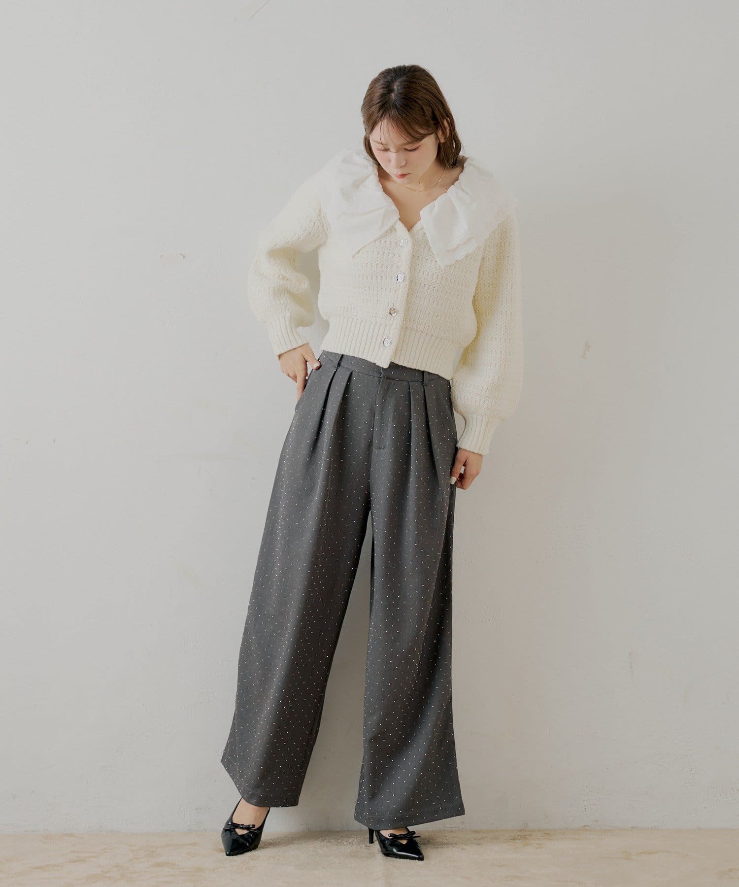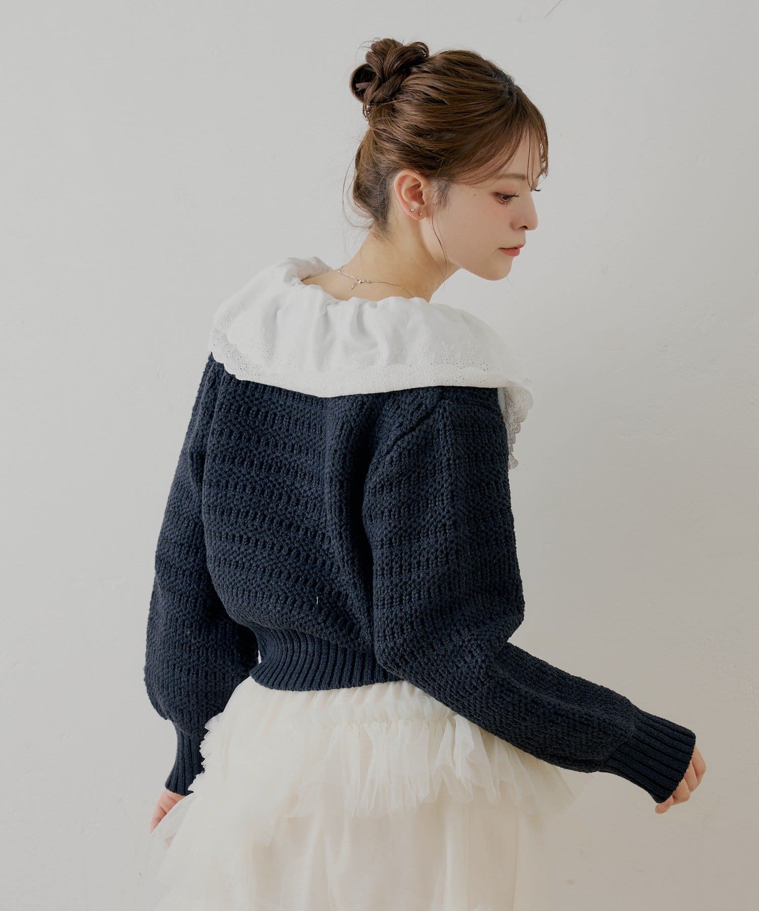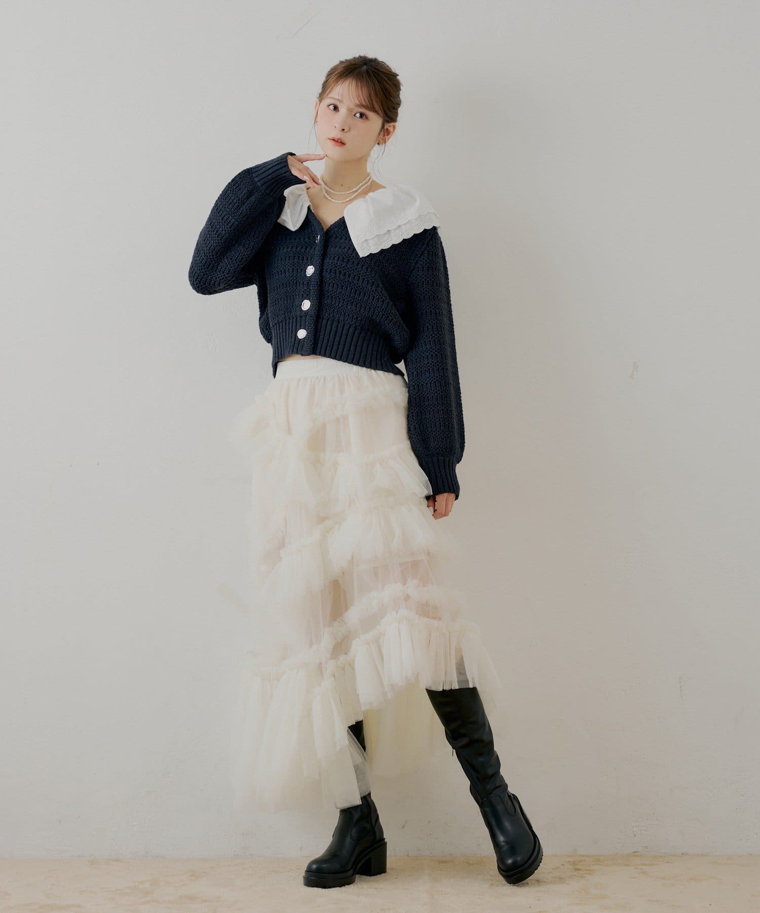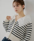 甘さと上品さを兼ね備えたダブルフリルカラー柄編みカーディガン登場!