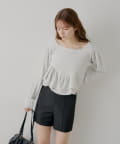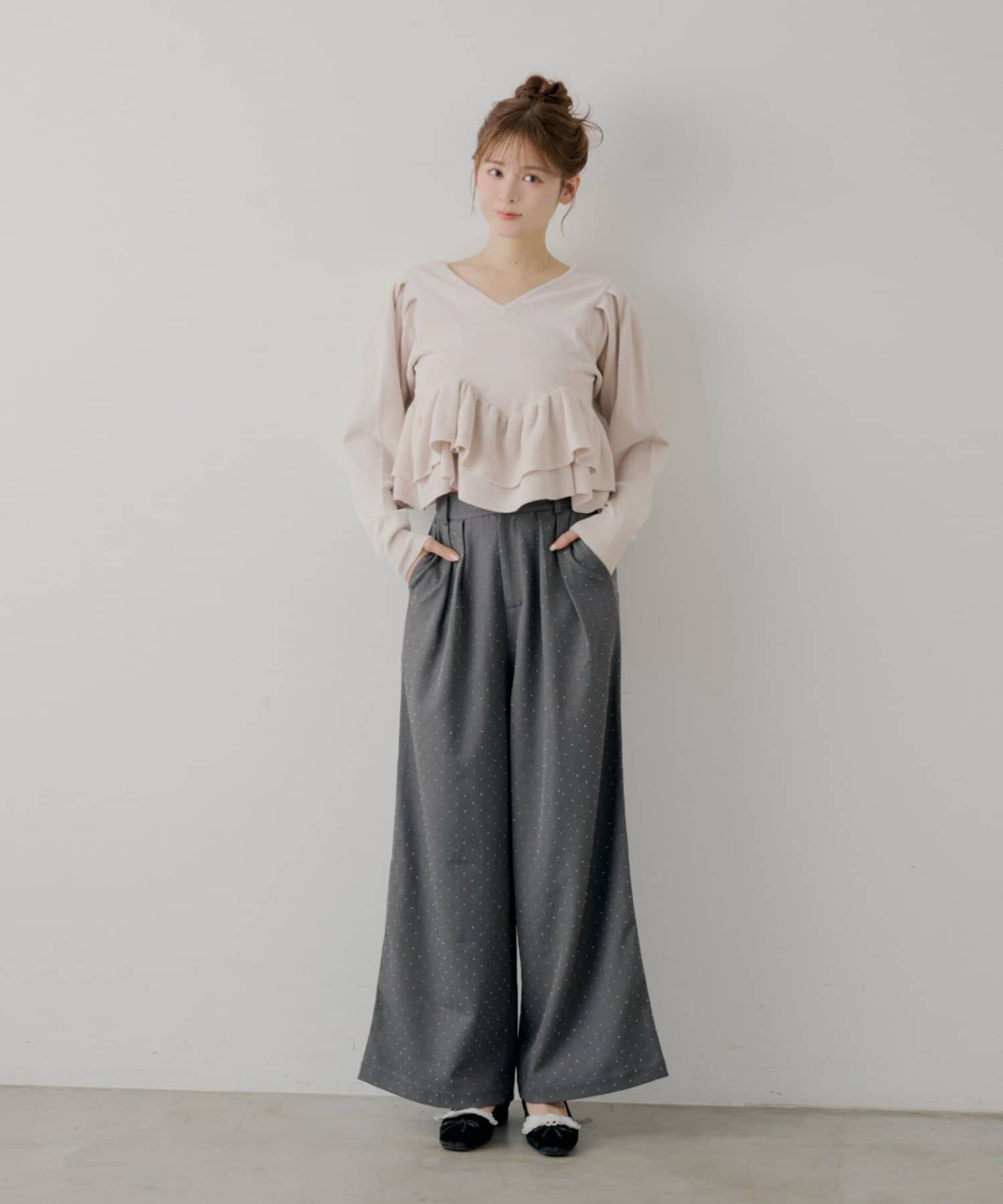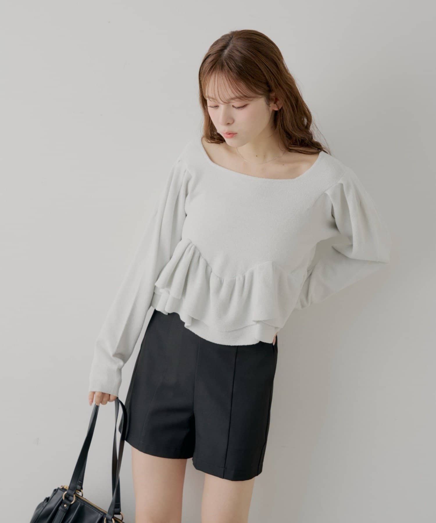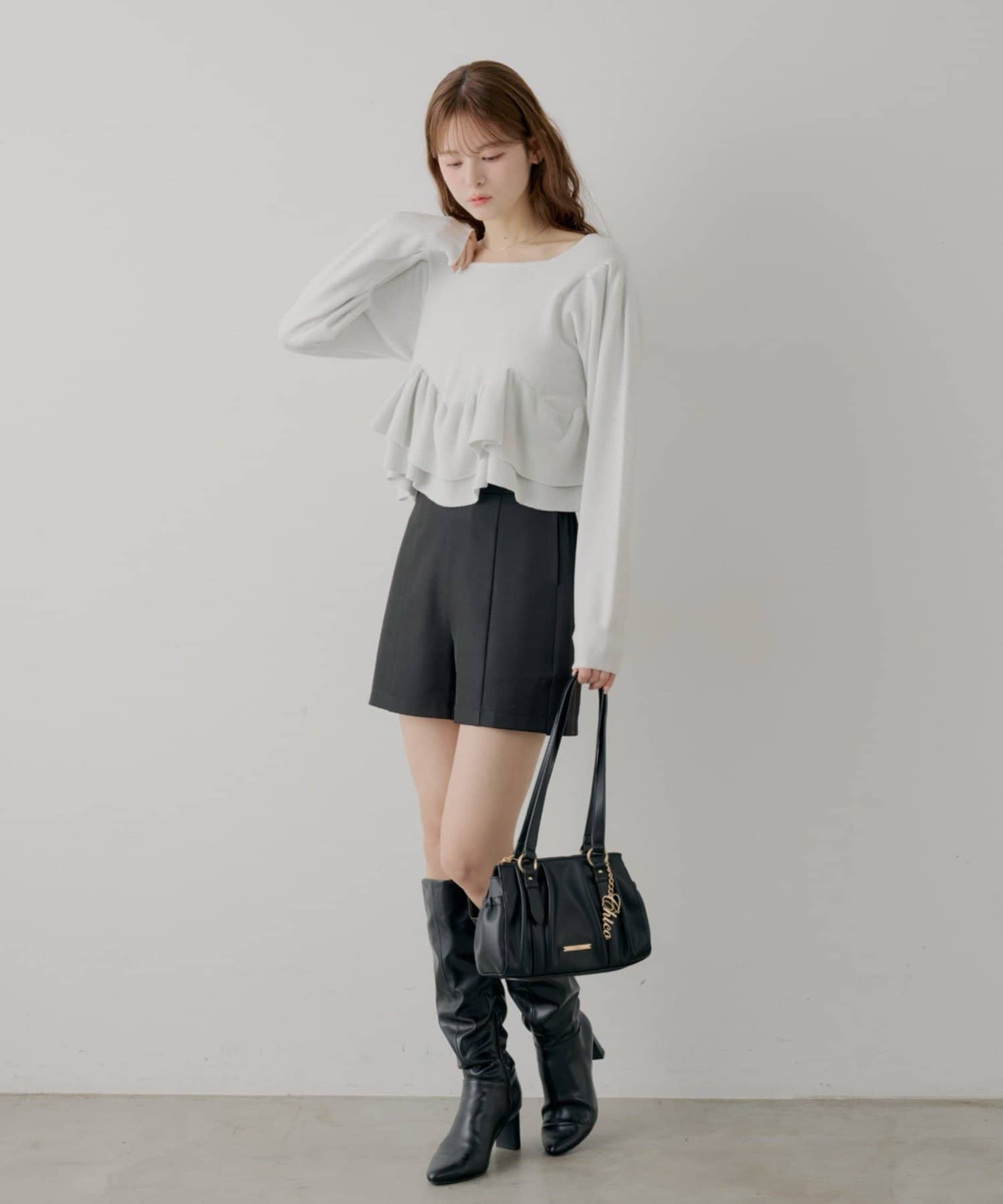 ・高めの位置から広がるペプラムデザインは、ウエストをキュッと細く見せ、脚長効果も◎