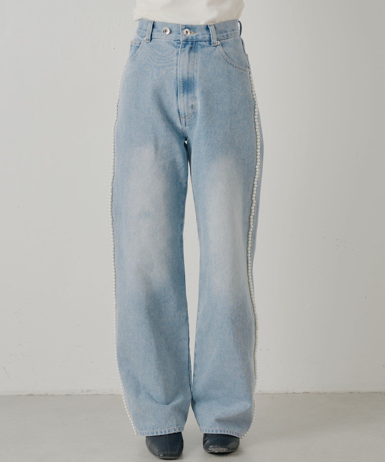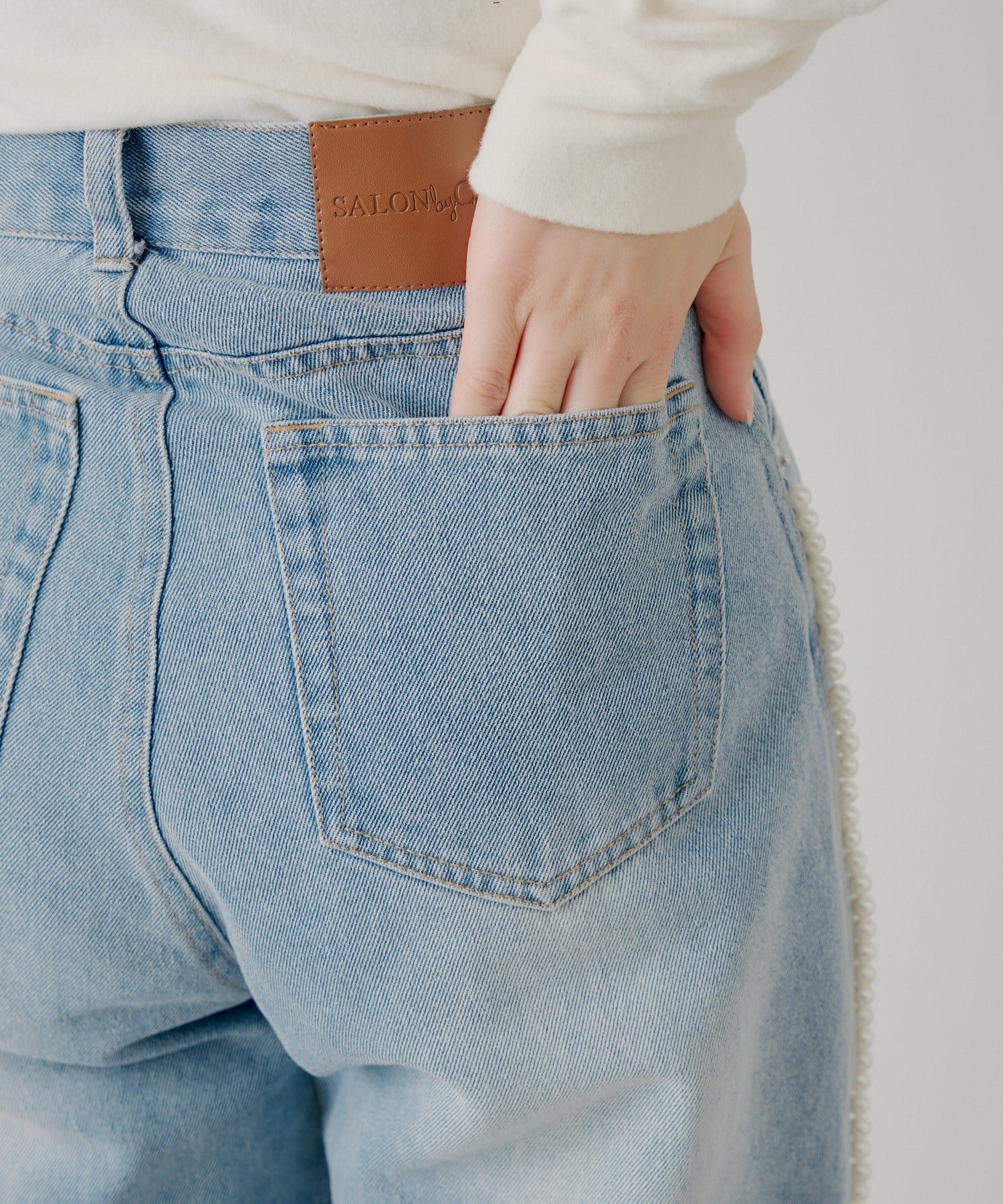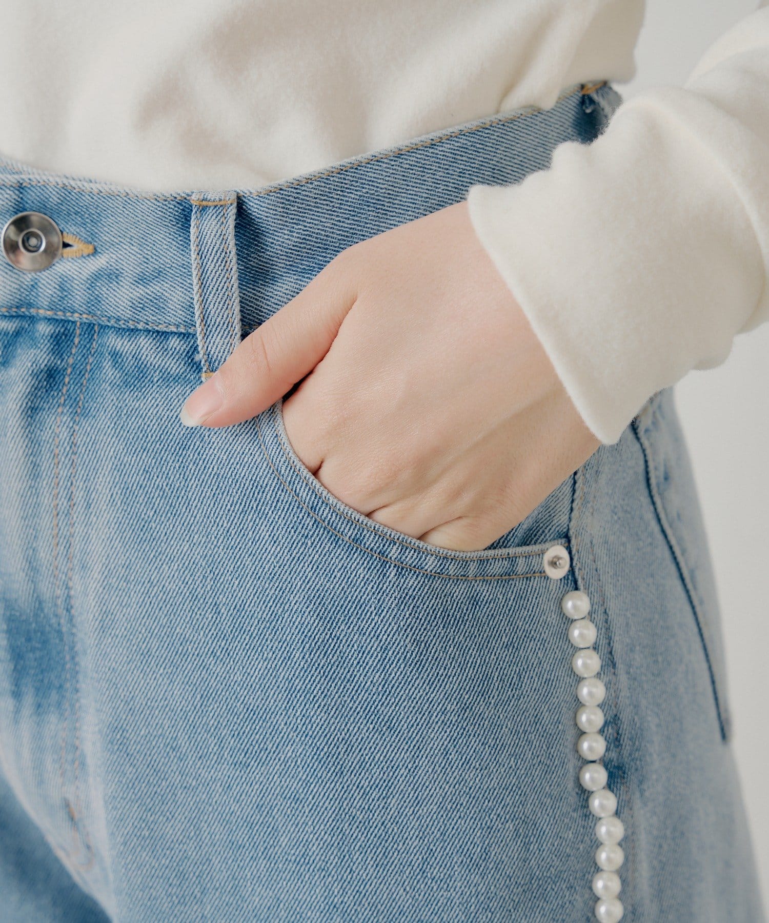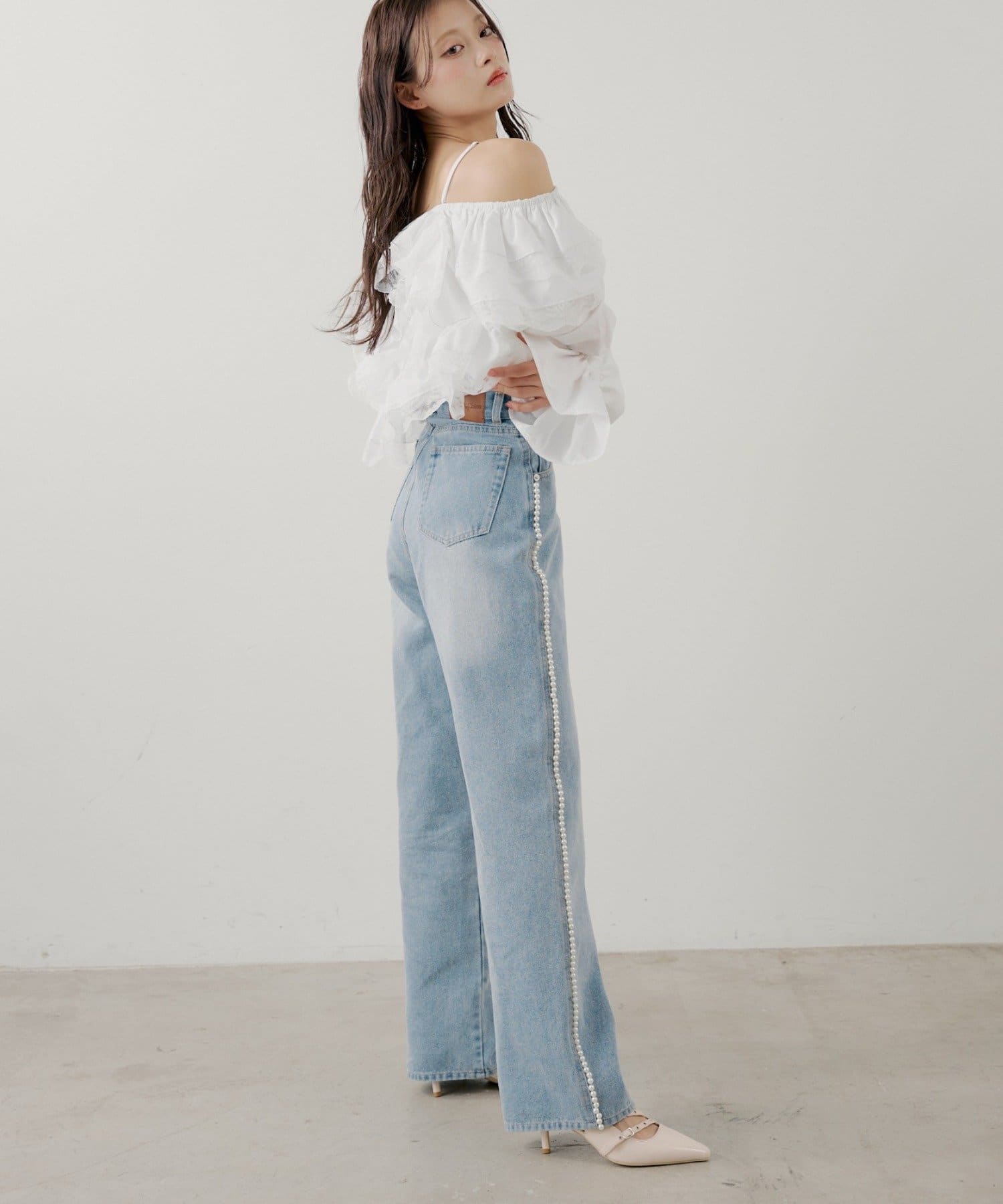 ・サイドにあしらわれた繊細なパールラインが、カジュアルなデニムスタイルに華やかさを添えます。