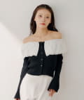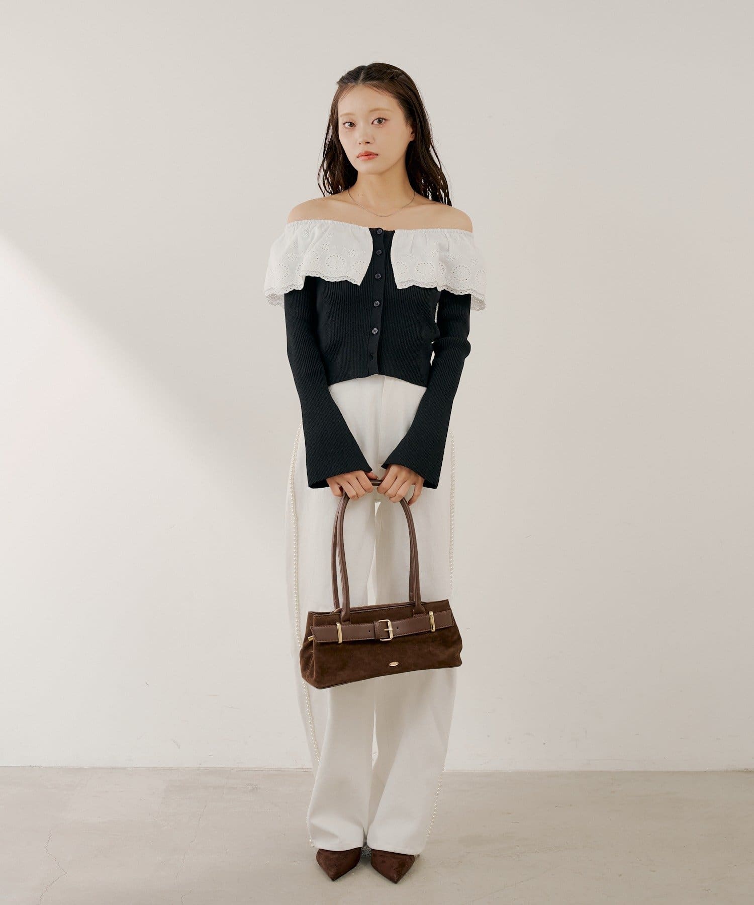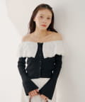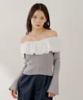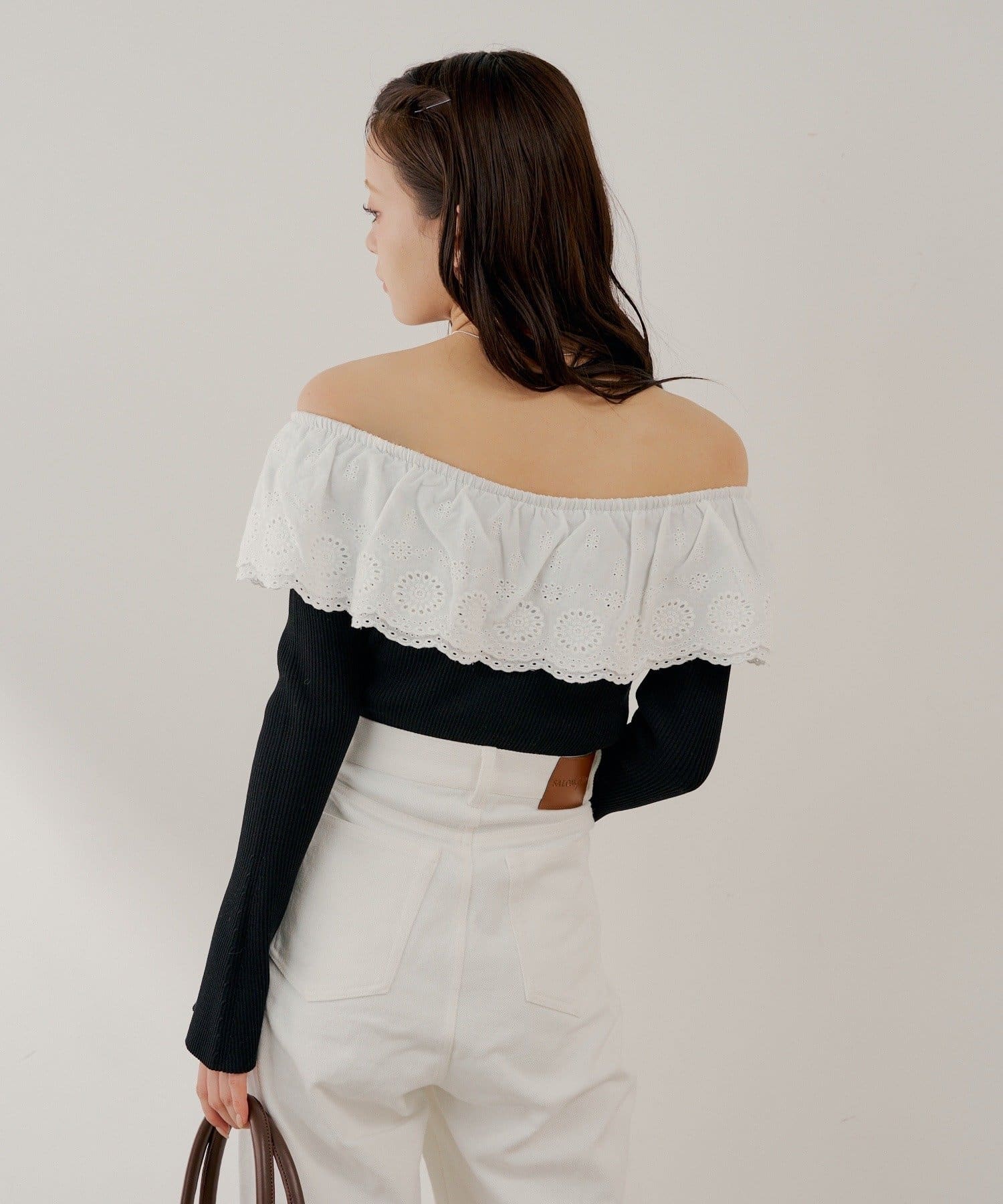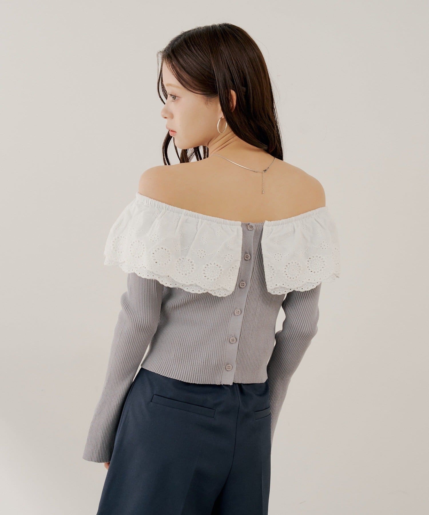 繊細なレースとフリルが大人の可愛らしさを引き立てるオフショルニット