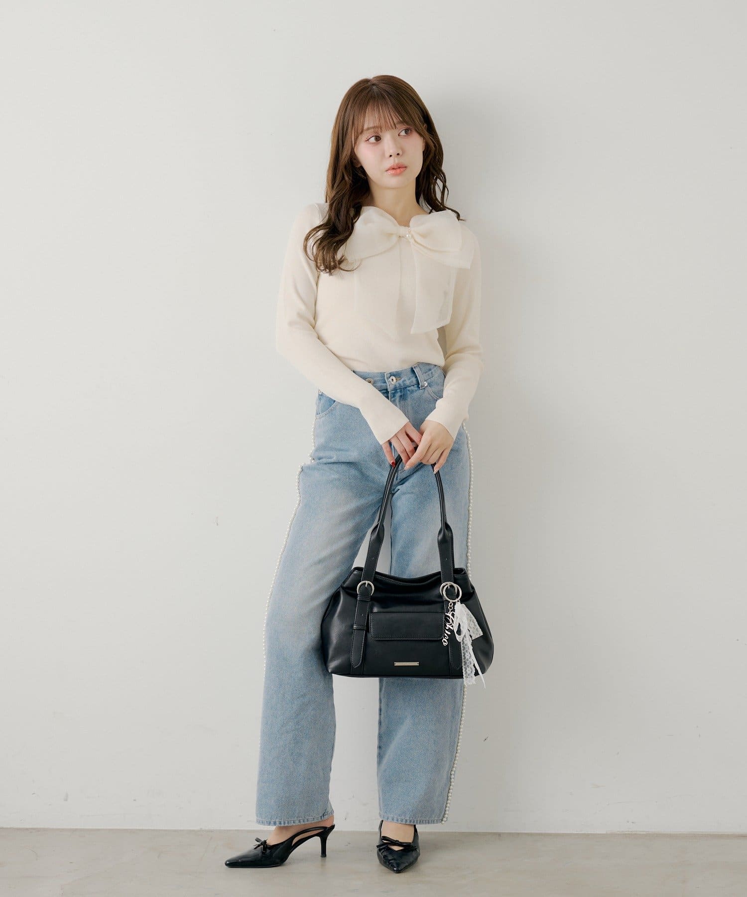 ・リボンの中央には、さりげないパール調のアクセントを施し、上品さをプラス。