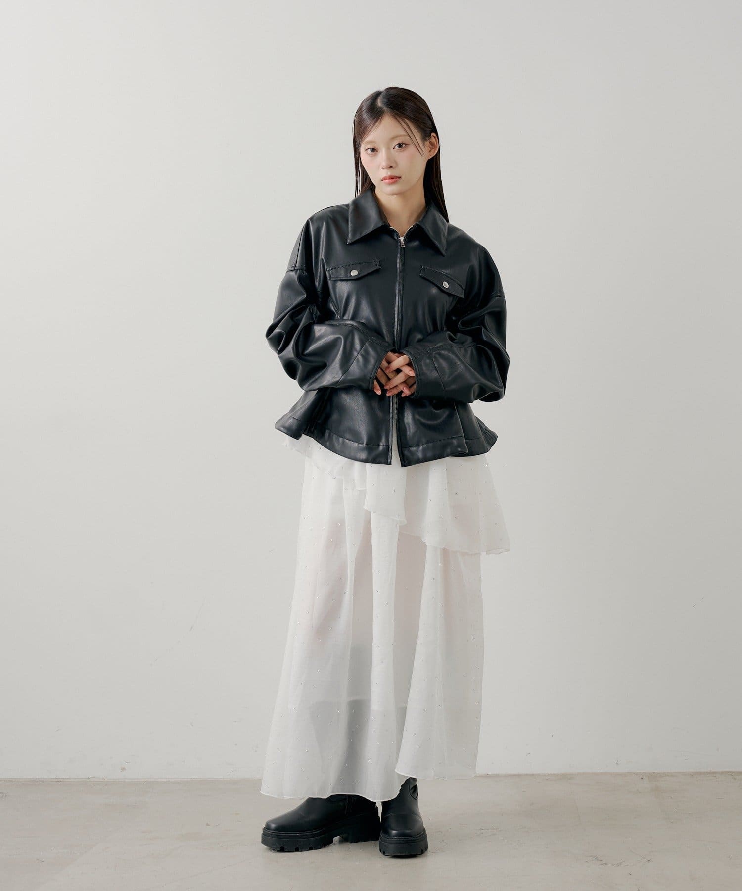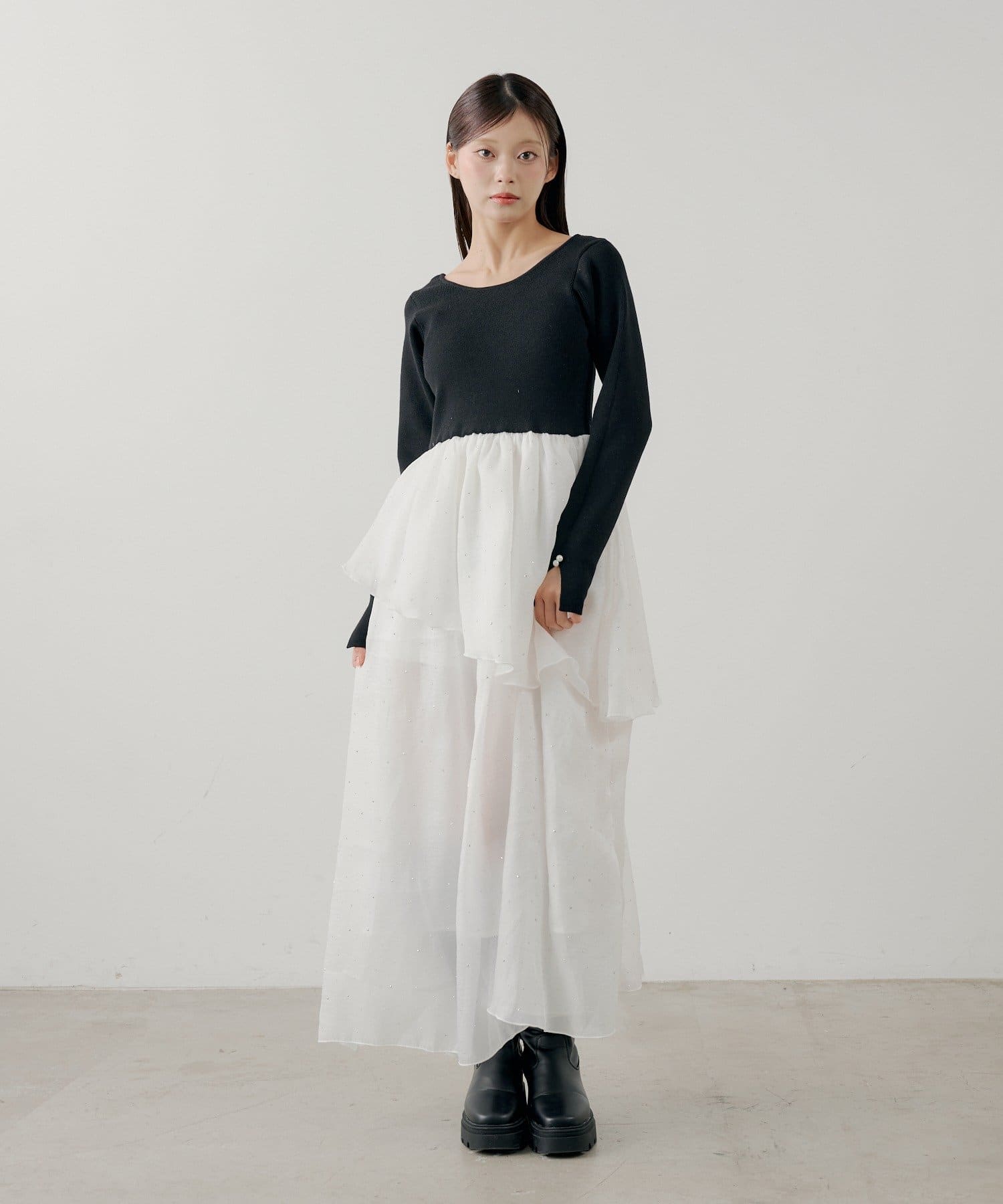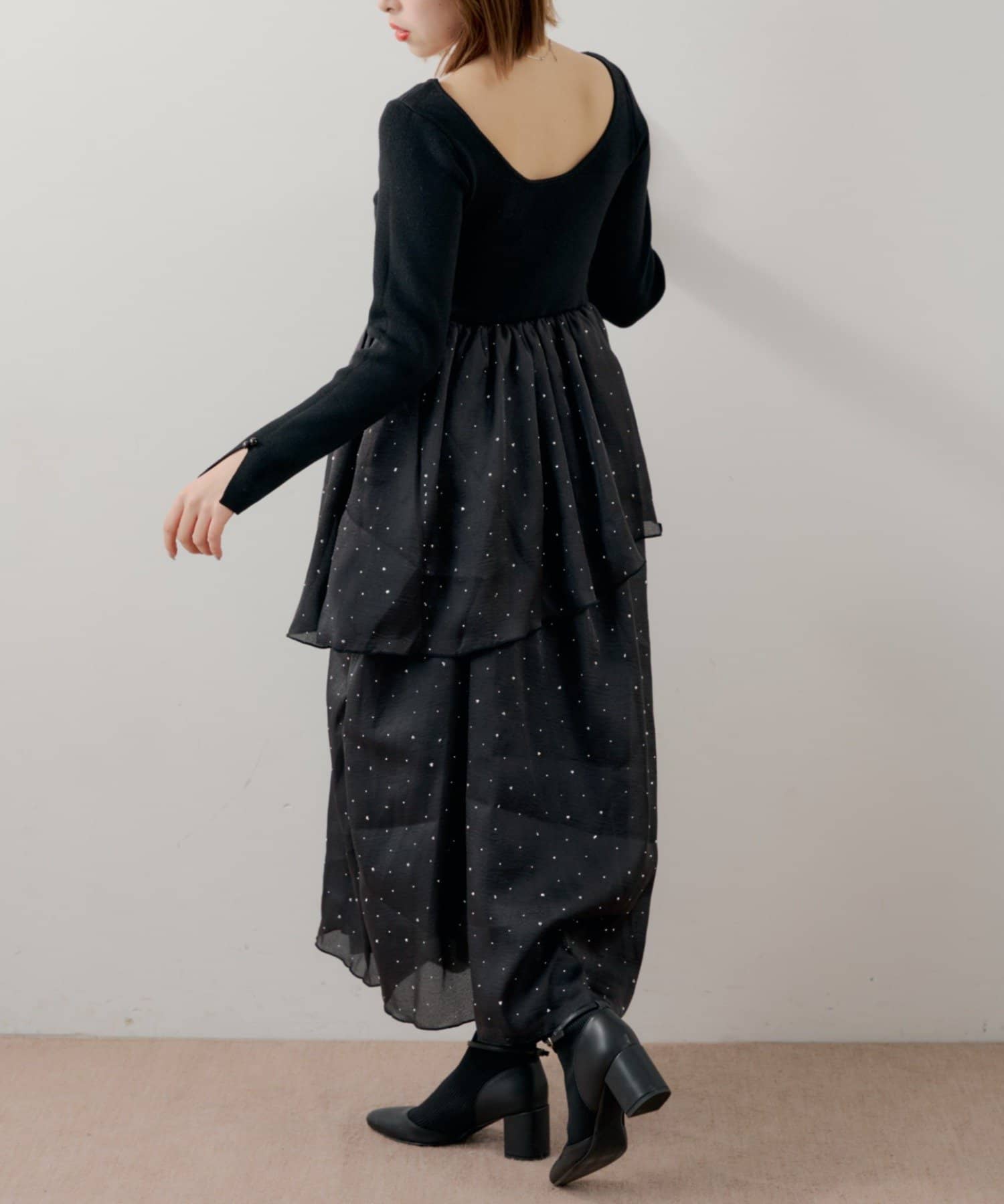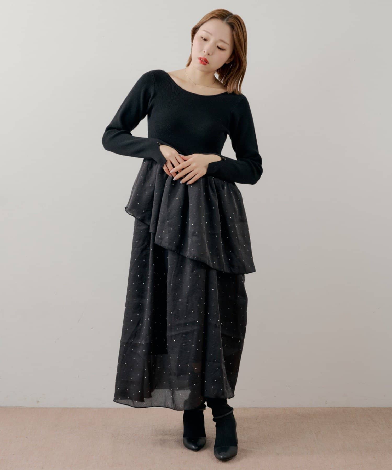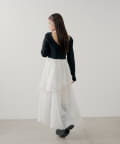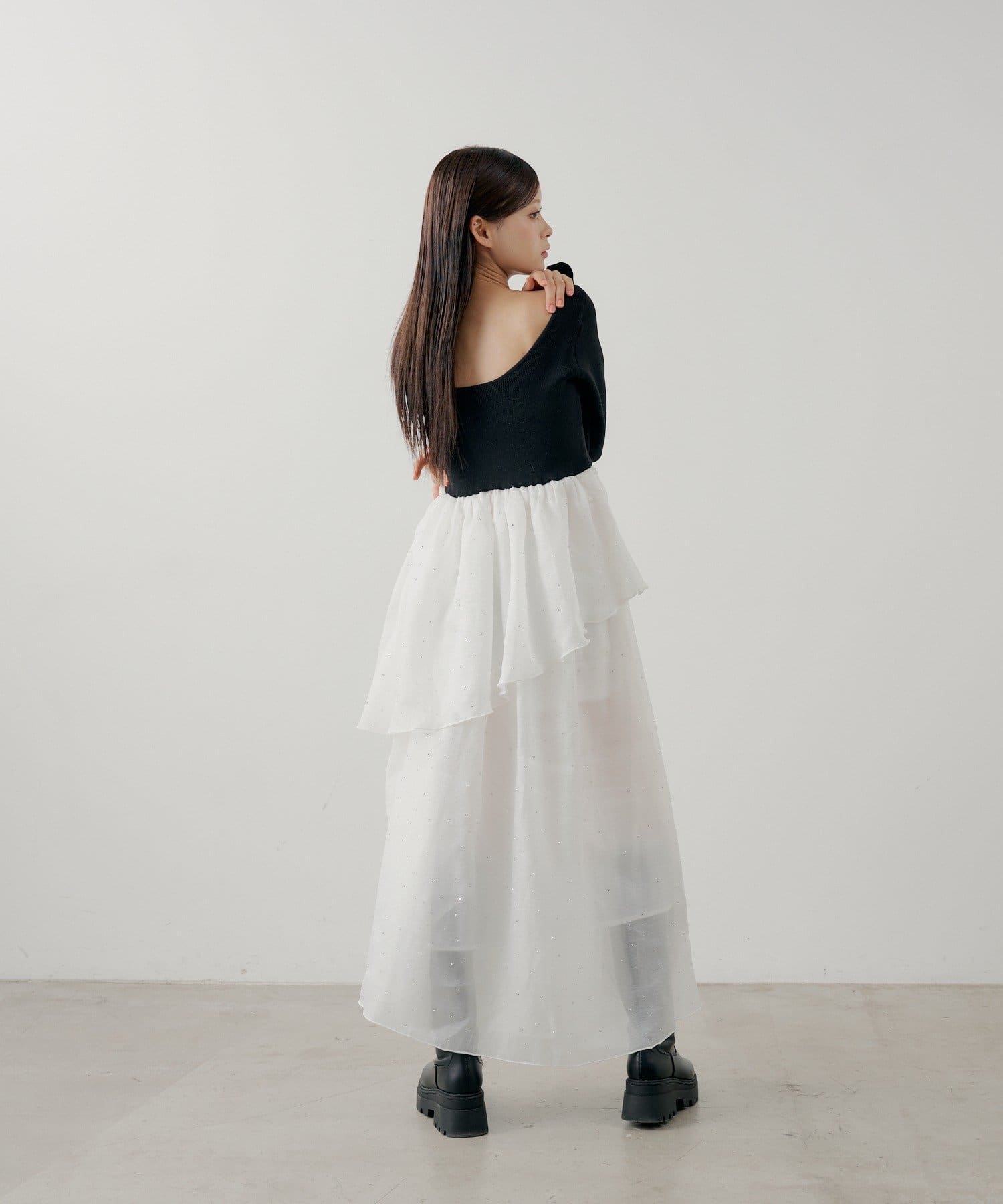 ・スカート部分のアシンメトリーなティアードデザインが、動きのある表情に。
