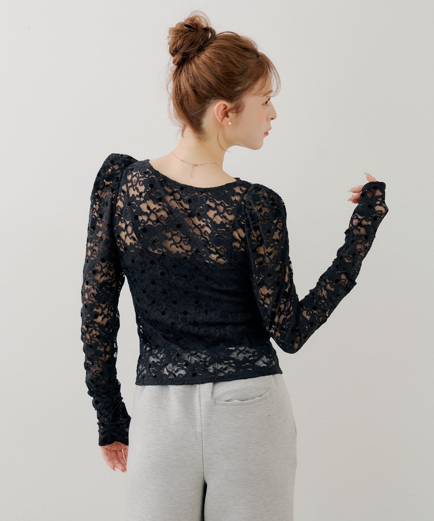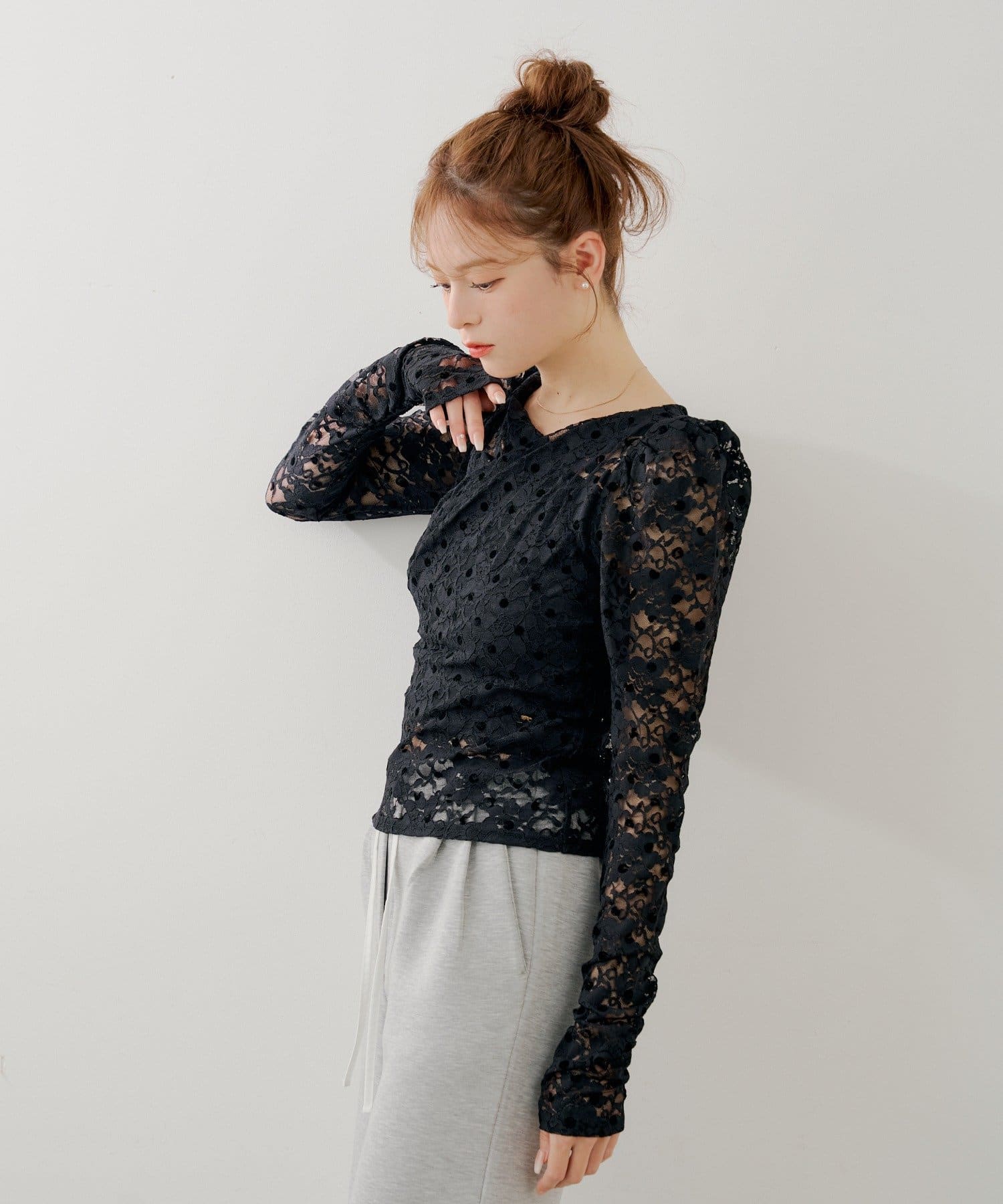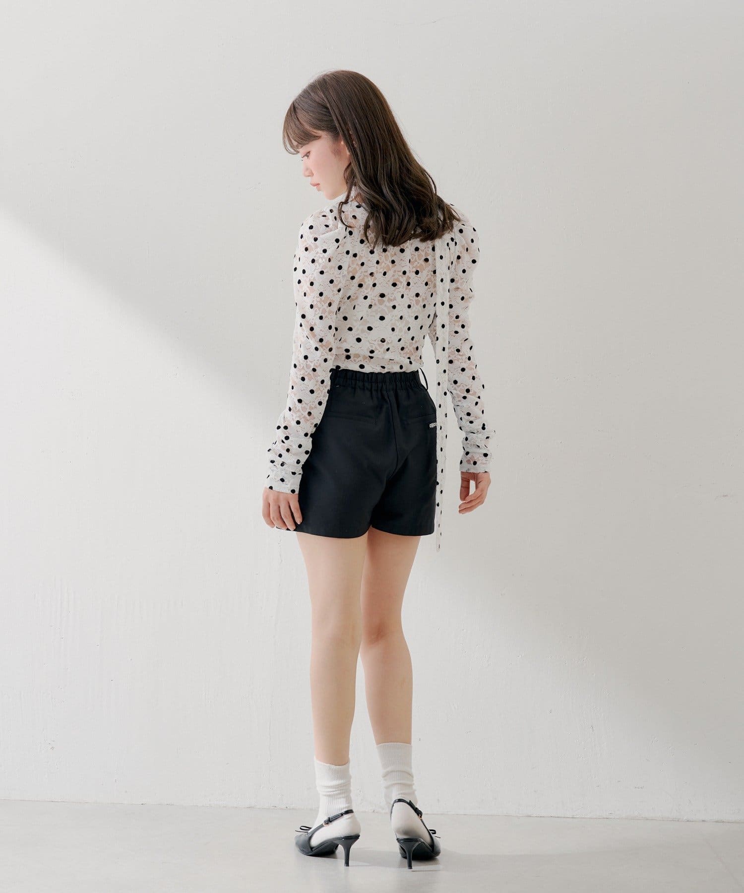 ・透け感のある軽やかなレースに、立体感のあるフロッキードットを重ねることで