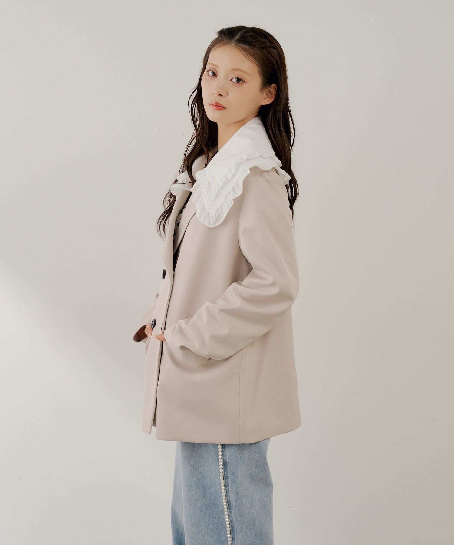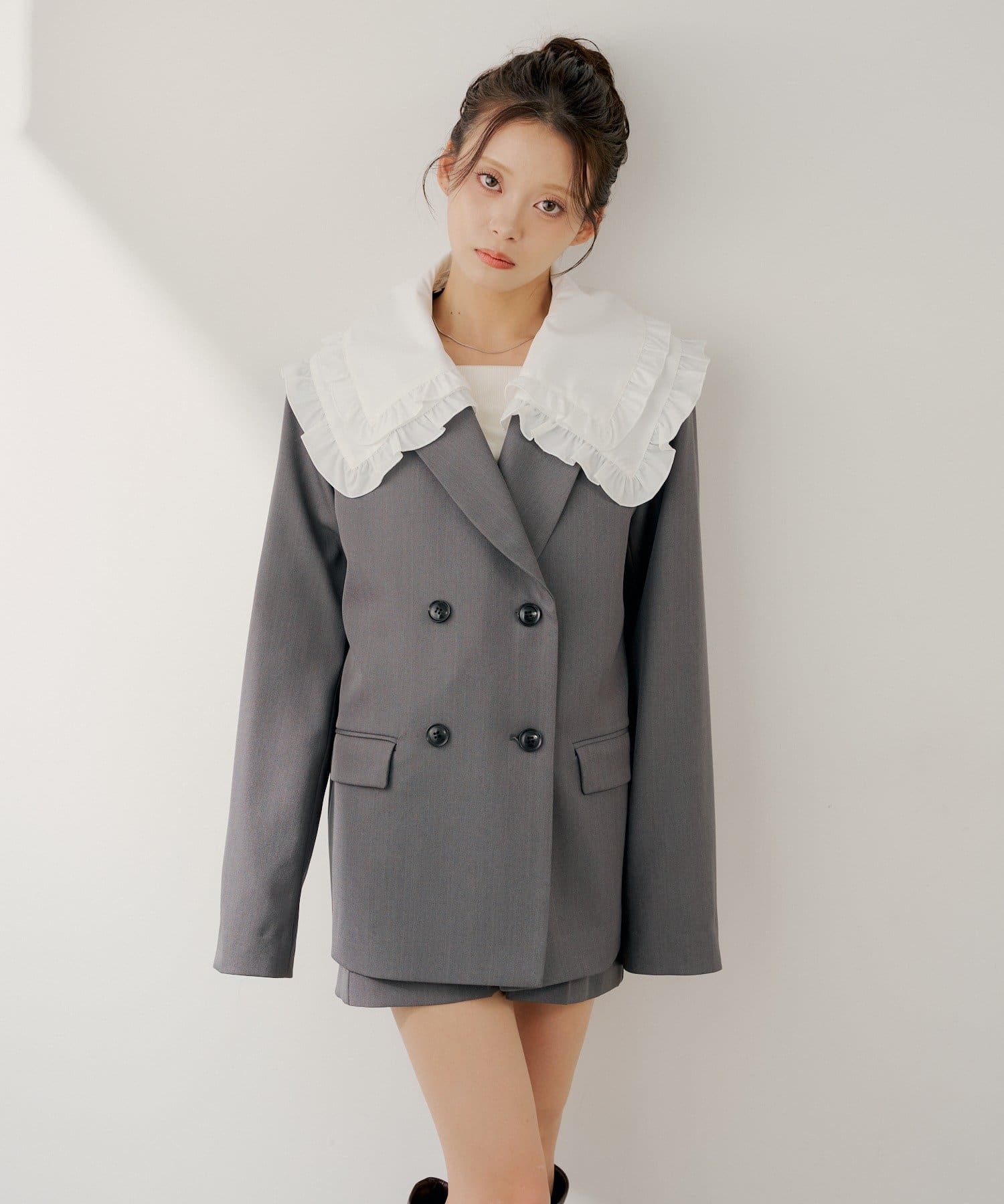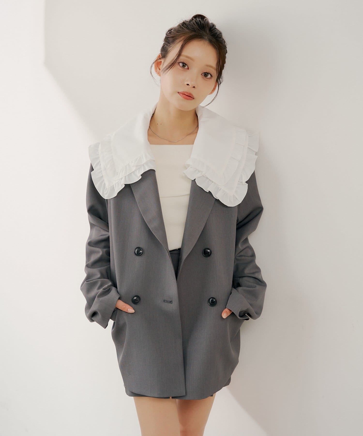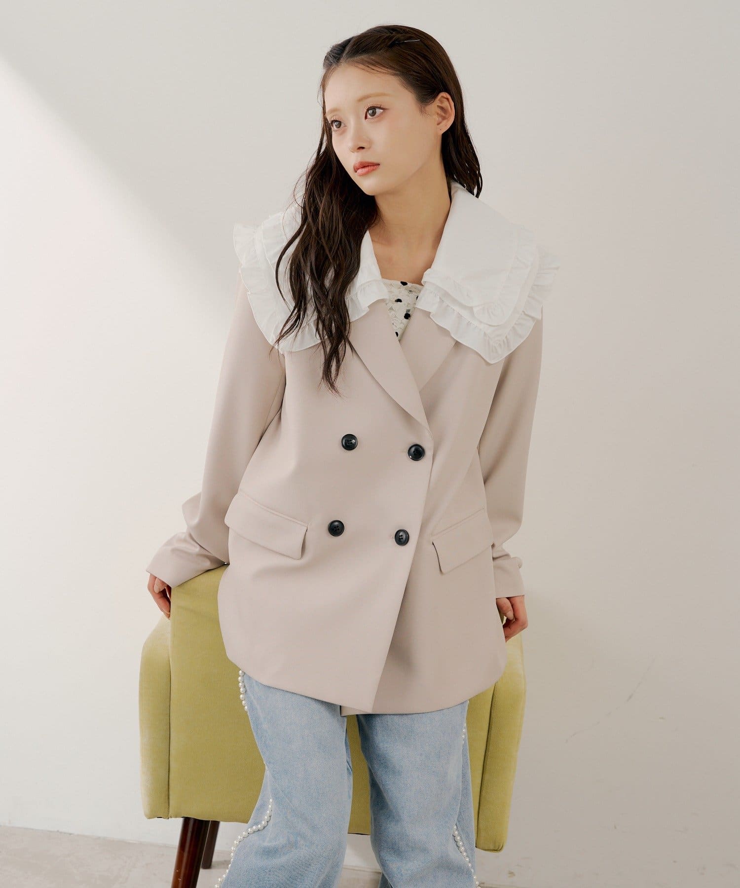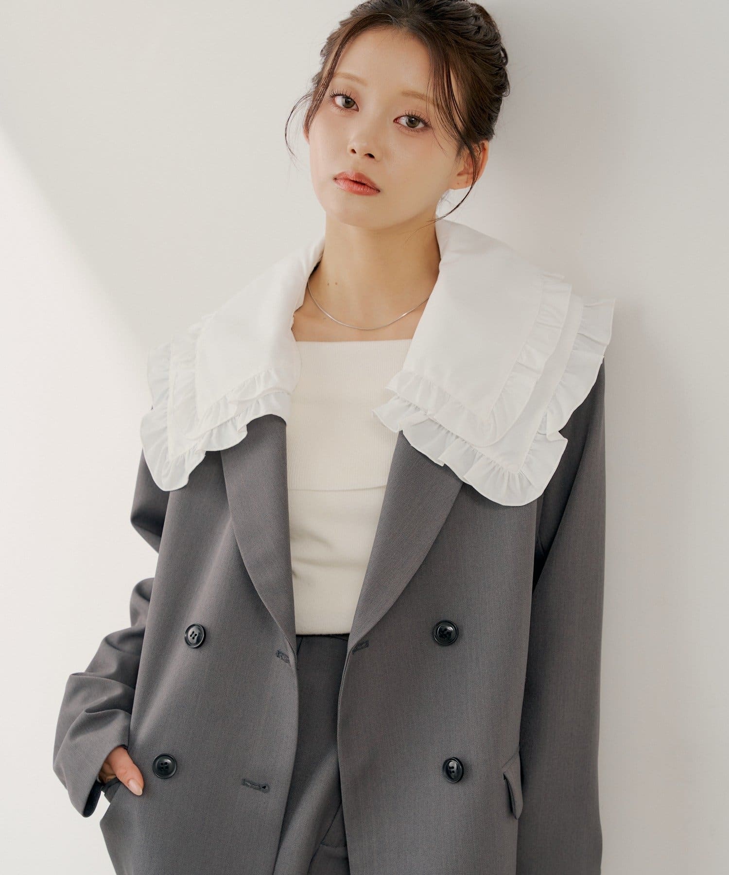 ・クラシカルなダブルブレストジャケットにフリル襟あしらったジャケット。