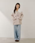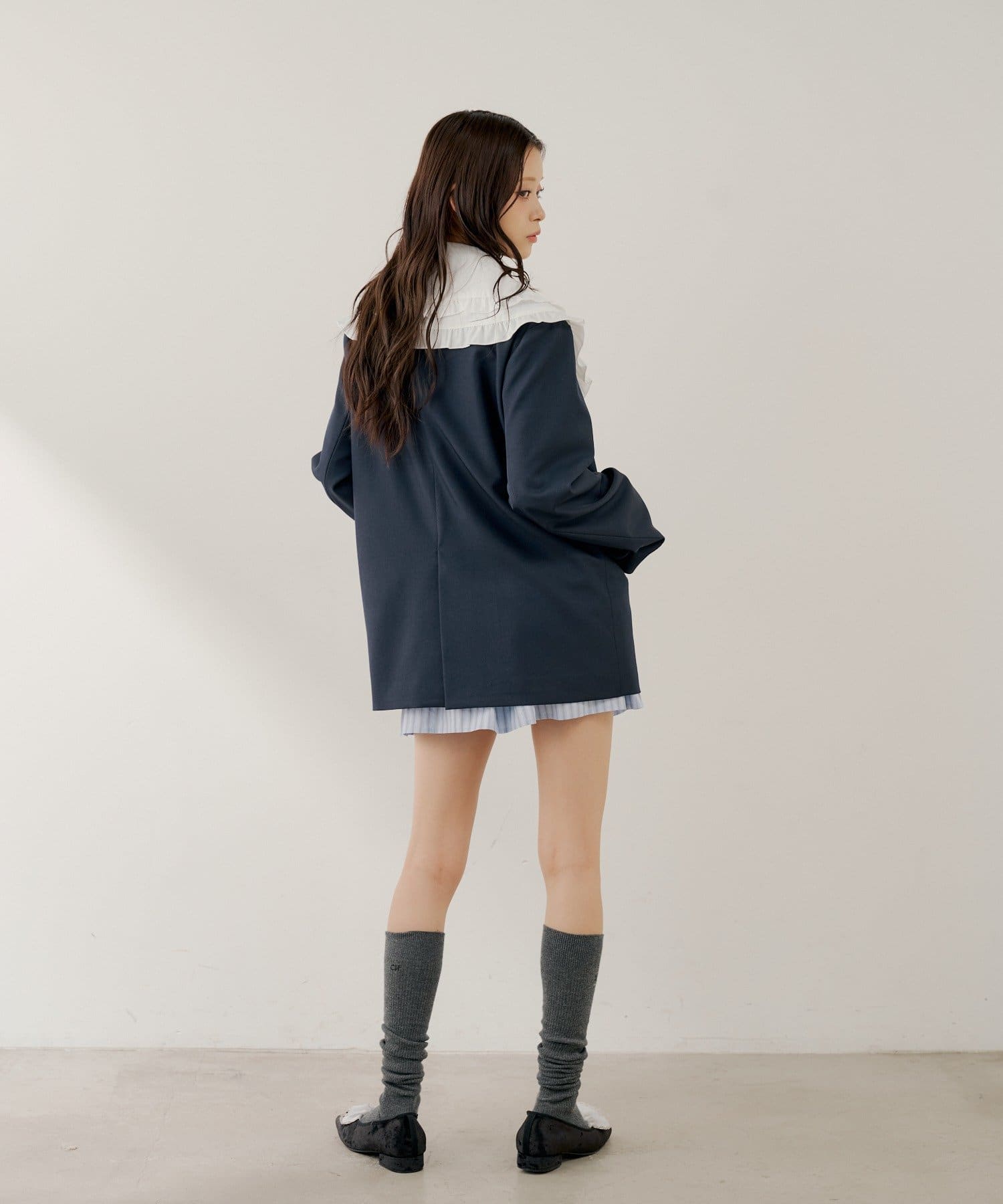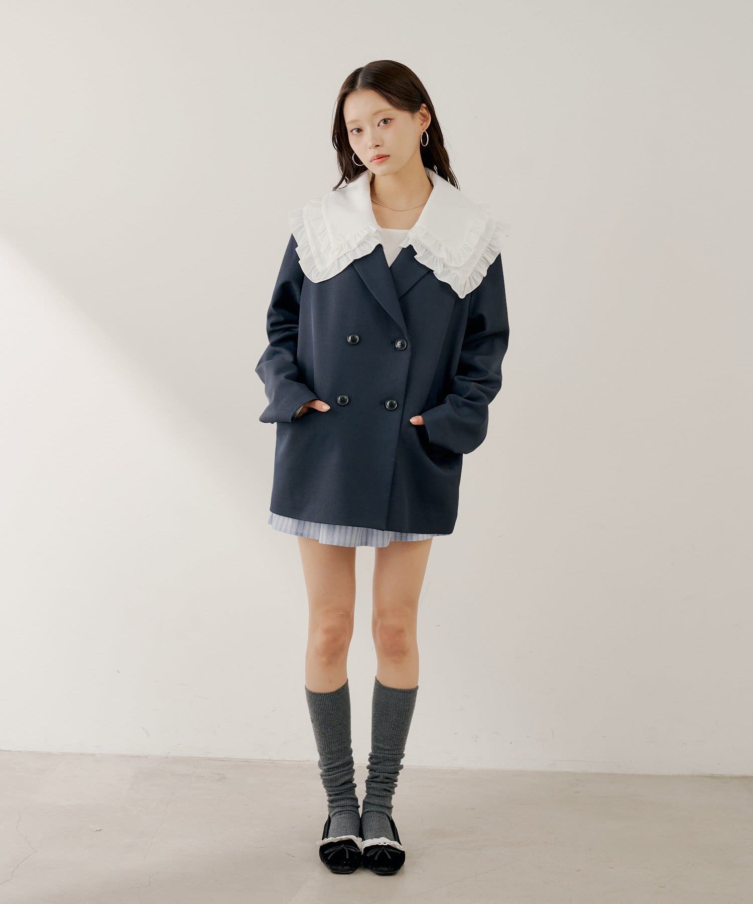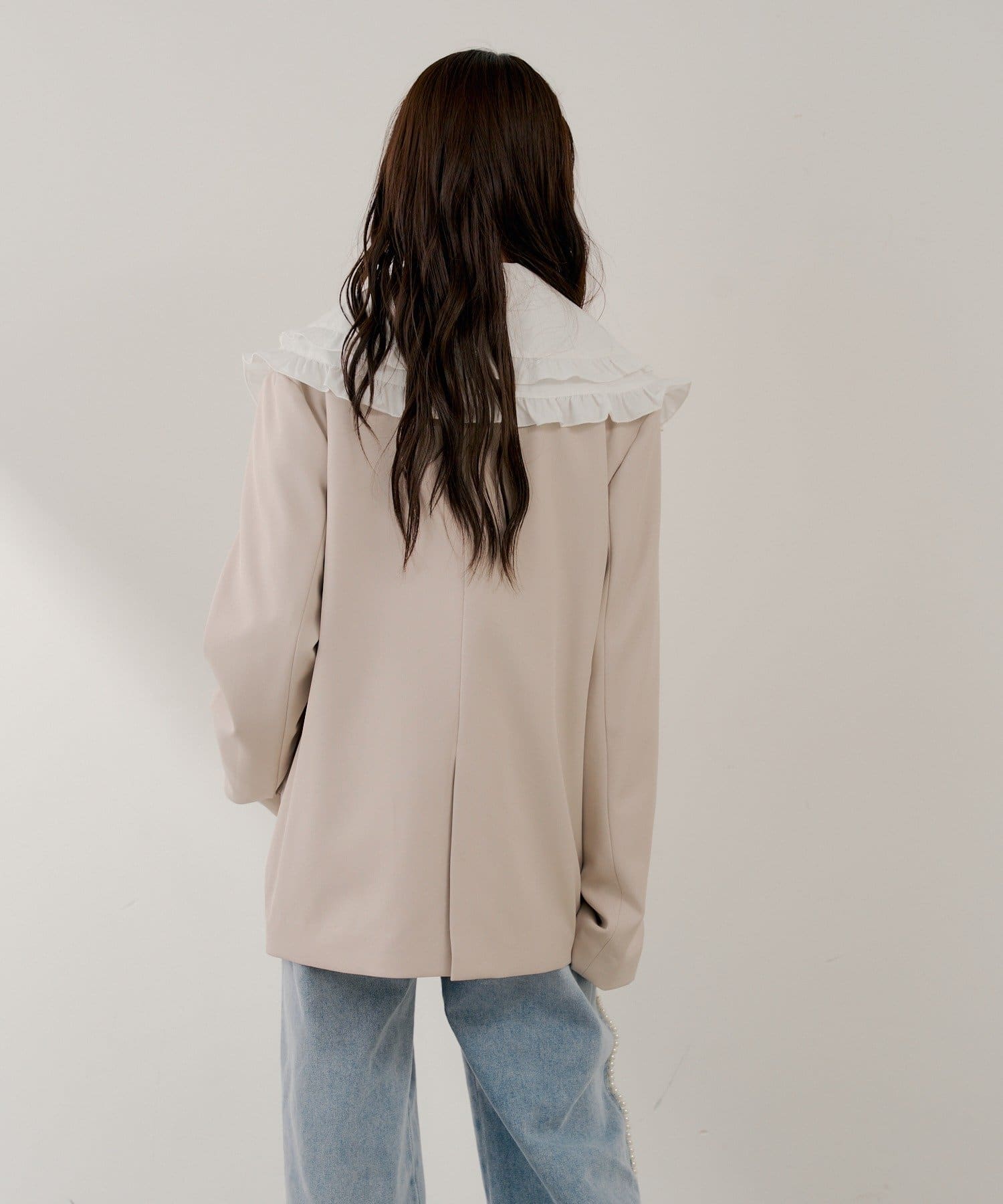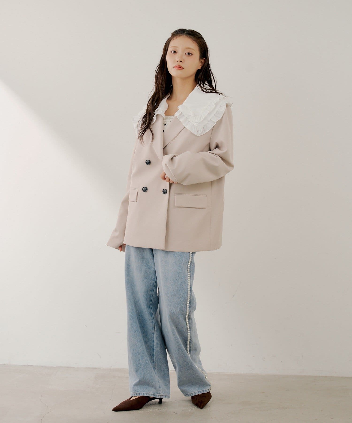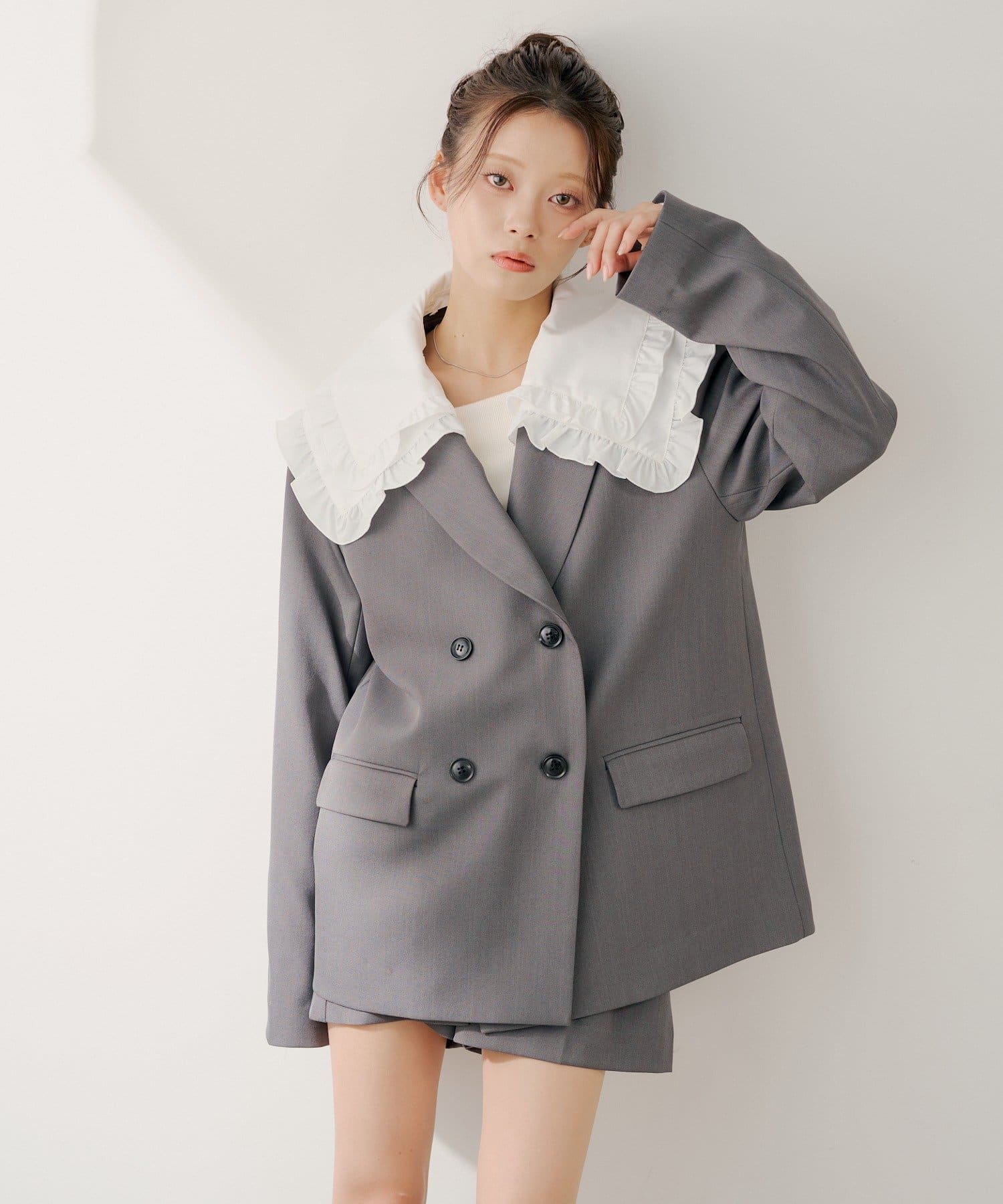 ・クラシカルなダブルブレストジャケットにフリル襟あしらったジャケット。