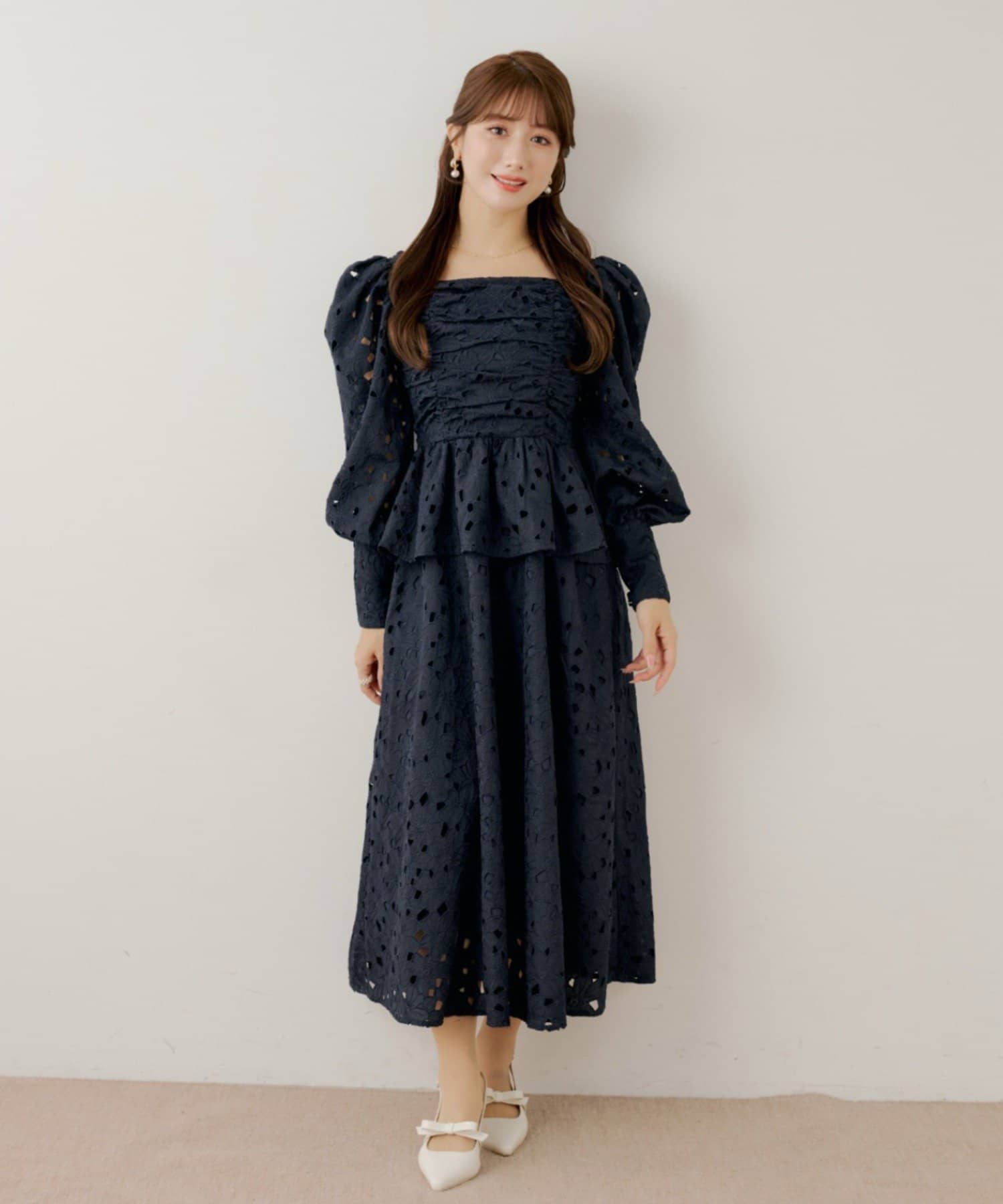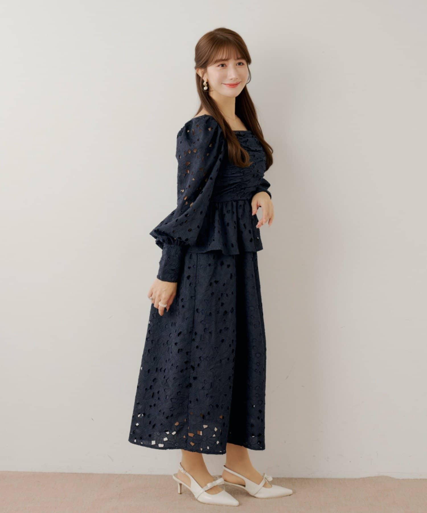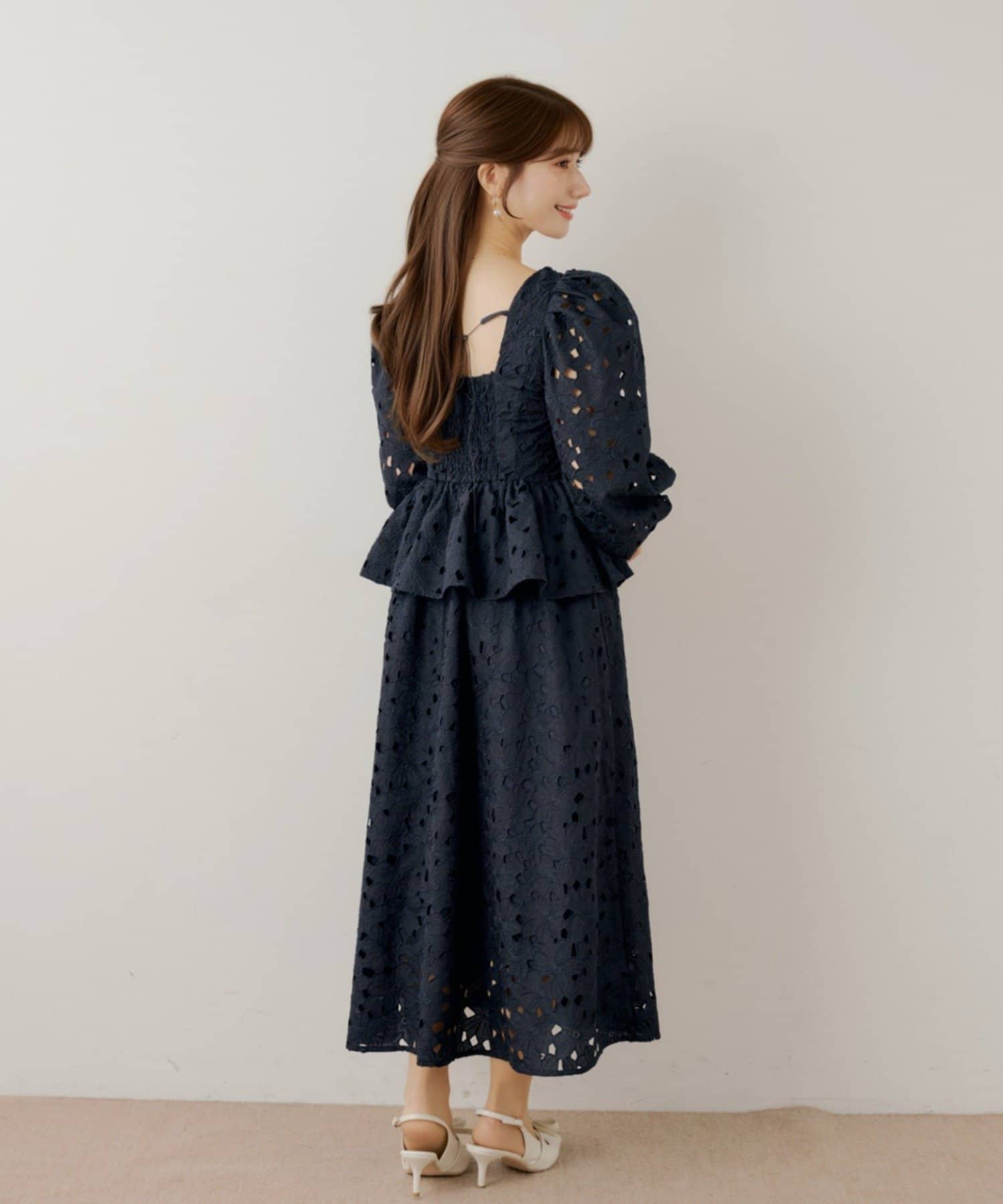 繊細なレースとフェミニンなシルエットが魅力のパワショルレースペプラムワンピース