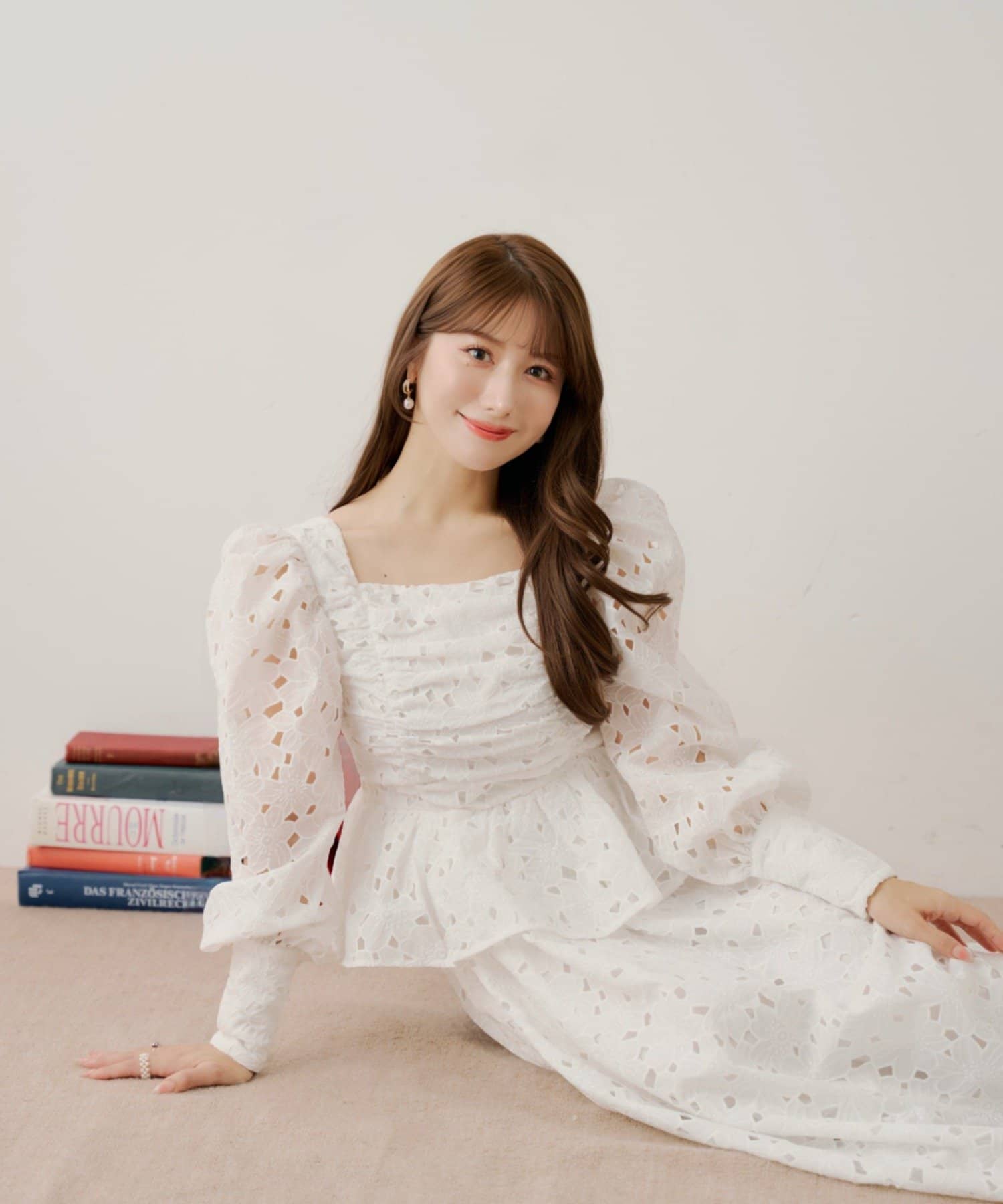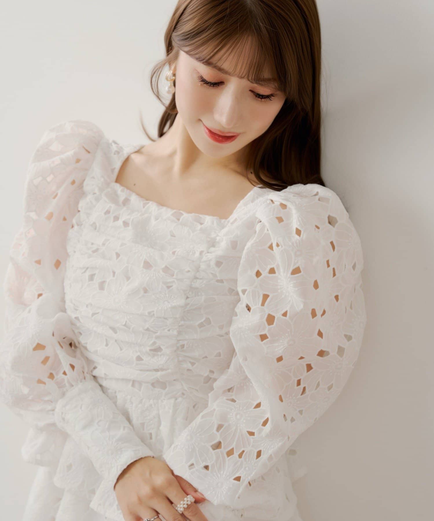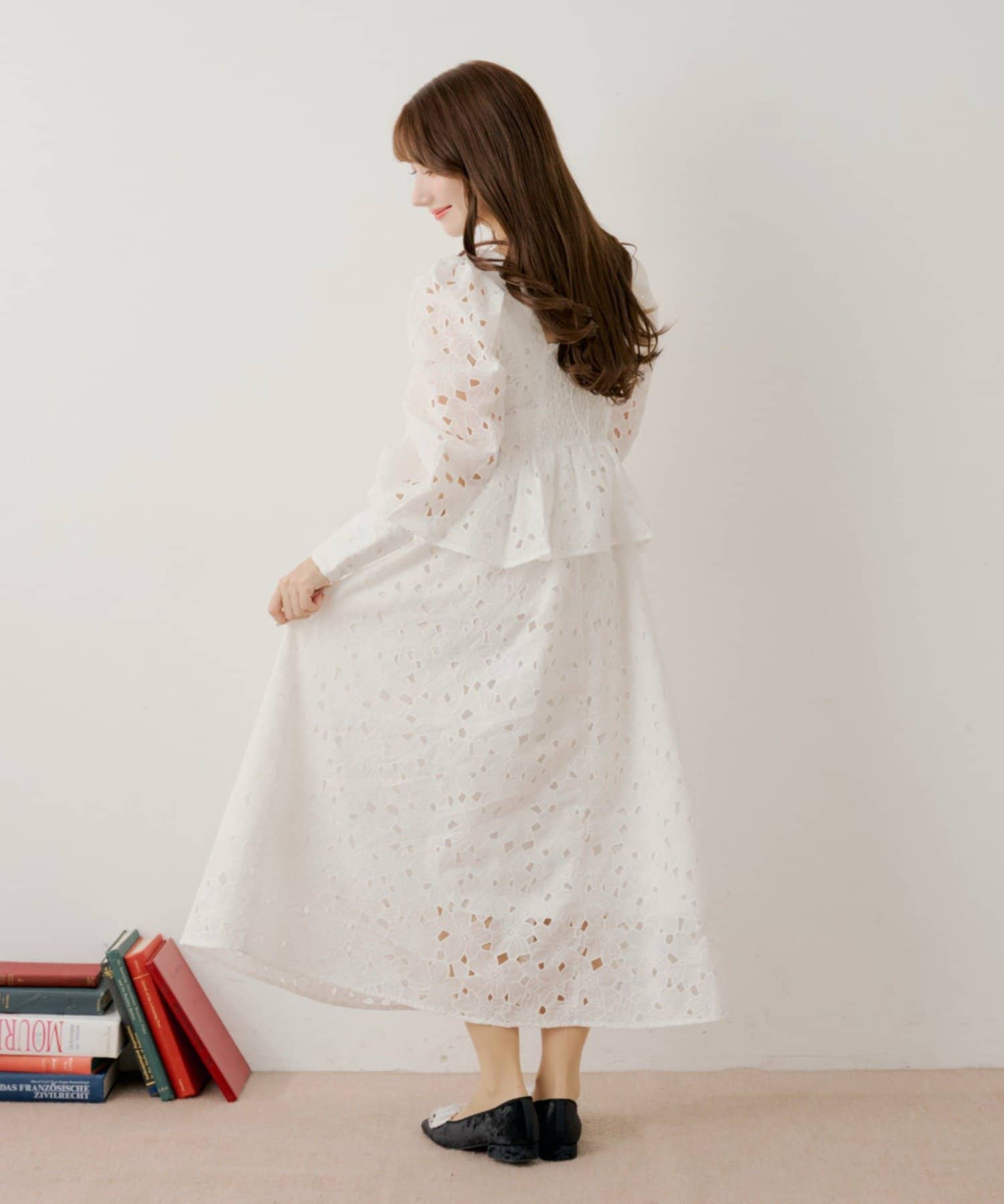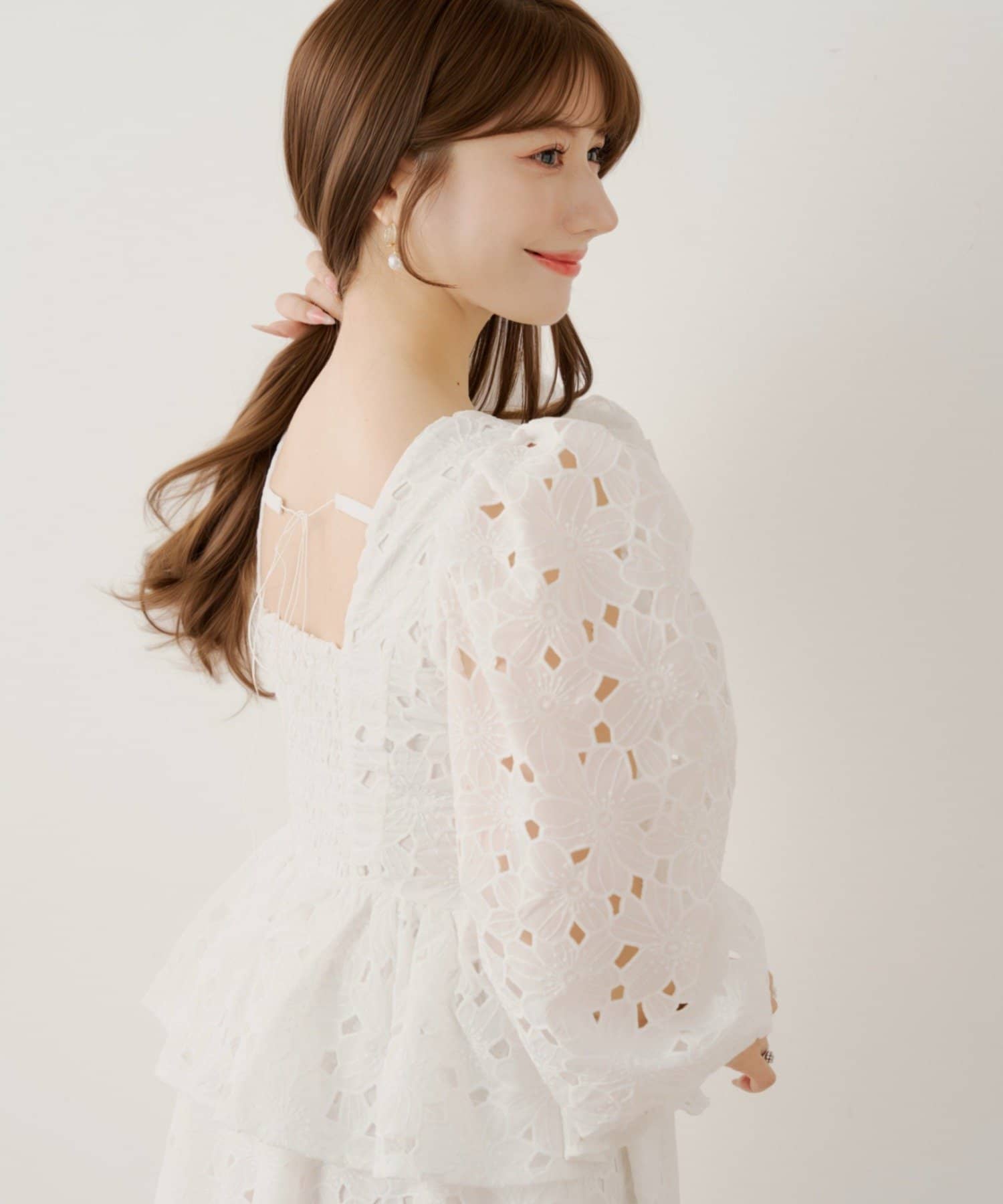 繊細なレースとフェミニンなシルエットが魅力のパワショルレースペプラムワンピース