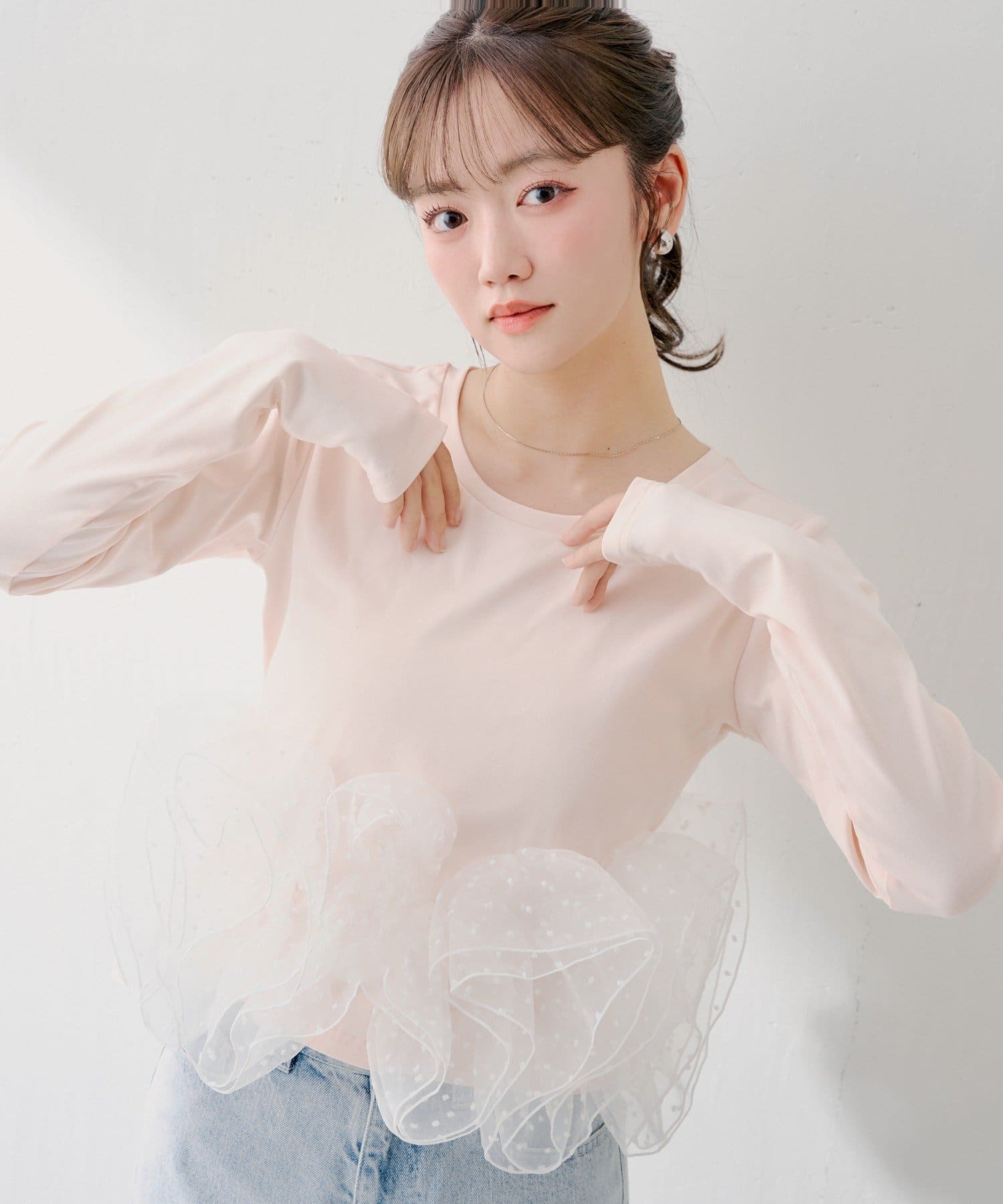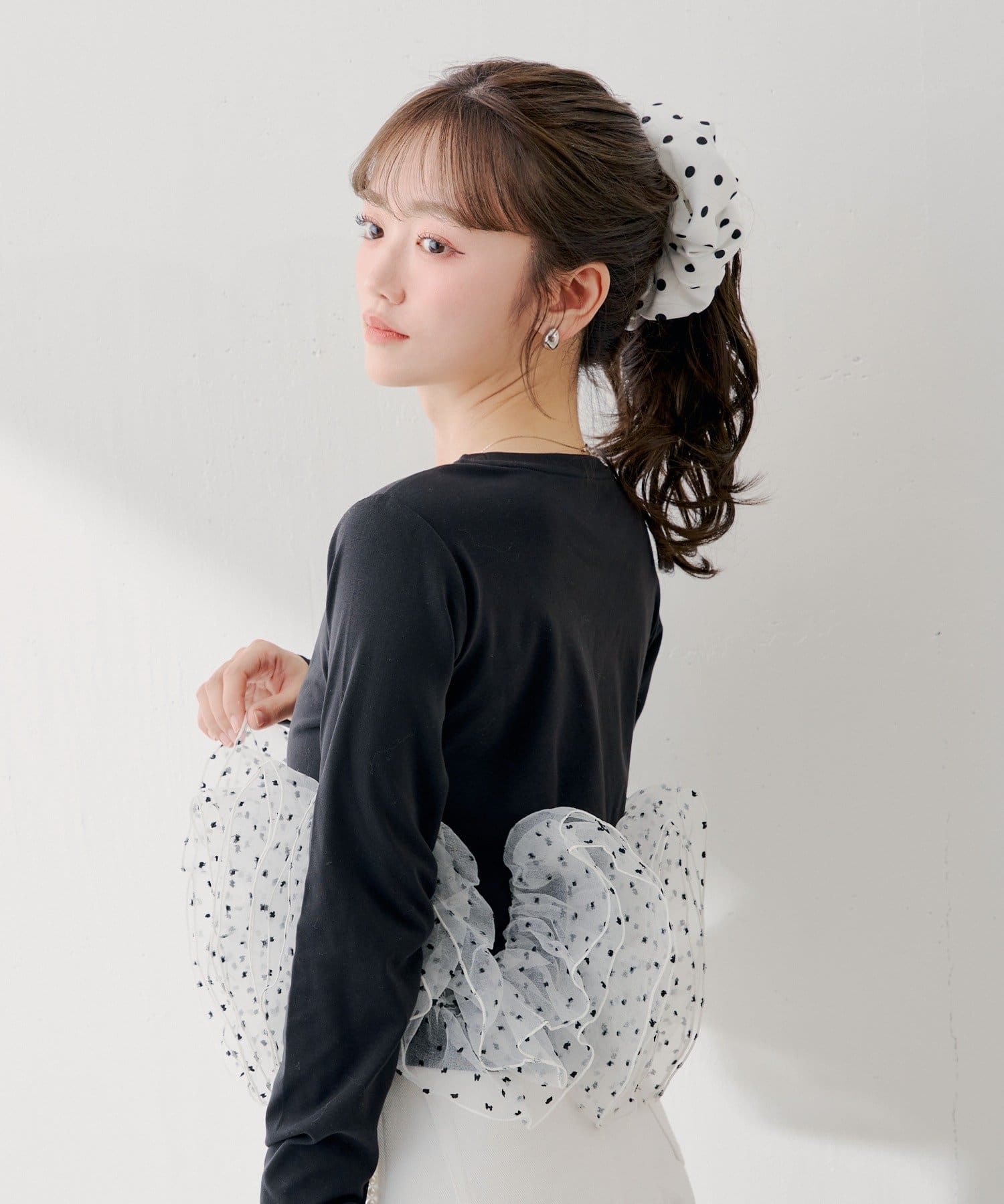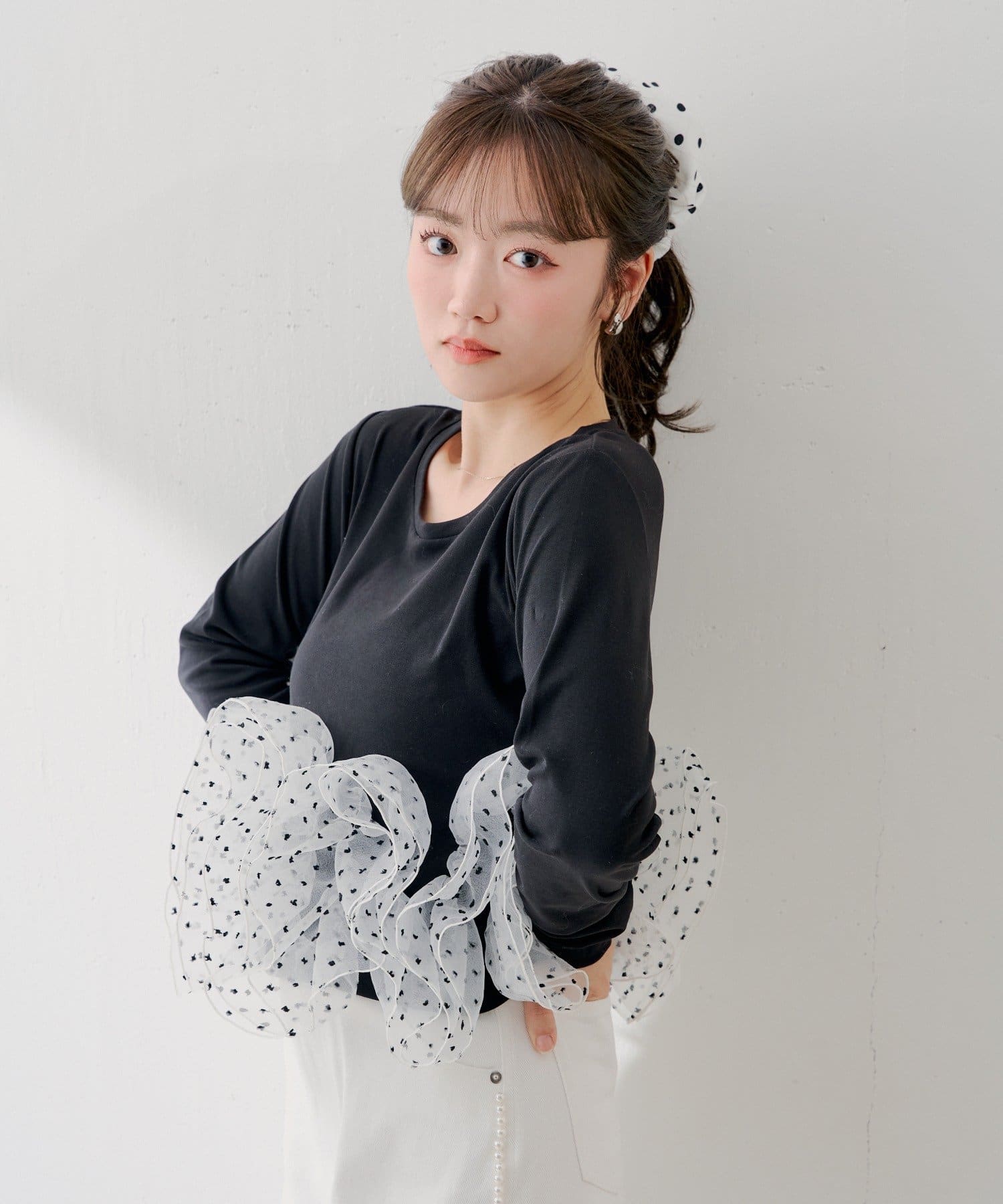 ・シンプルなカットソーに、ドット柄のチュールフリルを大胆にドッキングすることで