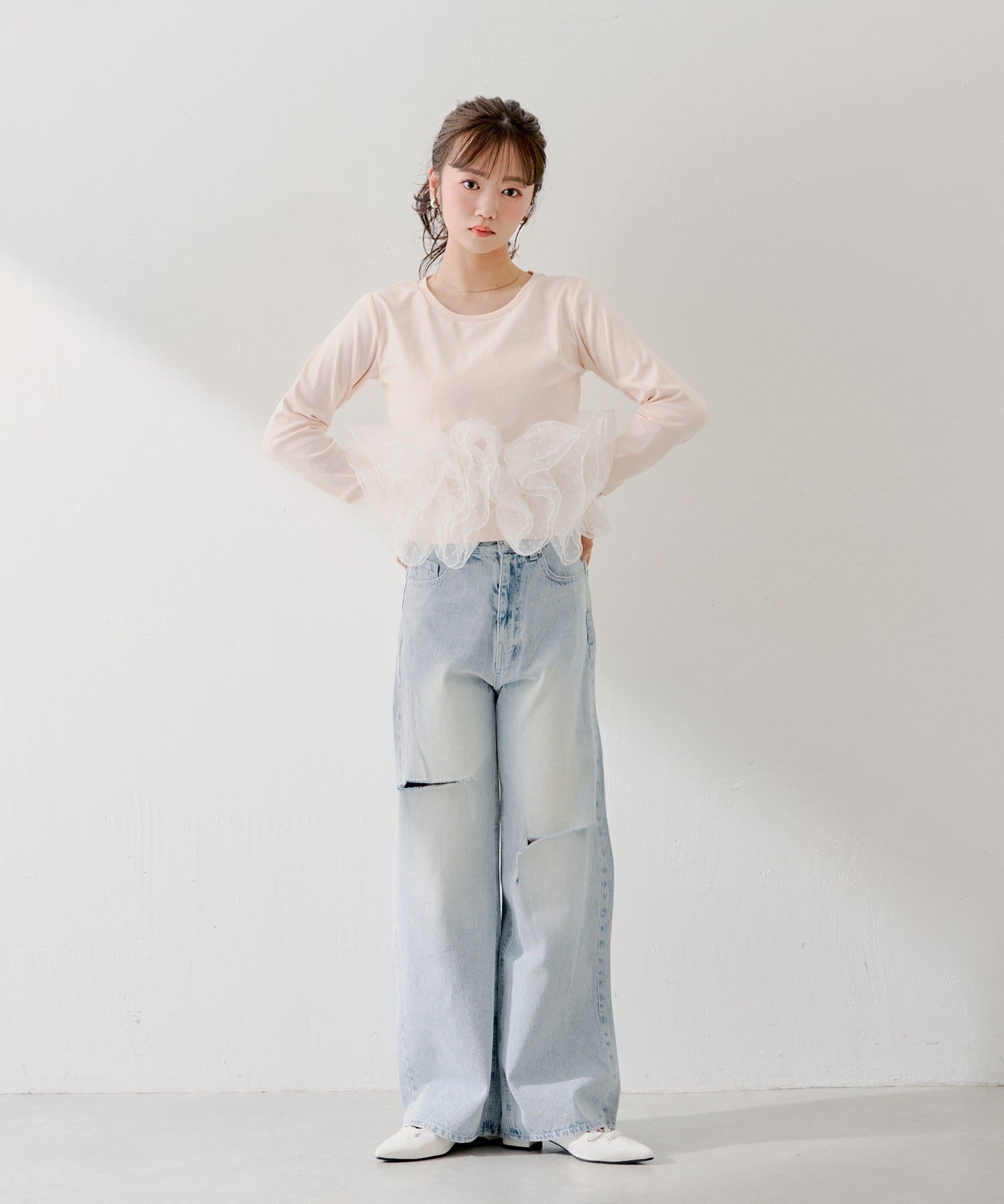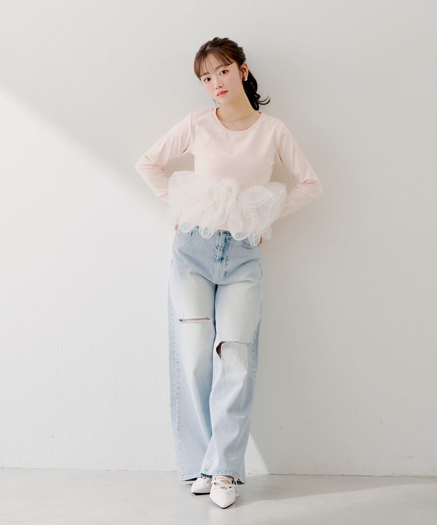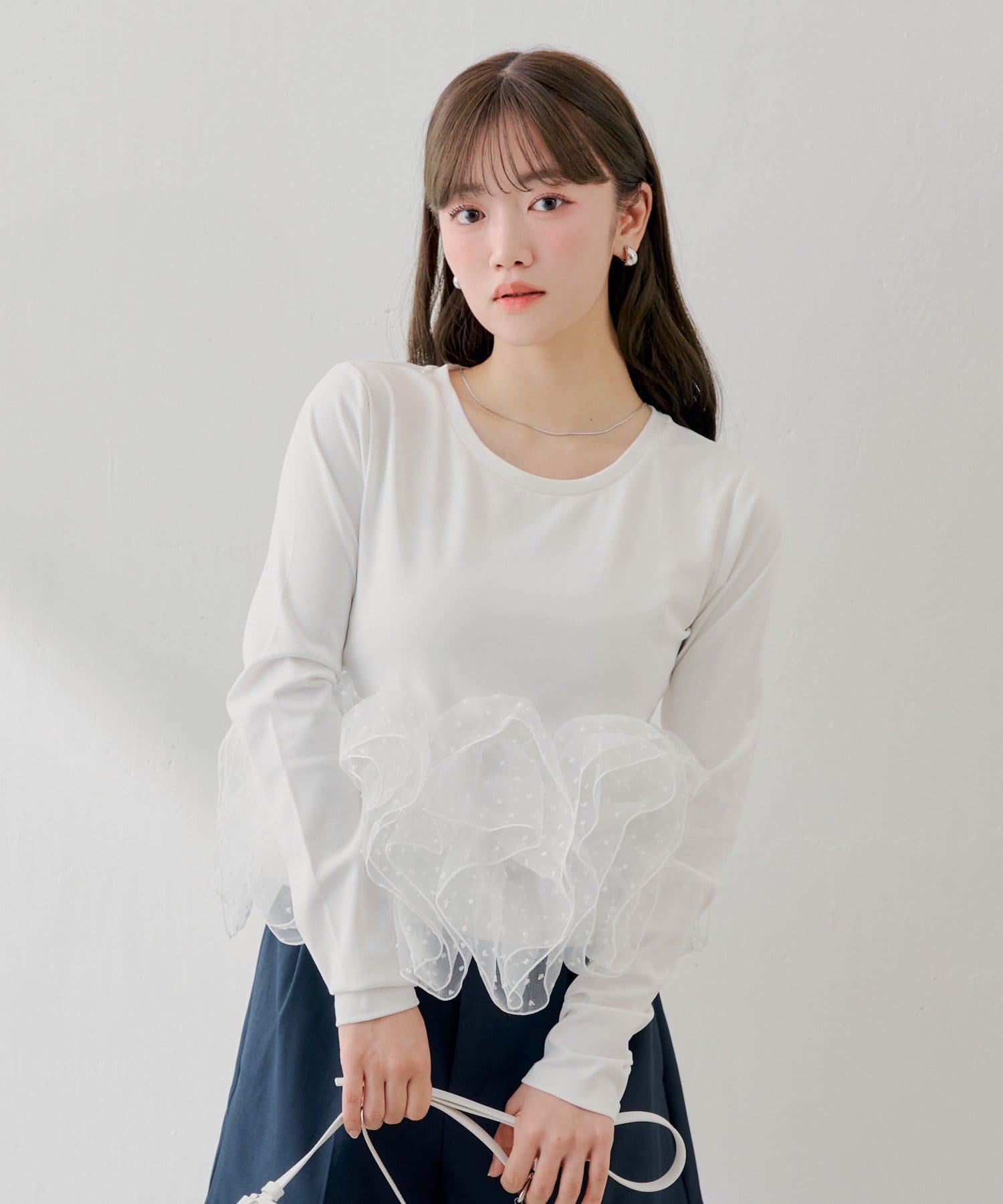 ・シンプルなカットソーに、ドット柄のチュールフリルを大胆にドッキングすることで