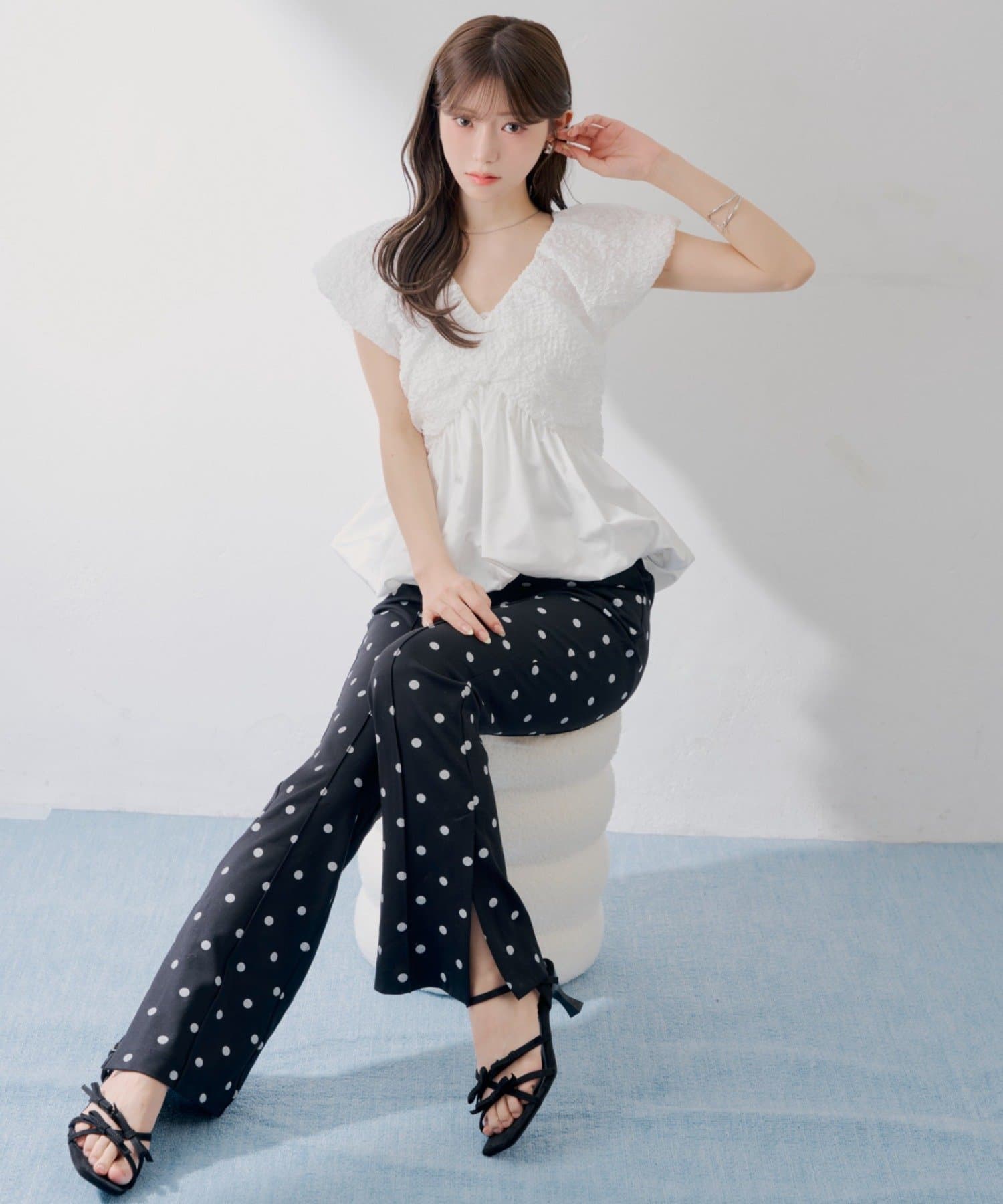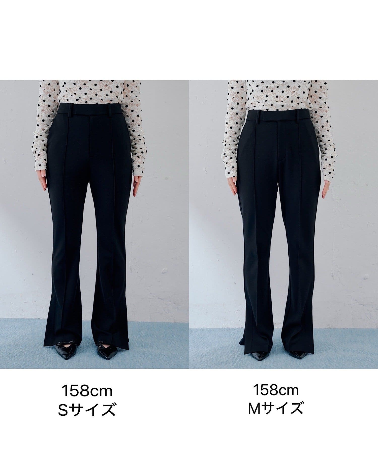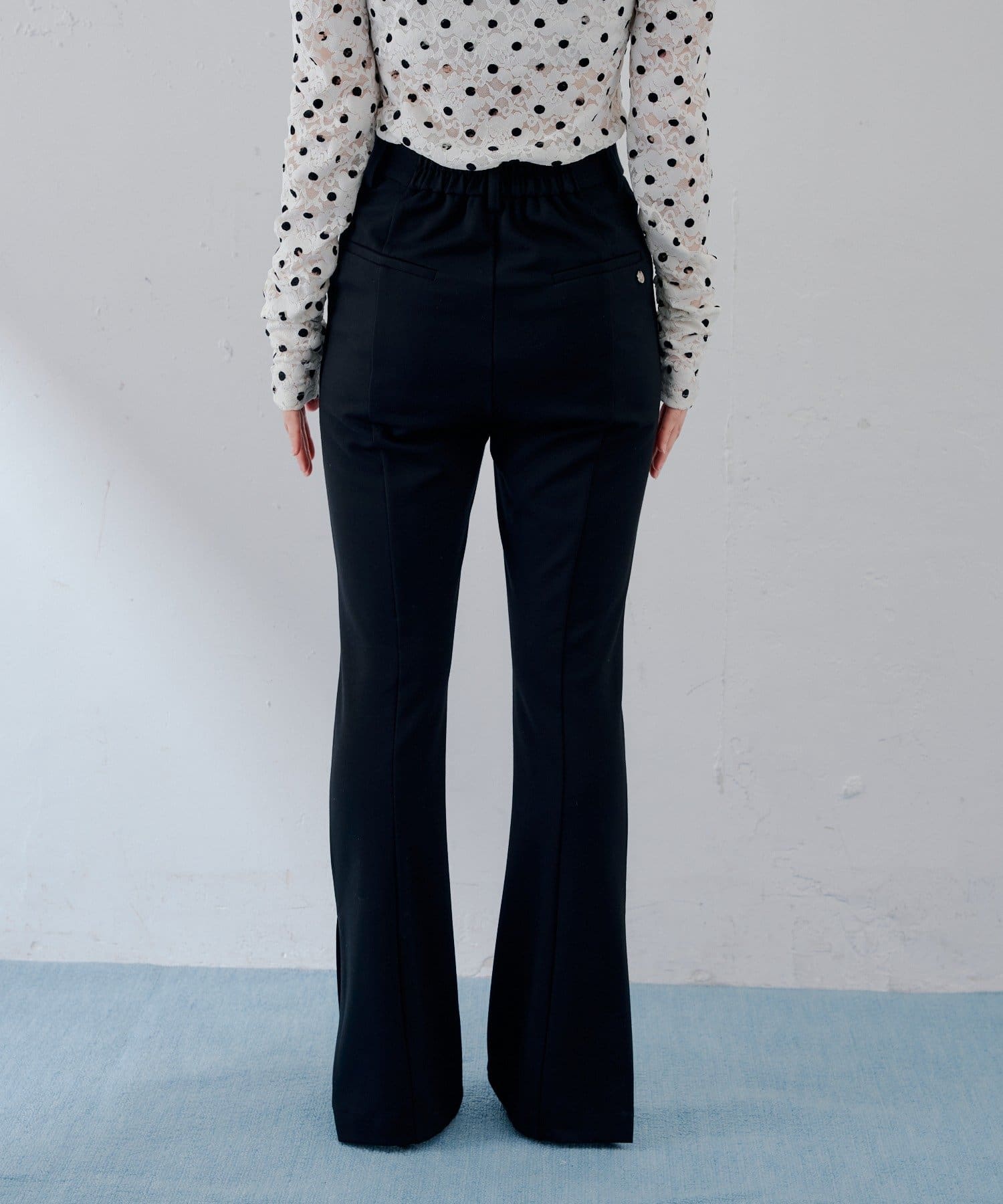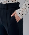 ・ハイウエスト設計で腰位置が高く見え、フロントのセンタープレスが縦ラインを強調して、上品な雰囲気をしっかりキープ。