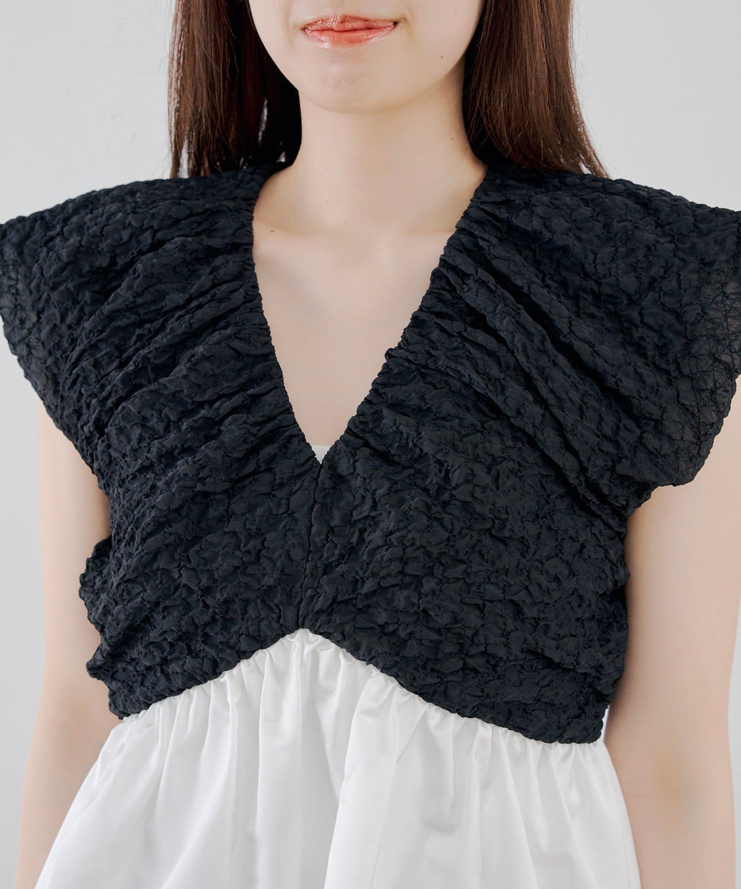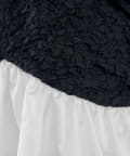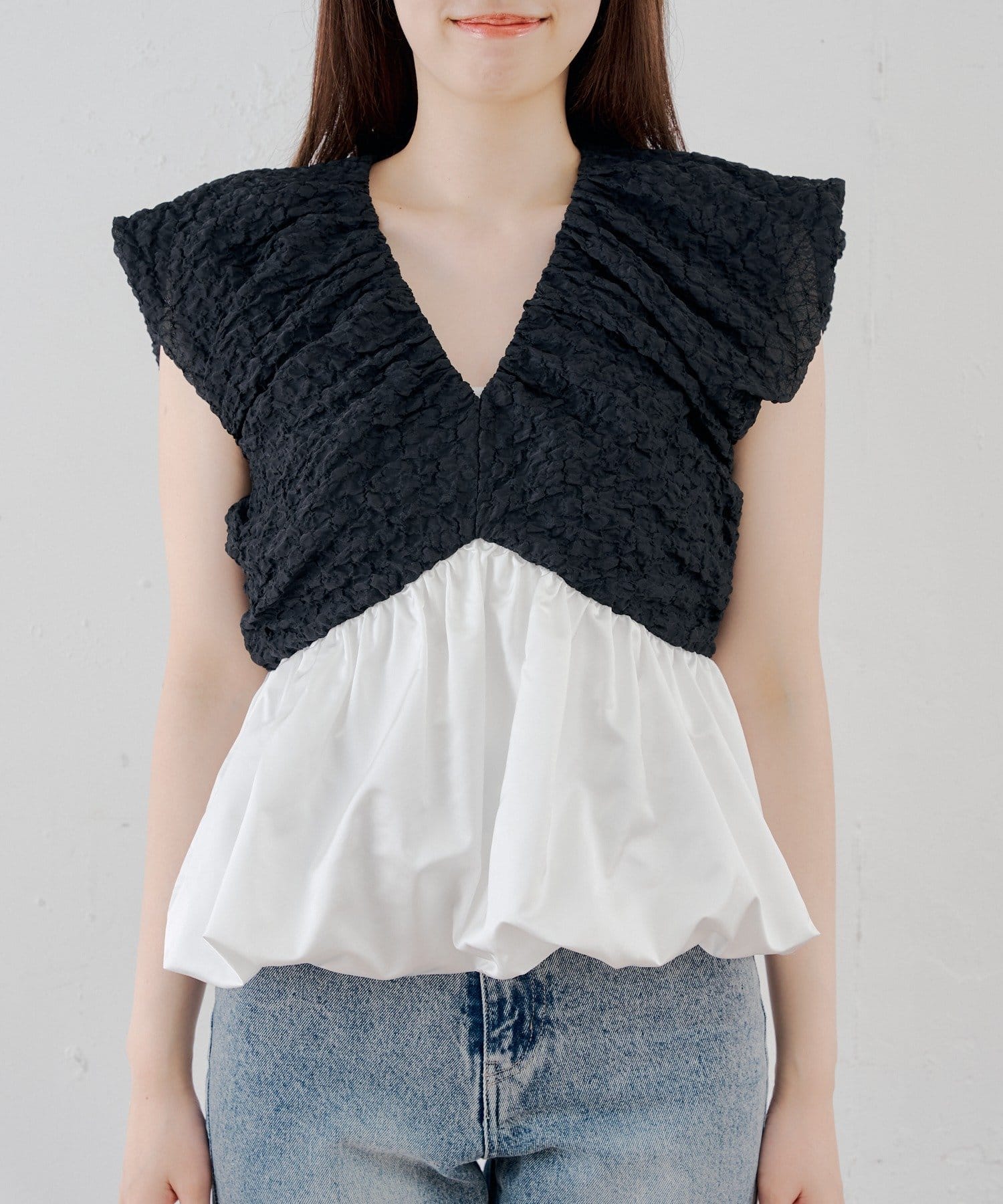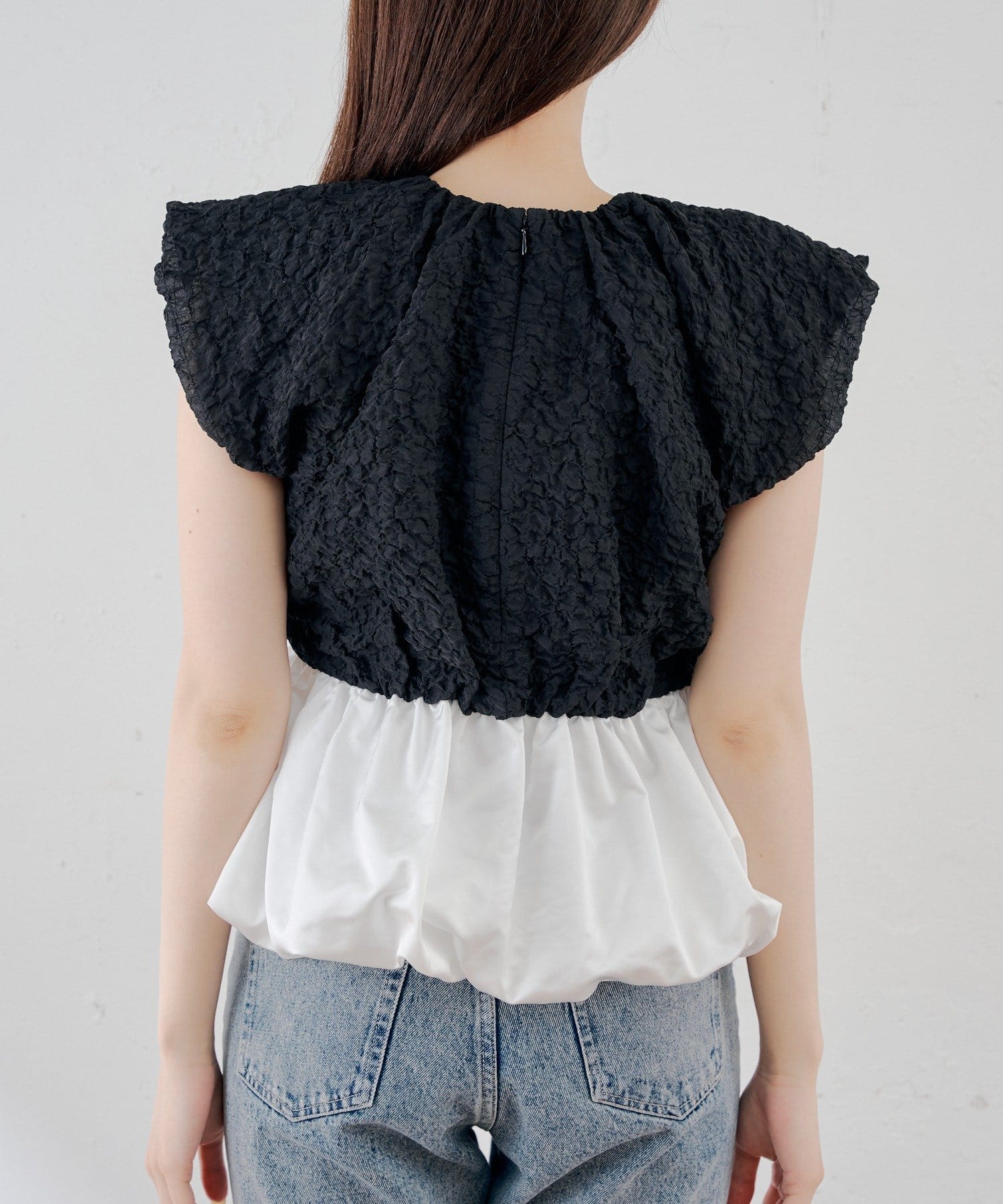 ・表情豊かなクラッシュ加工のブラック素材と、ふわっと広がるホワイトのバルーンシルエットを組み合わせた切り替えデザイントップス。